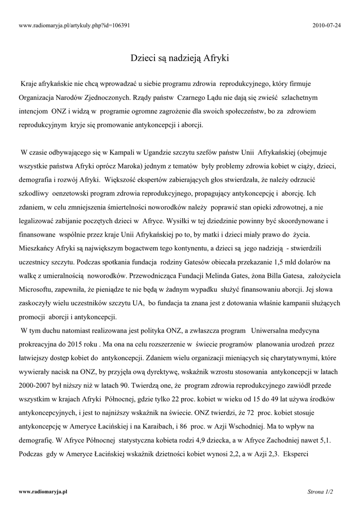www.radiomaryja.pl/artykuly.php?id=106391 2010-07-24 Dzieci są nadzieją Afryki Kraje afrykańskie nie chcą wprowadzać u siebie programu zdrowia reprodukcyjnego, który firmuje Organizacja Narodów Zjednoczonych. Rządy państw Czarnego Lądu nie dają się zwieść szlachetnym intencjom ONZ i widzą w programie ogromne zagrożenie dla swoich społeczeństw, bo za zdrowiem reprodukcyjnym kryje się promowanie antykoncepcji i aborcji. W czasie odbywającego się w Kampali w Ugandzie szczytu szefów państw Unii Afrykańskiej (obejmuje wszystkie państwa Afryki oprócz Maroka) jednym z tematów były problemy zdrowia kobiet w ciąży, dzieci, demografia i rozwój Afryki. Większość ekspertów zabierających głos stwierdzała, że należy odrzucić szkodliwy oenzetowski program zdrowia reprodukcyjnego, propagujący antykoncepcję i aborcję. Ich zdaniem, w celu zmniejszenia śmiertelności noworodków należy poprawić stan opieki zdrowotnej, a nie legalizować zabijanie poczętych dzieci w Afryce. Wysiłki w tej dziedzinie powinny być skoordynowane i finansowane wspólnie przez kraje Unii Afrykańskiej po to, by matki i dzieci miały prawo do życia. Mieszkańcy Afryki są największym bogactwem tego kontynentu, a dzieci są jego nadzieją - stwierdzili uczestnicy szczytu. Podczas spotkania fundacja rodziny Gatesów obiecała przekazanie 1,5 mld dolarów na walkę z umieralnością noworodków. Przewodnicząca Fundacji Melinda Gates, żona Billa Gatesa, założyciela Microsoftu, zapewniła, że pieniądze te nie będą w żadnym wypadku służyć finansowaniu aborcji. Jej słowa zaskoczyły wielu uczestników szczytu UA, bo fundacja ta znana jest z dotowania właśnie kampanii służących promocji aborcji i antykoncepcji. W tym duchu natomiast realizowana jest polityka ONZ, a zwłaszcza program Uniwersalna medycyna prokreacyjna do 2015 roku . Ma ona na celu rozszerzenie w świecie programów planowania urodzeń przez łatwiejszy dostęp kobiet do antykoncepcji. Zdaniem wielu organizacji mieniących się charytatywnymi, które wywierały nacisk na ONZ, by przyjęła ową dyrektywę, wskaźnik wzrostu stosowania antykoncepcji w latach 2000-2007 był niższy niż w latach 90. Twierdzą one, że program zdrowia reprodukcyjnego zawiódł przede wszystkim w krajach Afryki Północnej, gdzie tylko 22 proc. kobiet w wieku od 15 do 49 lat używa środków antykoncepcyjnych, i jest to najniższy wskaźnik na świecie. ONZ twierdzi, że 72 proc. kobiet stosuje antykoncepcję w Ameryce Łacińskiej i na Karaibach, i 86 proc. w Azji Wschodniej. Ma to wpływ na demografię. W Afryce Północnej statystyczna kobieta rodzi 4,9 dziecka, a w Afryce Zachodniej nawet 5,1. Podczas gdy w Ameryce Łacińskiej wskaźnik dzietności kobiet wynosi 2,2, a w Azji 2,3. Eksperci www.radiomaryja.pl Strona 1/2 oenzetowscy niepokoją się tym, że w Afryce nie następuje zmiana mentalności: dziewczęta w wieku od 15 do 19 lat chcą mieć tyle samo dzieci, co ich matki. - Jeżeli tak dalej pójdzie, to w 2050 r. Afryka będzie mieć 2 miliardy mieszkańców - uważa demograf Jean-Pierre Guengant. Aktywiści szerzenia antykoncepcji i aborcji twierdzą, że ich małe sukcesy w Afryce wynikają ze spadku o 5 proc. funduszów na ich akcje w latach 2000-2008 i polityki rządów afrykańskich, które nie popierają programów ograniczania urodzeń, twierdząc zresztą słusznie, że metodą walki z biedą jest rozwój gospodarczy, a nie aborcja. Prezydent George Bush wstrzymał finansowanie przez USA akcji propagowania antykoncepcji i aborcji, ale administracja Baracka Obamy odblokowała te fundusze i w ciągu dwóch lat na ten cel zostanie wydane 1,3 mld dolarów. Francuski dziennik Le Monde poinformował, że w ONZ powołano do życia nową agencję, która zostanie wyposażona w budżet ponad 500 mln dolarów, ale aktywiści planowania narodzin twierdzą, że jest to niewystarczające. Daniela Rosche z organizacji charytatywnej ONG Oxfam powołuje się na opinię Banku Światowego, według którego wprowadzenie w życie idei tzw. równości płci i autonomii kobiet wymaga wydatków na poziomie od 60 do 80 mld dolarów rocznie. Franciszek L. Ćwik www.radiomaryja.pl Strona 2/2