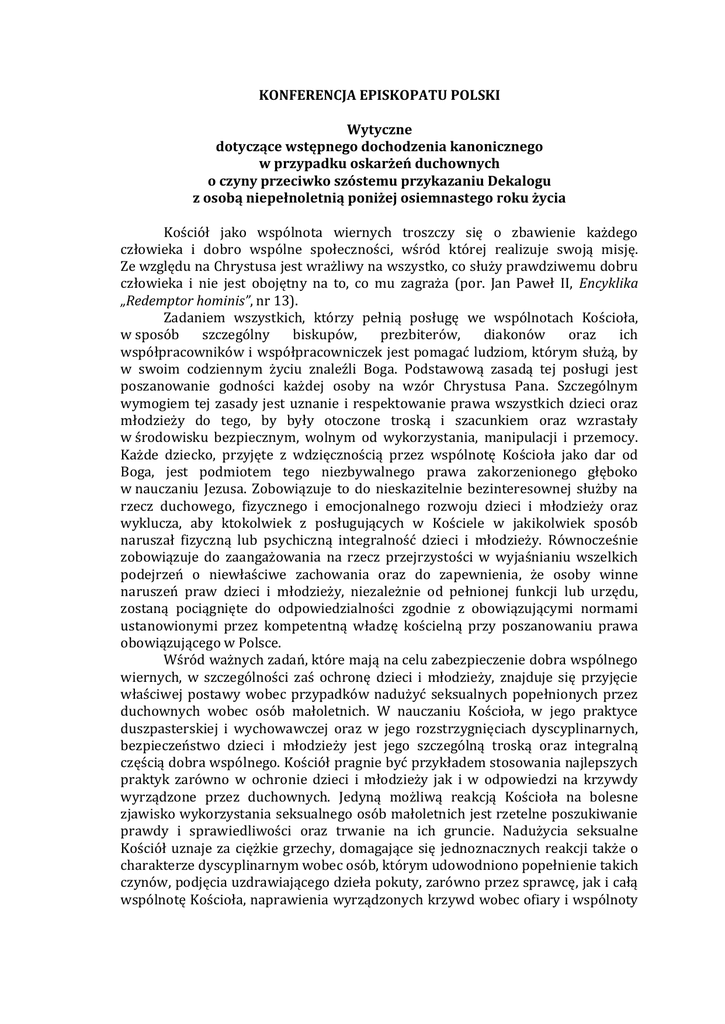 KONFERENCJA EPISKOPATU POLSKI Wytyczne dotyczące wstępnego dochodzenia kanonicznego w przypadku oskarżeń duchownych o czyny przeciwko szóstemu przykazaniu Dekalogu z osobą niepełnoletnią poniżej osiemnastego roku życia Kościół jako wspólnota wiernych troszczy się o zbawienie każdego człowieka i dobro wspólne społeczności, wśród której realizuje swoją misję. Ze względu na Chrystusa jest wrażliwy na wszystko, co służy prawdziwemu dobru człowieka i nie jest obojętny na to, co mu zagraża (por. Jan Paweł II, Encyklika „Redemptor hominis”, nr 13). Zadaniem wszystkich, którzy pełnią posługę we wspólnotach Kościoła, w sposób szczególny biskupów, prezbiterów, diakonów oraz ich współpracowników i współpracowniczek jest pomagać ludziom, którym służą, by w swoim codziennym życiu znaleźli Boga. Podstawową zasadą tej posługi jest poszanowanie godności każdej osoby na wzór Chrystusa Pana. Szczególnym wymogiem tej zasady jest uznanie i respektowanie prawa wszystkich dzieci oraz młodzieży do tego, by były otoczone troską i szacunkiem oraz wzrastały w środowisku bezpiecznym, wolnym od wykorzystania, manipulacji i przemocy. Każde dziecko, przyjęte z wdzięcznością przez wspólnotę Kościoła jako dar od Boga, jest podmiotem tego niezbywalnego prawa zakorzenionego głęboko w nauczaniu Jezusa. Zobowiązuje to do nieskazitelnie bezinteresownej służby na rzecz duchowego, fizycznego i emocjonalnego rozwoju dzieci i młodzieży oraz wyklucza, aby ktokolwiek z posługujących w Kościele w jakikolwiek sposób naruszał fizyczną lub psychiczną integralność dzieci i młodzieży. Równocześnie zobowiązuje do zaangażowania na rzecz przejrzystości w wyjaśnianiu wszelkich podejrzeń o niewłaściwe zachowania oraz do zapewnienia, że osoby winne naruszeń praw dzieci i młodzieży, niezależnie od pełnionej funkcji lub urzędu, zostaną pociągnięte do odpowiedzialności zgodnie z obowiązującymi normami ustanowionymi przez kompetentną władzę kościelną przy poszanowaniu prawa obowiązującego w Polsce. Wśród ważnych zadań, które mają na celu zabezpieczenie dobra wspólnego wiernych, w szczególności zaś ochronę dzieci i młodzieży, znajduje się przyjęcie właściwej postawy wobec przypadków nadużyć seksualnych popełnionych przez duchownych wobec osób małoletnich. W nauczaniu Kościoła, w jego praktyce duszpasterskiej i wychowawczej oraz w jego rozstrzygnięciach dyscyplinarnych, bezpieczeństwo dzieci i młodzieży jest jego szczególną troską oraz integralną częścią dobra wspólnego. Kościół pragnie być przykładem stosowania najlepszych praktyk zarówno w ochronie dzieci i młodzieży jak i w odpowiedzi na krzywdy wyrządzone przez duchownych. Jedyną możliwą reakcją Kościoła na bolesne zjawisko wykorzystania seksualnego osób małoletnich jest rzetelne poszukiwanie prawdy i sprawiedliwości oraz trwanie na ich gruncie. Nadużycia seksualne Kościół uznaje za ciężkie grzechy, domagające się jednoznacznych reakcji także o charakterze dyscyplinarnym wobec osób, którym udowodniono popełnienie takich czynów, podjęcia uzdrawiającego dzieła pokuty, zarówno przez sprawcę, jak i całą wspólnotę Kościoła, naprawienia wyrządzonych krzywd wobec ofiary i wspólnoty oraz dołożenia wszelkich starań, aby podobne sytuacje nie miały miejsca w przyszłości. Oskarżenia duchownych o czyny przeciwko szóstemu przykazaniu z osobą małoletnią poniżej osiemnastego roku życia mogą również otwierać łatwe pole do nadużyć, z uwagi na wyjątkowe trudności, zarówno w dowodzeniu winy, jak i w wykazaniu niewinności. Kontekstem koniecznym do uwzględnienia w tych sprawach jest ponadto łatwość medialnego wykorzystywania takich faktów, niezależnie od ich udowodnienia lub nie, do podważania autorytetu Kościoła. Powyższe okoliczności sprawiają, że sami duchowni powinni mieć świadomość wyjątkowości każdej z tych sytuacji. Nie może to jednak powodować jakiejkolwiek chęci ukrywania bądź tuszowania takich faktów. Chodzi tu bowiem o czyn zakazany w porządku moralnym, naruszający nadto porządek dyscyplinarny Kościoła, a także stanowiący przestępstwo w prawie polskim. W porządku prawnym Kościoła rozstrzyganie w sprawach przestępstw seksualnych popełnionych przez duchownych wobec osób niepełnoletnich jest zastrzeżone dla Kongregacji Nauki Wiary (Motu Proprio Sacramentorum sanctitatis tutela z 21 maja 2010 r., art. 6 § 1). Do najcięższych przestępstw tego rodzaju prawo Kościoła zalicza: 1° przestępstwo przeciw szóstemu przykazaniu Dekalogu, popełnione przez duchownego z niepełnoletnim poniżej osiemnastego roku życia (z niepełnoletnim zrównana jest osoba, która trwale jest niezdolna posługiwać się rozumem); 2° nabywanie albo przechowywanie, lub upowszechnianie w celach satysfakcji seksualnej obrazów pornograficznych, przedstawiających małoletnich poniżej czternastego roku życia, przez duchownego – w jakikolwiek sposób i za pomocą jakiegokolwiek urządzenia. Z zastrzeżeniem prawa Kongregacji Nauki Wiary do uchylenia przedawnienia w indywidualnych przypadkach, przestępstwo przeciwko szóstemu przykazaniu, popełnione przez duchownego z osobą niepełnoletnią poniżej osiemnastego roku życia, ulega przedawnieniu po upływie dwudziestu lat od dnia, w którym niepełnoletni ukończył osiemnasty rok życia. Ponadto kan. 1395 Kodeksu prawa kanonicznego przewiduje sankcje karne dla duchownych także za inne czyny popełnione w sferze seksualności, nie podlegające specjalnym regulacjom. Natomiast w rozumieniu prawa polskiego przestępstwo stanowi m.in. obcowanie seksualne z osobą małoletnią poniżej lat piętnastu (art. 200 § 1 kk), udostępnianie treści pornograficznych małoletniemu poniżej lat piętnastu (art. 200 § 3–5), zgwałcenie osoby poniżej lat piętnastu (art. 197 § 3 ust. 2), wykorzystanie seksualne o