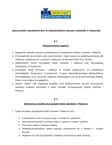 REGULAMIN CZŁONKOSTWA W EUROPEJSKIM SZLAKU ZAMKÓW I PAŁACÓW §1 Postanowienia ogólne: 1. Regulamin określa warunki uczestnictwa w Europejskim Szlaku Zamków i Pałaców. 2. Przynależność do projektu jest wyróżnieniem i daje szansę na wspólną promocję dla obiektów zabytkowych (zamków i pałaców) na terenie Polski oraz Świata. 3. Właścicielem marki Europejski Szlak Zamków i Pałaców jest Dolnośląska Organizacja Turystyczna. 4. Europejski Szlak Zamków i Pałaców to projekt realizowany we współpracy Dolnośląskiej Organizacji Turystycznej, Urzędu Marszałkowskiego Województwa Dolnośląskiego oraz zamków i pałaców znajdujących się na terenie Dolnego Śląska, Polski oraz krajów Europejskich. 5. Ogólny nadzór nad realizacją projektu oraz podejmowanie decyzji dotyczących realizacji projektu pozostaje w gestii Zarządu Europejskiego Szlaku Zamków i Pałaców. §2 Założenia projektu Europejski Szlak Zamków i Pałaców 1. Celem projektu Europejski Szlak Zamków i Pałaców jest : a. Zwiększenie ruchu turystycznego w zamkach i pałacach, b. Stworzenie produktu turystycznego w oparciu o zamki i pałace, c. Promocja regionu Dolnego Śląska, d. Umiędzynarodowienie szlaku poprzez poszerzenie go o obiekty z Europy, e. Wpisanie na listę Europejskich Szlaków Kulturowych Rady Europy. krajów §3 Zarząd Europejskiego Szlaku Zamków i Pałaców: 1. Zarząd jest organem wykonawczym Europejskiego Szlaku Zamków i Pałaców do jego zadań należą: a. Nadzór nad działaniami wewnętrznymi, b. Udział w realizacji zadań zewnętrznych, c. Merytoryczna kontrola nad budżetem składkowym, d. Rekomendacja do cofnięcia członkostwa w szlaku, e. Rozwiązywanie pojawiających się problemów, f. Reprezentowanie Europejskiego Szlaku Zamków i Pałaców, g. Podejmowanie decyzji związanych z rozwojem szlaku, 2. Zarząd Europejskiego Szlaku Zamków i Pałaców jest otwarty, prawo do zgłoszenia do Zarządu ma reprezentant każdego obiektu wchodzącego w skład szlaku. 3. Prawo do podejmowania decyzji merytorycznych, finansowych oraz związanych z rozwojem szlaku mają członkowie Zarządu obecni na posiedzeniu Zarządu. 4. Członkowie Zarządu sprawują swą funkcję społecznie. 5. Nadzór nad zgłoszeniami na członków Zarządu Europejskiego Szlaku Zamków i Pałaców sprawuje obecny Zarząd. 6. Posiedzenia Zarządu odbywać się będą w miarę potrzeb, jednak nie rzadziej niż raz na kwartał. 7. Miejsce posiedzenia Zarządu wybierane jest przez Zarząd Szlaku. §4 Komisja Kwalifikacyjna Europejskiego Szlaku Zamków i Pałaców 1. Komisja Kwalifikacyjna jest organem Europejskiego Szlaku Zamków i Pałaców. 2. Do zadań Komisji Kwalifikacyjnej należy: a. Odbycie wizji lokalnej Komisji Kwalifikacyjnej w obiekcie aplikującym do Europejskiego Szlaku Zamków i Pałaców, b. Udzielanie opinii po wizytacji w obiekcie aplikującym do Europejskiego Szlaku Zamków i Pałaców w porozumieniu z Zarządem Szlaku, 3. Członkowie Komisji Kwalifikacyjnej sprawują swą funkcję społecznie. 4. Członkiem Komisji Kwalifikacyjnej może być tylko członek Zarządu Europejskiego Szlaku Zamków i Pałaców. 5. Minimalna liczba członków Komisji Kwalifikacyjnej podczas wizytacji wynosi 3 osoby. 6. Komisja zobowiązana jest w ciągu 7 dni od dnia wizytacji przekazać swoją opinię aplikującemu obiektowi. 7. Zgłoszenia do Komisji Kwalifikacyjnej przed wizytacją nadzoruje Zarząd szlaku. §5 Budżet Składkowy Europejskiego Szlaku Zamków i Pałaców 1. Uczestnictwo w Europejskim Szlaku Zamków i Pałaców wiąże się z opłacaniem rocznej składki budżetowej. 2. Dla obiektów posiadających status członka Dolnośląskiej Organizacji Turystycznej składka wynosi: 2000,00 zł, słownie : dwa tysiące złotych. 3. Dla pozostałych obiektów aplikujących do Europejskiego Szlaku Zamków i Pałaców składka wynosi: 3000,00 zł, słownie : trzy tysiące złotych. 4. Składka budżetowa wpłacana jest na konto bankowe Dolnośląskiej Organizacji Turystycznej. 5. Kontrolę merytoryczną nad budżetem składkowym sprawuje Zarząd Europejskiego Szlaku Zamków i Pałaców. 6. Składka budżetowa jest składką roczną, wpłacana jest na początku kolejnego roku działalności Europejskiego Szlaku Zamków i Pałaców. 7. Brak uregulowania składki jest jednoznaczny z wystąpieniem z Europejskiego Szlaku Zamków i Pałaców. §6 Warunki uczestnictwa w Europejskim Szlaku Zamków i Pałaców 1. Obiekt aplikujący do Europejskiego Szlaku Zamków i Pałaców musi być obiektem zabytkowym (zamkiem lub pałacem) wpisanym do rejestru zabytków. 2. Obiekt musi być obiektem czynnym turystycznie tj. być dostępny dla turystów np. zwiedzanie. 3. Obiekt musi uzyskać pozytywną opinię Komisji Kwalifikacyjnej po wizji lokalnej. 4. Obiekt jest przygotowany pod względem finansowym do budżetowej przeznaczonej na działania marketingowe opłacania składki projektu oraz do zaangażowania siebie lub swoich pracowników w czynną promocję Europejskiego Szlaku Zamków i Pałaców. 5. Obiekty z regionu Dolnego Śląska aby dołączyć do Europejskiego Szlaku Zamków i Pałaców muszą posiadać status członka Dolnośląskiej Organizacji Turystycznej. §7 Wykluczenie z Europejskiego Szlaku Zamków i Pałaców 1. Wykluczenie z Europejskiego Szlaku Zamków i Pałaców następuje gdy jest spełniony jeden z poniższych warunków: a. Brak wpłaty rocznej składki budżetowej na konto Dolnośląskiej Organizacji Turystycznej w ustalonym terminie przez Zarząd szlaku, b. Nie przestrzeganie Regulaminu Europejskiego Szlaku Zamków i Pałaców, c. Niestosowanie się do decyzji Zarządu Szlaku w kwestiach organizacyjnych i finansowych, 2. Członek Europejskiego Szlaku Zamków i Pałaców ma prawo zrezygnować z uczestnictwa w projekcie. Decyzja rezygnacji z uczestnictwa powinna być poprzedzona stosownym pismem. §8 System identyfikacji wizualnej Europejskiego Szlaku Zamków i Pałaców 1. Partnerzy projektu 