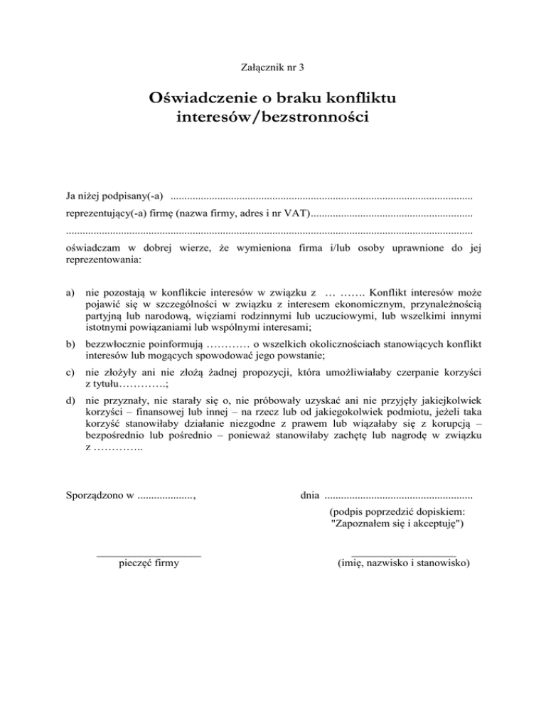 Załącznik nr 3 Oświadczenie o braku konfliktu interesów/bezstronności Ja niżej podpisany(-a) .............................................................................................................. reprezentujący(-a) firmę (nazwa firmy, adres i nr VAT) ........................................................... .................................................................................................................................................... oświadczam w dobrej wierze, że wymieniona firma i/lub osoby uprawnione do jej reprezentowania: a) nie pozostają w konflikcie interesów w związku z … ……. Konflikt interesów może pojawić się w szczególności w związku z interesem ekonomicznym, przynależnością partyjną lub narodową, więziami rodzinnymi lub uczuciowymi, lub wszelkimi innymi istotnymi powiązaniami lub wspólnymi interesami; b) bezzwłocznie poinformują ………… o wszelkich okolicznościach stanowiących konflikt interesów lub mogących spowodować jego powstanie; c) nie złożyły ani nie złożą żadnej propozycji, która umożliwiałaby czerpanie korzyści z tytułu………….; d) nie przyznały, nie starały się o, nie próbowały uzyskać ani nie przyjęły jakiejkolwiek korzyści – finansowej lub innej – na rzecz lub od jakiegokolwiek podmiotu, jeżeli taka korzyść stanowiłaby działanie niezgodne z prawem lub wiązałaby się z korupcją – bezpośrednio lub pośrednio – ponieważ stanowiłaby zachętę lub nagrodę w związku z ………….. Sporządzono w .................... , dnia ...................................................... (podpis poprzedzić dopiskiem: "Zapoznałem się i akceptuję") ___________________ pieczęć firmy ___________________ (imię, nazwisko i stanowisko)