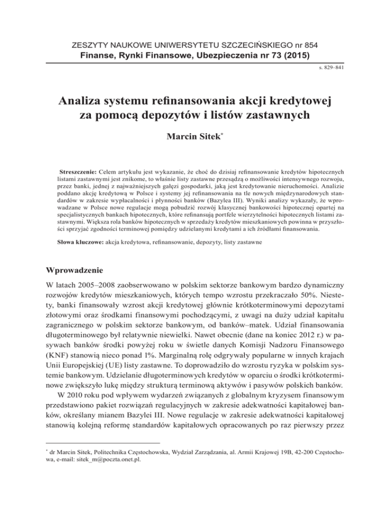 ZESZYTY NAUKOWE UNIWERSYTETU SZCZECIŃSKIEGO nr 854 Finanse, Rynki Finansowe, Ubezpieczenia nr 73 (2015) s. 829–841 Analiza systemu refinansowania akcji kredytowej za pomocą depozytów i listów zastawnych Marcin Sitek* Streszczenie: Celem artykułu jest wykazanie, że choć do dzisiaj refinansowanie kredytów hipotecznych listami zastawnymi jest znikome, to właśnie listy zastawne przesądzą o możliwości intensywnego rozwoju, przez banki, jednej z najważniejszych gałęzi gospodarki, jaką jest kredytowanie nieruchomości. Analizie poddano akcję kredytową w Polsce i systemy jej refinansowania na tle nowych międzynarodowych standardów w zakresie wypłacalności i płynności banków (Bazylea III). Wyniki analizy wykazały, że wprowadzane w Polsce nowe regulacje mogą pobudzić rozwój klasycznej bankowości hipotecznej opartej na specjalistycznych bankach hipotecznych, które refinansują portfele wierzytelności hipotecznych listami zastawnymi. Większa rola banków hipotecznych w sprzedaży kredytów mieszkaniowych powinna w przyszłości sprzyjać zgodności terminowej pomiędzy udzielanymi kredytami a ich źródłami finansowania. Słowa kluczowe: akcja kredytowa, refinansowanie, depozyty, listy zastawne Wprowadzenie W latach 2005–2008 zaobserwowano w polskim sektorze bankowym bardzo dynamiczny rozwojów kredytów mieszkaniowych, których tempo wzrostu przekraczało 50%. Niestety, banki finansowały wzrost akcji kredytowej głównie krótkoterminowymi depozytami złotowymi oraz środkami finansowymi pochodzącymi, z uwagi na duży udział kapitału zagranicznego w polskim sektorze bankowym, od banków–matek. Udział finansowania długoterminowego był relatywnie niewielki. Nawet obecnie (dane na koniec 2012 r.) w pasywach banków środki powyżej roku w świetle danych Komisji Nadzoru Finansowego (KNF) stanowią nieco ponad 1%. Marginalną rolę odgrywały popularne w innych krajach Unii Europejskiej (UE) listy zastawne. To doprowadziło do wzrostu ryzyka w polskim systemie bankowym. Udzielanie długoterminowych kredytów w oparciu o środki krótkoterminowe zwiększyło lukę między strukturą terminową aktywów i pasywów polskich banków. W 2010 roku pod wpływem wydarzeń związanych z globalnym kryzysem finansowym przedstawiono pakiet rozwiązań regulacyjnych w zakresie adekwatności kapitałowej banków, określany mianem Bazylei III. Nowe regulacje w zakresie adekwatności kapitałowej stanowią kolejną reformę standardów kapitałowych opracowanych po raz pierwszy przez * dr Marcin Sitek, Politechnika Częstochowska, Wydział Zarządzania, al. Armii Krajowej 19B, 42-200 Częstochowa, e-mail: [email protected]. 830 Marcin Sitek Bazylejski Komitet ds. Nadzoru Bankowego (BCBS – Basel Committee on Banking Supervision) w 1988 roku. Ostatnia reforma miała miejsce w roku 2006, kiedy to wprowadzono w wielu krajach pakiet regulacyjny Bazylea II. Globalny kryzys finansowy ujawnił jednak jego istotne słabości, co skłoniło BCBS do przeprowadzenia kolejnej, dużej reformy tych regulacji (Bazylei III). Bazylea III ma w istotny sposób wzmocnić bezpieczeństwo systemów bankowych na świecie, szczególnie poprzez wzmocnienie jakości kapitałów własnych banków oraz nadanie większej rangi kwestiom płynności (Lepczyński 2013: 178). W Polsce sytuacja ta zbiegła się z trwającym już od kilku lat strukturalnym niedopasowaniem terminów finansowania: polskie banki finansują długoterminową akcję kredytową krótkoterminowymi depozytami. Uwydatniło to tym bardziej potrzebę przeglądu polskich regulacji pod kątem zwiększenia dostępu banków do instrumentów finansowania długoterminowego. Potrzebę tym większą, że uwzględniającą wprowadzone w Bazylei III normy płynności zarówno krótkoterminowej (LCR – Liquidity Coverage Ratio), jak i długoterminowej (NSFR – Net Stable Funding Ratio), które będą wymagały od banków dokonania strukturalnych zmian w ich profilach płynnościowych. Miara płynności krótkoterminowej LCR stanowi, iż bank powinien dysponować wystarczającą ilością nieobciążonych aktywów płynnych wysokiej jakości, które mogą być bez przeszkód i natychmiastowo zamienione na gotówkę na rynku w drodze transakcji bilateralnej, tak aby w scenariuszu warunków skrajnych dla płynności można było zaspokoić potrzeby płynnościowe banku przez kolejne 30 dni kalendarzowych (jego górna granica w wysokości 100% będzie stanowiła wymóg minimalny). Zgodnie z harmonogramem opublikowanym przez Komitet Bazylejski, miara LCR wejdzie w życie 1 stycznia 2015 roku, rozpoczynając się wymogiem minimalnym na poziomie 60% normy, powiększanym każdego roku o 10 punktów procentowych, aż do osiągnięcia 1 stycznia 2019 roku docelowego poziomu 100%. W tym samym terminie powinna ona wejść w życie w krajach członkowskich, ponieważ Komisja Europejska, publikując projekt dyrektywy CRD IV zadeklarowała, że nowe wymogi płynnościowe wejdą w życie w terminach wskazanych przez Komitet Bazylejski. Miara płynności długoterminowej NSFR ma za zadanie promować średnio- i długoterminowe finansowanie aktywów i działalności banku. NSFR ustanawia minimalny akceptowalny poziom stabilnego finansowania, bazując na charakterystyce płynnościowej aktywów i działalności banku w horyzoncie 1 roku. Celem tego wskaźnika jest zapewnienie stabilnej sytuacji banków pod względem płynności w okresie powyżej roku. Jego wprowadzenie może mieć bardzo duże znaczenie w ograniczaniu ryzyka niedopasowania terminowego aktywów i pasywów banków. Wskaźnik ten obliczany jest przy założeniu wystąpienia sytuacji kryzysowej1. 1 Należy zauważyć, że zaproponowany przez twórców Bazylei III wskaźnik płynności długookresowej jest bardziej restrykcyjny w relacji do obecnie obowiązującej w Polsce normy nadzorczej, zwłaszcza w zakresie definiowania środków stabilnych, przez co jego wprowadzenie może mieć istotny w