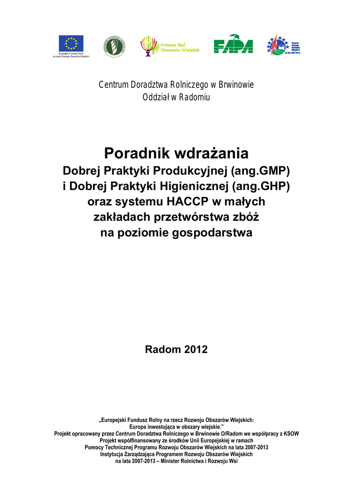 Centrum Doradztwa Rolniczego w Brwinowie Oddział w Radomiu Poradnik wdrażania Dobrej Praktyki Produkcyjnej (ang.GMP) i Dobrej Praktyki Higienicznej (ang.GHP) oraz systemu HACCP w małych zakładach przetwórstwa zbóż na poziomie gospodarstwa Radom 2012 „Europejski Fundusz Rolny na rzecz Rozwoju Obszarów Wiejskich: Europa inwestująca w obszary wiejskie.” Projekt opracowany przez Centrum Doradztwa Rolniczego w Brwinowie O/Radom we współpracy z KSOW Projekt współfinansowany ze środków Unii Europejskiej w ramach Pomocy Technicznej Programu Rozwoju Obszarów Wiejskich na lata 2007-2013 Instytucja Zarządzająca Programem Rozwoju Obszarów Wiejskich na lata 2007-2013 – Minister Rolnictwa i Rozwoju Wsi Centrum Doradztwa Rolniczego w Brwinowie Oddział w Radomiu 26-600 Radom, ul. Chorzowska 16/18 www.odr.net.pl/rolnictwo_ekologiczne [email protected] Autorzy: prof. dr hab. Danuta Kołożyn-Krajewska dr inż. Katarzyna Godlewska @ Copyright by Ministerstwo Rolnictwa i Rozwoju Wsi ISBN 978-83-60185-95-7 Druk: Centrum Doradztwa Rolniczego w Brwinowie Oddział w Radomiu ul. Chorzowska 16/18, tel. 48 365 69 00 Nakład 530 egz. 2 Spis treści I Wstęp – małe przetwórstwo w gospodarstwie i jego miejsce na rynku ....................................... 5 II. Obowiązujące przepisy prawa żywnościowego ........................................................................... 6 III. Proces produkcyjny przemiału zboża na mąkę na przykładzie Pokazowego Gospodarstwa Ekologicznego w Chwałowicach ............................................................................................... 13 IV. Wymagania higieniczne dla zakładu przetwórstwa zbóż. .......................................................... 21 V. Dobre praktyki produkcyjne wymagane do wdrożenia ze szczególnym uwzględnieniem możliwych do zidentyfikowania zagrożeń ................................................................................. 23 VI. Proces i wymagania formalno-prawne przy zatwierdzaniu i rejestracji działalności ................. 25 VII. Przykład projektowania systemu HACCP w małym zakładzie z uwzględnieniem możliwych derogacji prawnych dla tych zakładów ................................................................... 27 VIII. Kontrola urzędowa żywności produkowanej i znajdującej się w obrocie .................................. 33 IX. Piśmiennictwo ............................................................................................................................ 35 X. Przykładowa Księga HACCP dla małego zakładu przemiału zboża na mąkę ........................... 36 3 4 I. WSTĘP – MAŁE PRZETWÓRSTWO W GOSPODARSTWIE I JEGO MIEJSCE NA RYNKU Większość małych i średnich gospodarstw rolnych opiera się na pracy jednej rodziny z możliwością czasowego i – zazwyczaj ograniczonego - zatrudniania dodatkowych pracowników z zewnątrz. Praca przynosi efekty w postaci pozyskiwania płodów rolnych oraz chowu zwierząt i określana jest mianem produkcji pierwotnej. Zyski uzyskiwane z tej działalności wydają się być nie zawsze wystarczające, szczególnie w przypadku gospodarstw dysponującym niewielkim areałem ziemi uprawnej i chowu niewielkiej liczby zwierząt użytkowych. Propozycją zwiększenia dochodów rolnika i hodowcy może być inwestycja w małe przetwórstwo uzyskanych wcześniej surowców z produkcji pierwotnej. Należy jednak zwrócić uwagę, że samo przetworzenie produktów rolnych nie gwarantuje jeszcze zysku. Wytworzone produkty trzeba sprzedać i końcowy sukces zależy właśnie od możliwości dystrybucji swoich produktów tzn. znalezienia klientów. Najlepiej i najbezpieczniej w przypadku podejmowania inwestycji jest wytworzyć łańcuch dystrybucyjny, czyli zadbać o odbiorcę swoich produktów, który po przetworzeniu będzie miał swoich klientów. W ten sposób wszystkie kolejne działalności będą potrzebne sobie nawzajem. Ziarno zbóż i produkty z niego otrzymywane stanowią podstawę wyżywienia człowieka (i zwierząt), gdyż zawierają wiele podstawowych składników odżywczych, z których największe znaczenie ma skrobia. Konsumpcja produktów bogatych w węglowodany złożone leży u podstaw piramidy zdrowego żywienia. Stosowanie w codziennej diecie określonych w niej grup produktów i odpowiednich proporcji między nimi zapewnia dobrostan organizmu i pełne zaspokojenie potrzeb żywieniowych. Niniejsza publikacja ma za zadanie zaprezentować propozycję przydomowego przetwórstwa jakim byłby młyn przydomowy. Ponieważ końcowym produktem młyna jest żywność (w różnej postaci – kasze, mąki, otręby) założeniem autorek tego poradnika było pokazanie wszystkich wytycznych od strony higieniczno-sanitarnej tak by rozpoczynający działalność mógł prowadzić ją zgodnie z prawem żywnościowym. W kolejnych rozdziałach zostanie omówiona stosowana technologia i procesy zachodzące w czasie przemiału ziarna, wymagania prawne z zakresu bezpieczeństwa żywności dotyczące produkcji jak i rozpoczynania i prowadzenia działalności. Część poradnika zostanie przeznaczona na przedstawienie przykładowej dokumentacji higieniczno-sanitarnej dla młyna oraz omówienie zagadnień związanych z urzędową kontrolą żywności. Do opracowania poradnika przyjęto następujące założenia: młyn zlokalizowany jest przy gospodarstwie rolnym, w którym uprawia się i magazynuje a następnie przetwarza zboże. Młyn pracuje okresowo – tzn. zgodnie z zapotrzebowaniem, nie można więc określić stałego czasu pracy. W młynie pracują członkowie rodziny prowadzącego gospodarstwo rolne. Dopuszczalne jest usługowe mielenie zboża z poza gospodarstwa. Omówione zostaną też uwarunkowania przetwarzania żywności o statusie „ekologiczna”. Mamy nadzieję, że publikacja pomoże rolnikom-przedsiębiorcom zaistnieć na rynku bezpiecznej żywności. 5 II. OBOWIĄZUJĄCE PRZEPISY PRAWA ŻYWNOŚCIOWEGO Prawo 