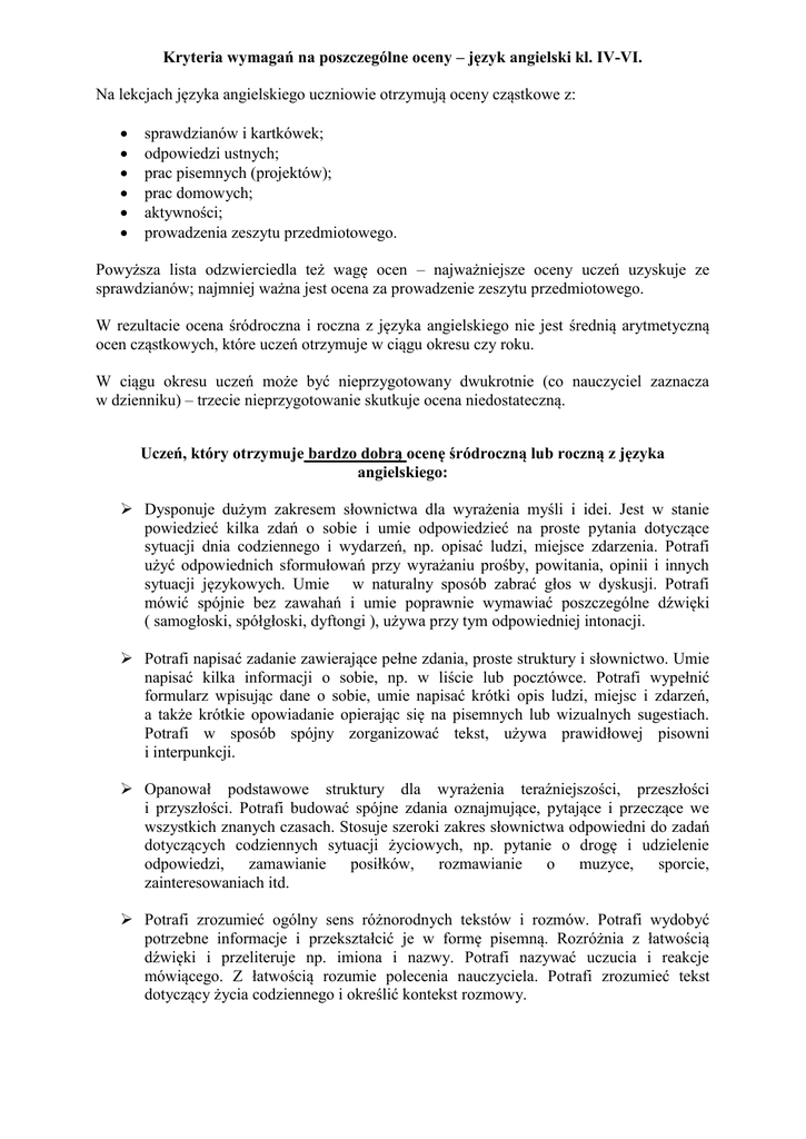 Kryteria wymagań na poszczególne oceny – język angielski kl. IV-VI. Na lekcjach języka angielskiego uczniowie otrzymują oceny cząstkowe z: sprawdzianów i kartkówek; odpowiedzi ustnych; prac pisemnych (projektów); prac domowych; aktywności; prowadzenia zeszytu przedmiotowego. Powyższa lista odzwierciedla też wagę ocen – najważniejsze oceny uczeń uzyskuje ze sprawdzianów; najmniej ważna jest ocena za prowadzenie zeszytu przedmiotowego. W rezultacie ocena śródroczna i roczna z języka angielskiego nie jest średnią arytmetyczną ocen cząstkowych, które uczeń otrzymuje w ciągu okresu czy roku. W ciągu okresu uczeń może być nieprzygotowany dwukrotnie (co nauczyciel zaznacza w dzienniku) – trzecie nieprzygotowanie skutkuje ocena niedostateczną. Uczeń, który otrzymuje bardzo dobrą ocenę śródroczną lub roczną z języka angielskiego: Dysponuje dużym zakresem słownictwa dla wyrażenia myśli i idei. Jest w stanie powiedzieć kilka zdań o sobie i umie odpowiedzieć na proste pytania dotyczące sytuacji dnia codziennego i wydarzeń, np. opisać ludzi, miejsce zdarzenia. Potrafi użyć odpowiednich sformułowań przy wyrażaniu prośby, powitania, opinii i innych sytuacji językowych. Umie w naturalny sposób zabrać głos w dyskusji. Potrafi mówić spójnie bez zawahań i umie poprawnie wymawiać poszczególne dźwięki ( samogłoski, spółgłoski, dyftongi ), używa przy tym odpowiedniej intonacji. Potrafi napisać zadanie zawierające pełne zdania, proste struktury i słownictwo. Umie napisać kilka informacji o sobie, np. w liście lub pocztówce. Potrafi wypełnić formularz wpisując dane o sobie, umie napisać krótki opis ludzi, miejsc i zdarzeń, a także krótkie opowiadanie opierając się na pisemnych lub wizualnych sugestiach. Potrafi w sposób spójny zorganizować tekst, używa prawidłowej pisowni i interpunkcji. Opanował podstawowe struktury dla wyrażenia teraźniejszości, przeszłości i przyszłości. Potrafi budować spójne zdania oznajmujące, pytające i przeczące we wszystkich znanych czasach. Stosuje szeroki zakres słownictwa odpowiedni do zadań dotyczących codziennych sytuacji życiowych, np. pytanie o drogę i udzielenie odpowiedzi, zamawianie posiłków, rozmawianie o muzyce, sporcie, zainteresowaniach itd. Potrafi zrozumieć ogólny sens różnorodnych tekstów i rozmów. Potrafi wydobyć potrzebne informacje i przekształcić je w formę pisemną. Rozróżnia z łatwością dźwięki i przeliteruje np. imiona i nazwy. Potrafi nazywać uczucia i reakcje mówiącego. Z łatwością rozumie polecenia nauczyciela. Potrafi zrozumieć tekst dotyczący życia codziennego i określić kontekst rozmowy. Uczeń, który otrzymuje dobrą ocenę śródroczną lub roczną z języka angielskiego: Potrafi skutecznie przekazać wiadomość przy użyciu dość bogatego słownictwa, wzorców intonacyjnych i dość dobrej wymowy. Mówi dość spójnie, z pewnym wahaniem. Zwykle umie w sposób naturalny włączyć się od rozmowy i wyrazić swoje zdanie. Umie zadawać pytania ale popełnia czasem błędy. Potrafi poprosić o pomoc czy powtórzenie i prowadzić prostą rozmowę o sobie i swojej rodzinie. Potrafi na ogół napisać zadanie zawierające pełne zdania, proste struktury i słownictwo. W zadaniach pisemnych zawiera wszystkie istotne punkty, choć niektórym poświęca niewiele miejsca. Potrafi wykonać proste opisy ludzi, miejsc i zdarzeń, napisać krótki list o sobie i swojej rodzinie używa przy tym czasem nieprawidłowej pisowni i interpunkcji. Potrafi poprawnie operować większością prostych słów. Buduje zdania przeważnie spójne. Na ogół używa szerokiego zakresu słownictwa odpowiedniego do zadania. Zna zasady podstawowego szyku wyrazów w zdaniach oznajmujących, pytających i przeczących. Potrafi zadawać pytania za pomocą inwersji i czasowników posiłkowych. Opanował proste słownictwo dotyczące codziennych sytuacji życiowych. Potrafi zazwyczaj zrozumieć ogólny sens różnych tekstów i rozmów oraz większość kluczowych informacji. Rozpoznaje uczucia i reakcje mówiącego. Umie wybrać ze słuchanego tekstu najistotniejsze informacje, np. imiona lub miejsca i zapisać je. Potrafi rozróżnić dźwięki i zrozumieć polecenia nauczyciela. Uczeń, który otrzymuje dostateczną ocenę śródroczną lub roczną z języka angielskiego: Potrafi dość skutecznie przekazać wiadomość, jednak słownictwo ma dość ograniczone, a wzorce intonacyjne i wymowa nie są wystarczająco spójne. Mówi niezbyt spójnie, z pewnym wahaniem. Dysponuje ograniczonym zakresem słownictwa dla wyrażenia myśli i idei oraz funkcji językowych. Próbuje napisać zadanie zawierające pełne zdania, proste struktury i słownictwo. W zadaniu pisemnym zawiera większość istotnych punktów, choć tekst mógłby być bardziej spójny. Ma pewne trudności w doborze słów i ulega interferencji języka polskiego. Potrafi operować poprawnie niektórymi prostymi strukturami i budować zdania niekiedy spójne. Używa poprawnie ograniczonego zakresu słownictwa odpowiedniego do zadania, ale zdarzają mu się trudności z doborem słów. W miarę dobrze opanował struktury czasów teraźniejszych, ale ma trudności z formami czasu przeszłego. Próbuje budować przeczenia i pytania, ale popełnia błędy. Potrafi zazwyczaj zrozumieć sens wypowiedzi i wybrać określone informacje. Potrafi wydobyć część potrzebnych informacji i przekształcić je w formę pisemną. Czasami rozpoznaje uczucia i reakcje mówiącego oraz rozumie polecenia nauczyciela. Uczeń, który otrzymuje dopuszczającą ocenę śródroczną lub roczną z języka angielskiego: Czasami potrafi przekazać wiadomość, jednak słownictwo ma ograniczone, a wzorce intonacyjne i wymowa nie są wystarczająco spójne. Potrafi czasem mówić spójnie, ale z częstym wahaniem. Rzadko umie włączyć się do rozmowy i wyrazić swoje zdanie. Dysponuje bardzo ograniczon