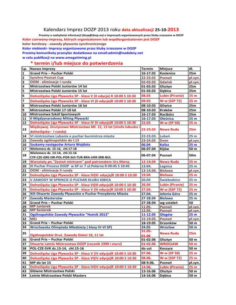 Kalendarz Imprez DOZP 2013 roku data aktualizacji 25-10-2013 Prosimy o nadsyłanie informacji ([email protected]) o imprezach organizowanych przez kluby zrzeszone w DOZP Kolor czerwony-imprezy, których organizatorem lub współorganizatorem jest DOZP kolor bordowy - zawody pływania synchronicznego Kolor niebieski- imprezy organizowane przez kluby zrzeszone w DOZP Prosimy komunikaty przesyłac dodatkowo na email:[email protected] w celu publikacji na www.omegatiming.pl * termin i/lub miejsce do potwierdzenia Lp. 1 2 3 4 5 6 7 8 9 10 11 12 13 Nazwa imprezy Grand Prix – Puchar Polski Synchro Poznań Cup OOM - eliminacje I runda Mistrzostwa Polski Juniorów 14 lat Mistrzostwa Polski Juniorów 15 lat Dolnośląska Liga Pływacka SP - klasa V (II edycja) R 10:00 S 10:30 Dolnośląska Liga Pływacka SP - klasa VI (II edycja)R 10:00 S 10:30 Mistrzostwa Polski Juniorów 16 lat Mistrzostwa Polski 17-18 lat Mistrzostwa Szkół Sportowych II Międzynarodowy Miting Pływacki Dolnośląska Liga Pływacka SP - klasa IV (II edycja)R 10:00 S 10:30 Międzywoj. Drużynowe Mistrzostwa Mł. 12, 13 lat (strefa lubuska i dolnośląska– I runda) VI mistrzostwa Lubania o puchar burmistrza miasta Zawody ogólnopolskie do l.13 Szukamy następców Artura Wojdata 14 15 16 17 Wielomecz dz. 15-16, chł.17-18 18 Wielomecz dz. 13-14, chł.15-16 CYP-CZE-GRE-ISR-POL-POR-SUI-TUR-BRA-UKR-SRB-BUL 19 20 21 22 23 24 25 26 27 28 29 30 31 32 33 34 Warsztaty pn."Zostań mistrzem" pod patronatem Urz.Marsz. III Puchar Prezesa DOZP w SP nr 7 ul.Polarna R 09:45 S 10:45 OOM - eliminacje II runda Dolnośląska Liga Pływacka SP - klasa IV(III edycja)R 10:00 S 10:30 V ZAWODY W SPRINCIE O PUCHAR KLUBU KIBICA Dolnośląska Liga Pływacka SP - klasa VI(III edycja)R 10:00 S 10:30 Dolnośląska Liga Pływacka SP - klasa V (III edycja)R 10:00 S 10:30 XIII Otwarte Zawody Pływackie o Puchar Prezydenta Miasta Zawody Mastersów Grand Prix – Puchar Polski MP Juniorek MP Seniorek Ogólnopolskie Zawody Pływackie "Hutnik 2013" MEJ Grand Prix – Puchar Polski Wrocławska Olimpiada Młodzieży ( klasy IV-VI SP) 35 Ogólnopolskie Druż. Zawody Dzieci 10, 11 lat 36 Grand Prix – Puchar Polski 37 Otwarte Letnie Mistrzostwa DOZP (rocznik 1999 i starsi) 38 POL-CZE-SVK dz.13-14, chł.15-16 39 Dolnośląska Liga Pływacka SP - klasa V (IV edycja)R 10:00 S 10:30 40 Dolnośląska Liga Pływacka SP - klasa VI(IV edycja)R 10:00 S 10:30 41 MP do lat 15 42 Dolnośląska Liga Pływacka SP - klasa IV(IV edycja)R 10:00 S 10:30 43 Główne Mistrzostwa Polski 44 Letnie Mistrzostwa Polski Masters Termin 16-17.02 22-23.02 02-03.03 01-03.03 01-03.03 08.03 09.03 08-10.03 08-10.03 16-17.03 16-17.03 22.03 Miejsce Kozienice Poznań Gdańsk Olsztyn Dębica Lubin (Piranie) W-w (SSP 72) Gliwice Kraków Racibórz Oleśnica W-w (SP 50) dł. 25m pł.syn. pł.syn. 25m 25m 25 m 25 m 25m 25m 25m 25 m 25 m 22-23.03 Nowa Ruda 25m 22-23.03. 23-24.03 06.04 06-07.04 Lubań Śrem Kalisz Kijów 25 m pł.syn. 25 m 50 m 06-07.04 Poznań 50m 12-14.04 13.04. 13-14.04. 19.04 20.04 26.04 27.04. 27.04. 27-28.04 27-28.04 11.05. 12.05. 11-12.05 15-19.05. 18-19.05 24.05 31.0501.06 01-02.06 01-02.06 do ust 07.06. 08.06. 08-9.06. 14.06. 13-16.06 14-16.06 Nowa Ruda Legnica Bielawa Bielawa Świebodzice Lubin (Piranie) W-w (SSP 72) Jelenia Góra Bielawa wg ustaleń Poznań Poznań Głogów Poznań Drzonków Wrocław 25 m 25 m pł.syn. 25 m 25 m 25 m 25 m 25 m 25 m 50 pł.syn. pł.syn. 25 m pł.syn. 50 m 50 m Nowa Ruda 25m Olsztyn WROCŁAW Koszyce W-w (SP 50) W-w (SSP 72) Poznań Lubin (Piranie) Olsztyn Dębica 50 m 50 m 50 m 25 m 25 m pł.syn. 25 m 50 m 50 m 45 MP Młodziczek 46 MP Młodziczek 47 Liga SMS – I runda Międzywoj. Drużynowe Mistrzostwa Mł. 12 lat (strefa lubuska i 48 dolnośląska– II runda) * 49 Międzywoj. Drużynowe Mistrzostwa Mł - 13 lat II runda 50 51 52 53 54 55 56 57 OOM Mistrzostwa Polski Juniorów 14 lat UNIWERSIADA Mistrzostwa Europy Juniorów (dz 15-16,chł. 17-18 l.) EYOF (dz.13-14, chł.15-16 lat) Mistrzostwa Polski Juniorów 15 lat Mistrzostwa Polski 17-18 lat (OOM) Mistrzostwa Polski Juniorów 16 lat 58 Mistrzostwa Świata 59 Mistrzostwa Świata Juniorów (dz.15-17, chł. 16-18 l.) 60 Mistrzostwa Europy Masters 61 X Zimowe Mistrzostwa Zagłębia Miedzowego 62 Grand Prix – Puchar Polski 63 Dni Olimpijczyka/Memoriał Romana Chomiaka 64 Międzynarodowy Miting Juniorek 65 Grand Prix – Puchar Polski Maraton Pływacki z okazji Święta Niepodległości pod patronatem 66 Piotra Romana - Prezydenta m.Bolesławiec 67 VI zawody pływackie o Puchar Wójta Gminy Rudna 68 DLP klas VI - 1 runda 69 Grand Prix – Puchar Polski 70 Zimowe Mistrzostwa Polski Masters Ogólnopolski sprawdzian wytrzymałości i wszechstronności 71 stylowej 11,12 lat 72 Klubowy Puchar Polski 73 Memoriał Petrusewicza 74 DLP klas V - 1 runda 75 Zawody Andrzejkowe 76 77 Ogólnopolskie Zawody Pływackie "Barbórka-2013" Zawody kwalifikacyjne do ME Międzynarodowy Miting V ŚWIDNICKA GWIAZDKA 2013 Zawody Mikołajkowe 12 lat 78 79 80 81 Liga SMS - I runda 82 DLP klas IV - 1 runda 83 Zimowe Mistrzostwa DOZP 84 ME 85 Zaw. Krajów Europy Środkowej. dz.13-14, chł.15-16 86 Zimowe Mistrzostwa Polski 15-06. Leszno 15-16.06. Chojnice 22-23.06 do ust. pł.syn. pł.syn. 25m 01-30.06* Zielona Góra 25m 29-30.06 29.0601.07 05-07.07 6-17.07 10-14.07 14-19.07 19-21.07 19-21.07 22-24.07 28.0704.08 26-31.08 31.0807.09 26.10 26-27.10 26-27.10 listopad 09-10.11 Gorzów 25m Łódź pł.syn. Gorzów Kazań Poznań Utrecht Oświęcim Ostrowiec Św Dębica 50 m 50 m 50 m 50 m 25m 50m 50m Barcelona 50 m Dubai 50 m Eindhoven 50 m Legnica SP 7 Suwałki Wroclaw SP 46 Bratysława Kraków 25 m 25 25 m pł.syn. 25m 11.11. Bolesławiec 25 m 16.11 16.11 16-17.11 15-17.11 Rudna Wrocław SP 72 Łódź Kraków 25 m 25 m 25m 25m 20-21.11 Wrocław SP 46 25 m 23.11. 23-24.11 26.11 29.11. 30.1101.12 30.11-01.12 grudzień 6-7.12 07.12. 07-8.12 Warszawa Wrocław Wrocław SP 72 Dzierżoniów pł.syn. 25 m 25 m 25 m Głogów 25 m Poznań