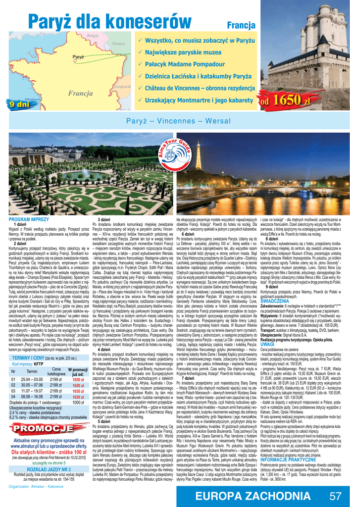 Paryż dla koneserów United Kingdom Belgia Francja P Wszystko, co musisz zobaczyć w Paryżu Niemcy P Największe paryskie muzea Paryż P Pałacyk Madame Pompadour P Dzielnica Łacińska i katakumby Paryża Atlantic Francja 9 dniOcean Szwajcaria P Château de Vincennes – obronna rezydencja P Urzekający Montmartre i jego kabarety Włochy od 1650 zł Paryż – Vincennes – Wersal Program imprezy 1 dzień Wyjazd z Polski według rozkładu jazdy. Przejazd przez Niemcy. W trakcie przejazdu planowane są krótkie postoje i przerwa na posiłek. 2 dzień Kontynuujemy przejazd tranzytowy, który zakończy się w godzinach popołudniowych w stolicy Francji. Środkami komunikacji miejskiej, udamy się na piesze zwiedzanie miasta. Paryż przywita Cię majestatycznym, empirowym Łukiem Triumfalnym na placu Charles’a de Gaulle’a, a umieszczony na łuku słynny relief Marsylianki wskaże najsłynniejszą aleję świata – Champs Elysees (Pola Elizejskie). Spacer tym reprezentacyjnym bulwarem zaprowadzi nas na jeden z najpiękniejszych placów Paryża – plac de la Concorde (Zgody). Tutaj, wśród pomników francuskich miast, zobaczysz między innymi obelisk z Luksoru (najstarszy zabytek miasta) oraz słynne budynki Oranżerii i Sali do Gry w Piłkę. Sprawdzimy też jak powstała restauracja Maxim’s i gdzie na placu jest „piąta kolumna”. Następnie, z przystani paryski statków wycieczkowych, udamy się jednym z „bateau” na pełen niesamowitych wrażeń rejs po Sekwanie. Najważniejsze, położone wzdłuż rzeki budynki Paryża, paryskie mosty (w tym te dla zakochanych) – wszystko to będzie na wyciągnięcie Twojej ręki i obiektywu aparatu. Po rejsie czas na kolację*, przejazd do hotelu zakwaterowanie i nocleg. Dla chętnych – późnym wieczorem „Paryż nocą”, gdzie zapraszamy na objazd autokarem po najpiękniej oświetlonych miejscach Paryża. TERMINY I CENY (za os. w pok. 2/3 os.) Kod imprezy: KFTP Cena W promocji katalogowa już od: 01 25.04 – 03.05 2199 zł 1650 zł 02 30.05 – 07.06 2199 zł 1650 zł 03 11.07 – 19.07 2199 zł 1650 zł 04 08.08 – 16.08 2199 zł 1650 zł Dopłata do pokoju 1 osobowego: 1000 zł Ubezpieczenie kosztów rezygnacji: 2,4 % ceny - stawka podstawowa 6,2 % ceny - stawka obejmująca choroby przewlekłe Nr Termin Promocje Aktualne ceny promocyjne sprawdź na www.almatur.pl lub u sprzedawców oferty. Dla stałych klientów - zniżka 100 zł (nie obowiązuje przy ofercie First Moment do 15.02.2015) szczegóły na stronie 5 Rozkład jazdy nr 3 Rozkład jazdy, lista przystanków oraz wykaz dopłat za miejsce wsiadania na str. 154-155 3 dzień Po śniadaniu środkami komunikacji miejskiej zwiedzanie Paryża rozpoczniemy od wizyty w paryskim zamku Vincennes – XIV-w. rezydencji królów francuskich położonej we wschodniej części Paryża. Zamek ten był w swojej historii świadkiem szczególnie ważnych momentów historii Francji – miejscem narodzin królów, miejscem rozpoczęcia krucjat, więzieniem stanu, a także – przed wybudowaniem Wersalu - letnią rezydencją dworu francuskiego. Następnie udamy się do najsłynniejszej, francuskiej nekropolii – Père-Lachaise, gdzie spoczywają m.in. Fryderyk Chopin, Edith Piaf i Maria Callas. Znajduje się tutaj również kaplica najsłynniejszej nieszczęśliwie zakochanej pary Francji - Abelarda i Heloizy. Po południu zachwyci Cię niezwykła dzielnica artystów, Le Marais, w której przy jednym z najpiękniejszych placów Paryża – Place des Vosges mieszkali m.in. Victor Hugo i kardynał Richelieu, a obecnie w tzw. wiosce św. Pawła swoje butiki mają najsłynniejsi paryscy malarze, rzeźbiarze i rzemieślnicy. Niedaleko stąd, na Placu Bastylii, poszukamy śladów rewolucji francuskiej i przejdziemy się parkowymi brzegami kanału św. Marcina. Później w ścisłym centrum miasta odwiedzimy okolicę Forum des Halles z kościołem św. Eustachego i paryską Bursą oraz Centrum Pompidou – budynku charakteryzującego się zaskakującą architekturą. Czas wolny. Dla chętnych zwiedzanie Centrum Pompidou. Przespacerujemy się przez romantyczny Most Marii na wyspę św. Ludwika pod słynny Hotel Lambert. Kolacja* i powrót do hotelu na nocleg. 4 dzień Po śniadaniu przejazd środkami komunikacji miejskiej na piesze zwiedzanie Paryża. Zwiedzając miasto pojedziemy do niezwykle interesującego i stosunkowo najnowszego Wielkiego Muzeum Paryża – du Quai Branly, muzeum sztuki kultur pozaeuropejskich. Pozwala ono Europejczykom zapoznać się z dziełami sztuki pochodzącymi z dalekich i egzotycznych miejsc, jak Azja, Afryka, Australia i Oceania. Następnie przejedziemy do muzeum poświęconego genialnemu rzeźbiarzowi Augustowi Rodin, by tam móc przekonać się jak zakląć pocałunek i ludzkie namiętności w marmur. Czas wolny, po czym paryskim metrem przejedziemy do dzielnicy Saint-Germain-des-Prés – gdzie w kościele spoczywa serce polskiego króla Jana II Kazimierza Wazy. Kolacja* i powrót do hotelu na nocleg. 5 dzień Po śniadaniu przejedziemy do Wersalu, gdzie zachwycą Cię bogate wnętrza jednego z najwspanialszych pałaców Francji, związanego z postacią Króla Słońce – Ludwika XIV. Wśród złotych boazerii, kryształowych kandelabrów Sali Lustrzanej poszukamy także duchów Marii Antoniny, Ludwika XVI i sprawdzimy jak przebiegał dzień rodziny królewskiej. Spacerując ogrodami Wersalu dowiemy się, dlaczego cały kompleks pałacowy stanowił inspirację dla późniejszych królewskich rezydencji ówczesnej Europy. Zwiedzimy także znajdujący sięw ogrodach budynek pałacyku Petit Trianon – przeznaczonego dla metresy Ludwika XV, Madam de Pompadour. Po południu przejedziemy do najsłynniejszego francuskiego Parku Miniatur, gdzie niezwy- kła ekspozycja prezentuje modele wszystkich najważniejszych obiektów Francji. Kolacja*. Powrót do hotelu na nocleg. Dla chętnych - wieczorny spektakl w jednym z paryskich kabaretów. 6 dzień Po śniadaniu kontynuuje