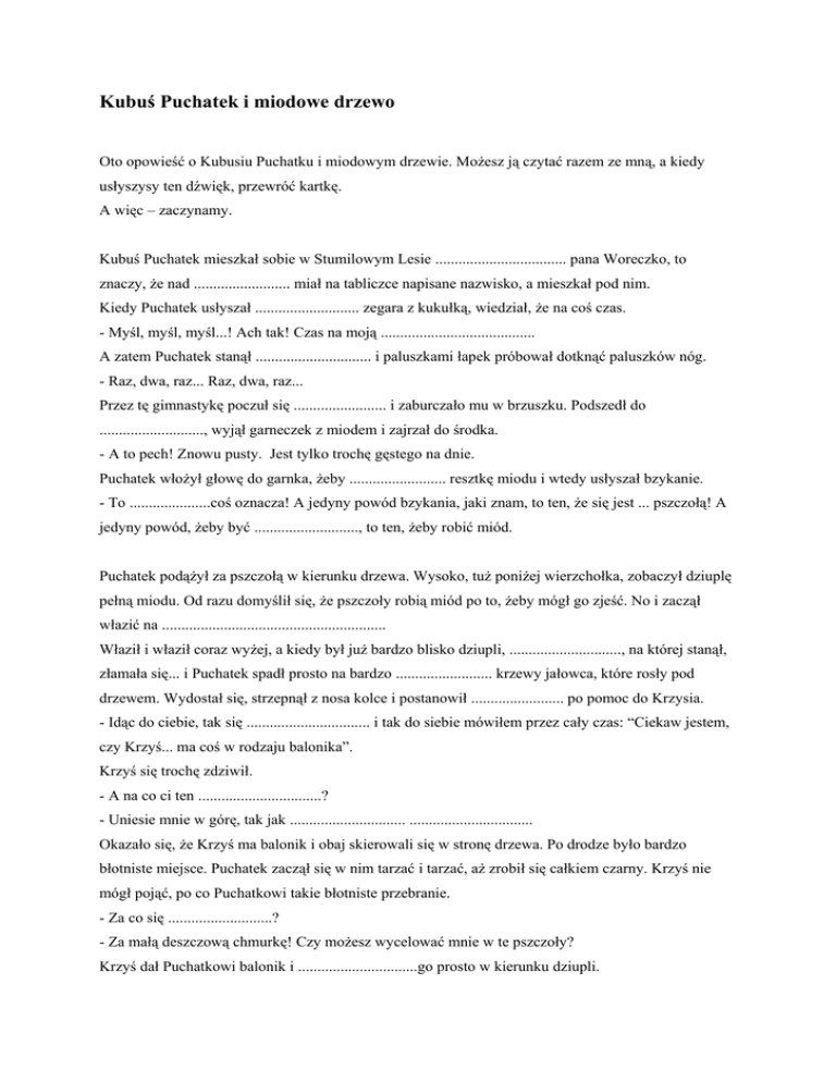 Kubuś Puchatek i miodowe drzewo Oto opowieść o Kubusiu Puchatku i miodowym drzewie. Możesz ją czytać razem ze mną, a kiedy usłyszysy ten dźwięk, przewróć kartkę. A więc – zaczynamy. Kubuś Puchatek mieszkał sobie w Stumilowym Lesie .................................. pana Woreczko, to znaczy, że nad ......................... miał na tabliczce napisane nazwisko, a mieszkał pod nim. Kiedy Puchatek usłyszał ........................... zegara z kukułką, wiedział, że na coś czas. - Myśl, myśl, myśl...! Ach tak! Czas na moją ........................................ A zatem Puchatek stanął .............................. i paluszkami łapek próbował dotknąć paluszków nóg. - Raz, dwa, raz... Raz, dwa, raz... Przez tę gimnastykę poczuł się ........................ i zaburczało mu w brzuszku. Podszedł do ..........................., wyjął garneczek z miodem i zajrzał do środka. - A to pech! Znowu pusty. Jest tylko trochę gęstego na dnie. Puchatek włożył głowę do garnka, żeby ......................... resztkę miodu i wtedy usłyszał bzykanie. - To .....................coś oznacza! A jedyny powód bzykania, jaki znam, to ten, że się jest ... pszczołą! A jedyny powód, żeby być ..........................., to ten, żeby robić miód. Puchatek podążył za pszczołą w kierunku drzewa. Wysoko, tuż poniżej wierzchołka, zobaczył dziuplę pełną miodu. Od razu domyślił się, że pszczoły robią miód po to, żeby mógł go zjeść. No i zaczął włazić na .......................................................... Właził i właził coraz wyżej, a kiedy był już bardzo blisko dziupli, ............................., na której stanął, złamała się... i Puchatek spadł prosto na bardzo ......................... krzewy jałowca, które rosły pod drzewem. Wydostał się, strzepnął z nosa kolce i postanowił ........................ po pomoc do Krzysia. - Idąc do ciebie, tak się ................................ i tak do siebie mówiłem przez cały czas: “Ciekaw jestem, czy Krzyś... ma coś w rodzaju balonika”. Krzyś się trochę zdziwił. - A na co ci ten ................................? - Uniesie mnie w górę, tak jak .............................. ................................ Okazało się, że Krzyś ma balonik i obaj skierowali się w stronę drzewa. Po drodze było bardzo błotniste miejsce. Puchatek zaczął się w nim tarzać i tarzać, aż zrobił się całkiem czarny. Krzyś nie mógł pojąć, po co Puchatkowi takie błotniste przebranie. - Za co się ...........................? - Za małą deszczową chmurkę! Czy możesz wycelować mnie w te pszczoły? Krzyś dał Puchatkowi balonik i ...............................go prosto w kierunku dziupli. Puchatek wznosił się coraz wyżej i wyżej, i był coraz to bliżej .........................i. A kiedy był już bardzo blisko, z dziupli wyleciała pszczoła i ........................ mu na nosie. - Posłuchaj, Krzysiu, ............................., że pszczoły się czegoś domyślają. Cha, cha, cha cha! Czy mógłbyś otworzyć swój .......................... i przechadzać się z nim, mówiąc: “Aj, aj, zanosi się na deszcz”?. A więc Krzyś otworzył parasol i przechadzał się, powtarzając: - Aj, aj, ................................ na deszcz. Ale pszczoła nie dała się oszukać. Umiała odróżnić deszczową chmurkę od głodnego misia. Podfrunęła i użądliła Puchatka w najczulsze .......................... - Och! Puchatek zakołysał się w lewo, potem w prawo, a potem, zupełnie przez .........................., wetknął obolały tył prosto do dziupli. No i stało się! Puchatek utknął. Wszystkie pszczoły, które akurat były w dziupli, wytężyły siły i wypchnęły misia prosto w górę. Balonik pękł i ... Puchatek runął w dół. - Krzysiu! ..............................! Oj, misiu!... Puchatek spadał i ............................., a pszczoły pędziły za nim. Krzyś złapał misia w powietrzu, popędził co sił i wskoczył w sam ........................... bardzo błotnistego miejsca. Tu Krzyś otworzył swój parasol i ............................... pod nim obaj, czekając, aż ucichnie bzyczenie i pszczoły przestaną się nimi .................................... Ale jak Puchatek zaczął myśleć o miodzie, to nie mógł przestać. Powędrował więc do swego ................................... Królika na małą przekąskę. - Witaj, Króliku. - Witaj, Puchatku. Co za miła ....................................... Może coś zjesz? Miś zaraz usadowił się przy stole i zawiązał ............................. pod brodą. Królik dobrze wiedział, na co gość ................................. Z ociąganiem wyciągnął garnek miodu i postawił przed Puchatkiem. - Dzięki, Króliku. To było właśnie małe co nieco. Głodny Puchatek jadł i jadł, jadł i jadł, aż... zjadł wszystko .............................. A jak już zjadł, to spojrzał na Królika i lepkim głosem powiedział: - To muszę już iść. ..............................., Króliku! Puchatek ............................. Królikowi i ruszył powoli w stronę drzwi. Ale jego ........................... tak napełniony był miodkiem, że tylko połowa misia wydostała się na zewnątrz. - Oj, misiu! Utknąłeś. Królik i miś wytężyli ................................. siły, ale na próżno. - O rety! Nic z tego! Nie ma innego wyjścia. Muszę lecieć po Krzysia. O rety, rety, rety! Ojej! I Królik tylnymi drzwiami ............................... szukać przyjaciela. Po niedługiej chwili Królik .................................. Krzysia. - Mój mały miś! No, daj mi łapę. Krzyś chwycił Puchatka, a Królik chwycił Krzysia. Policzyli: “raz, dwa, trzy…” i zaczęli ciągnąć z całych sił. Ale Puchatek ani drgnął. - Nic z tego. ................................ Wreszcie Krzyś zrezygnował. - Puchatku, pozostaje tylko jed