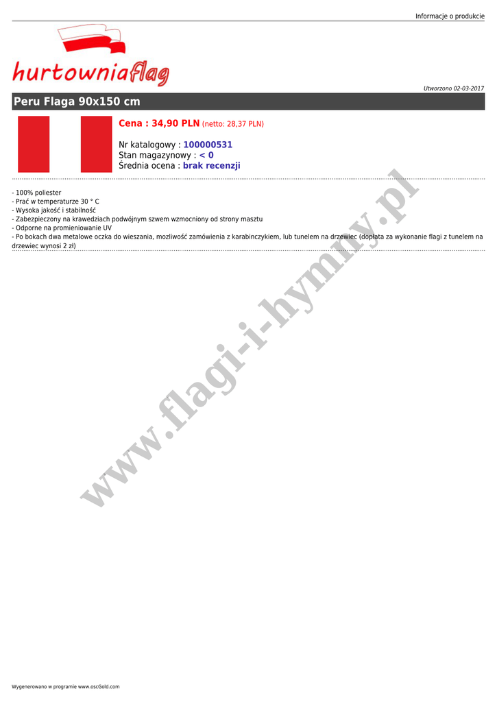 Informacje o produkcie Utworzono 02-03-2017 Peru Flaga 90x150 cm Cena : 34,90 PLN (netto: 28,37 PLN) Nr katalogowy : 100000531 Stan magazynowy : < 0 Średnia ocena : brak recenzji w w w .fl ag ii- hy m ny .p l - 100% poliester - Prać w temperaturze 30 ° C - Wysoka jakość i stabilność - Zabezpieczony na krawedziach podwójnym szwem wzmocniony od strony masztu - Odporne na promieniowanie UV - Po bokach dwa metalowe oczka do wieszania, mozliwość zamówienia z karabinczykiem, lub tunelem na drzewiec (dopłata za wykonanie flagi z tunelem na drzewiec wynosi 2 zł) Wygenerowano w programie www.oscGold.com
