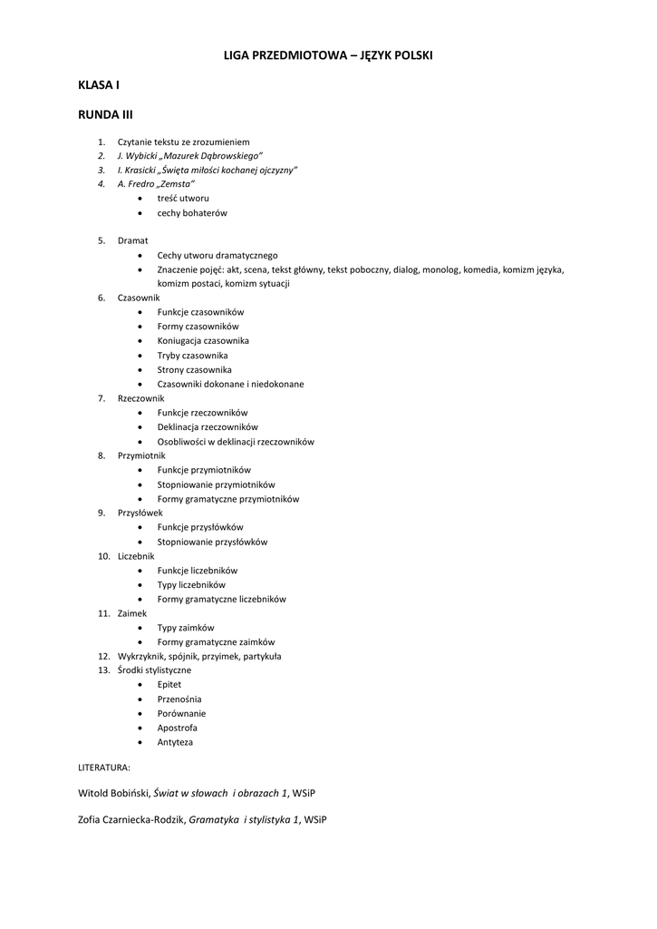 LIGA PRZEDMIOTOWA – JĘZYK POLSKI KLASA I RUNDA III