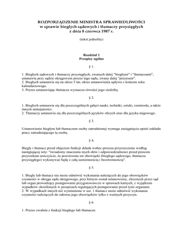 $ & ' $ ! ( " # ) ' * $ $ % + (tekst jednolity) Rozdział 1 Przepisy ogólne § 1. 1. Biegłych sądowych i tłumaczy przysięgłych, zwanych dalej "biegłymi" i "tłumaczami", ustanawia przy sądzie okręgowym prezes tego sądu, zwany dalej "prezesem". 2. Biegłych ustanawia się na okres 5 lat; okres ustanowienia upływa z końcem roku kalendarzowego. 3. Prezes ustanawiając tłumacza wyznacza również jego siedzibę. § 2. 1. Biegłych ustanawia się dla poszczególnych gałęzi nauki, techniki, sztuki, rzemiosła, a także innych umiejętności. 2. Tłumaczy ustanawia się dla poszczególnych języków obcych oraz dla języka migowego. § 3. Ustanowienie biegłym lub tłumaczem osoby zatrudnionej wymaga zasięgnięcia opinii zakładu pracy zatrudniającego tę osobę. § 4. Biegły i tłumacz przed objęciem funkcji składa wobec prezesa przyrzeczenie według następującej roty: "świadomy znaczenia mych słów i odpowiedzialności przed prawem przyrzekam uroczyście, że powierzone mi obowiązki (biegłego sądowego, tłumacza przysięgłego) wykonywać będę z całą sumiennością i bezstronnością". § 5. 1. Biegły lub tłumacz nie może odmówić wykonania należących do jego obowiązków czynności w okręgu sądu okręgowego, przy którym został ustanowiony, zleconych przez sąd lub organ prowadzący postępowanie przygotowawcze w sprawach karnych, z wyjątkiem wypadków określonych w przepisach regulujących postępowanie przed tymi organami. 2. W wypadkach innych niż wymienione w ust. 1 tłumacz może odmówić wykonania czynności należących do zakresu jego obowiązków tylko z ważnych przyczyn. § 6. 1. Prezes zwalnia z funkcji biegłego lub tłumacza: 1) na jego prośbę, 2) jeżeli biegły lub tłumacz utracił warunki do pełnienia tej funkcji albo gdy zostanie stwierdzone, że w chwili ustanowienia warunkom tym nie odpowiadał i nadal im nie odpowiada. 2. Prezes może zwolnić z funkcji biegłego lub tłumacza z ważnych powodów, w szczególności jeżeli nienależycie wykonuje on swoje czynności. 3. W wypadkach, o których mowa w ust. 1 pkt 2 lub w ust. 2, prezes jest obowiązany wysłuchać biegłego lub tłumacza, chyba że jest to niemożliwe. § 7. O ustanowieniu biegłym lub tłumaczem osoby zatrudnionej oraz zwolnieniu z tej funkcji prezes zawiadamia zakład pracy. § 8. 1. Prezes prowadzi listy biegłych sądowych - według poszczególnych gałęzi nauki, techniki, sztuki, rzemiosła, a także innych umiejętności, i listy tłumaczy przysięgłych - według języków, dla których zostali ustanowieni. Prezes prowadzi również wykazy biegłych sądowych i wykazy tłumaczy przysięgłych na kartach założonych dla każdego biegłego lub tłumacza; w listach i wykazach podaje się adres biegłego i termin, do którego został ustanowiony, oraz adres biura tłumacza, a także inne dane dotyczące specjalizacji. 2. Prezes skreśla z listy biegłego lub tłumacza oraz usuwa jego kartę z wykazu: 1) z chwilą zwolnienia z funkcji, 2) w razie śmierci, 3) z upływem okresu ustanowienia biegłego, chyba że nastąpiło ponowne ustanowienie. 3. Listy biegłych sądowych i tłumaczy przysięgłych są dostępne dla zainteresowanych w sekretariatach sądowych. W szczególności listy te udostępnia się stronom, uczestnikom postępowania oraz organom prowadzącym postępowanie przygotowawcze w sprawach karnych i sądom wojskowym. § 9. W styczniu każdego roku prezes podaje do wiadomości sądom rejonowym w okręgu sądu okręgowego oraz Ministerstwu Sprawiedliwości listy biegłych sądowych i tłumaczy przysięgłych, a także zawiadamia niezwłocznie o każdej zmianie listy oraz o wszczęciu wobec tych osób postępowania karnego albo o ubezwłasnowolnienie. § 10. Wykazy biegłych sądowych i tłumaczy przysięgłych prowadzi się według ustalonych wzorów. § 11. Biegłemu i tłumaczowi przysługuje za wykonanie czynności wynagrodzenie w wysokości określonej odrębnymi przepisami. Rozdział 2 Biegli sądowi § 12. 1. Biegłym może być ustanowiona osoba, która: 1) korzysta z pełni praw cywilnych i obywatelskich, 2) ukończyła 25 lat życia, 3) posiada teoretyczne i praktyczne wiadomości specjalne w danej gałęzi nauki, techniki, sztuki, rzemiosła, a także innej umiejętności, dla której ma być ustanowiona, 4) daje rękojmię należytego wykonywania obowiązków biegłego, 5) wyrazi zgodę na ustanowienie jej biegłym. 2. Posiadanie wiadomości specjalnych powinno być wykazane dokumentami lub innymi dowodami. Ocena, czy posiadanie wiadomości specjalnych zostało dostatecznie wykazane, należy do prezesa. § 13. W razie potrzeby ustanowienia biegłego, prezes może w szczególności zwrócić się do właściwych stowarzyszeń lub organizacji zawodowych, przedsiębiorstw państwowych, instytucji, szkół wyższych oraz urzędów państwowych o wskazanie osób posiadających teoretyczne i praktyczne wiadomości specjalne w danej gałęzi nauki, techniki, sztuki, rzemiosła, a także innych umiejętności. § 14. Ustanowienie biegłym uprawnia po złożeniu przyrzeczenia do wydawania opinii na zlecenie sądu lub organu prowadzącego postępowanie przygotowawcze w sprawach karnych w zakresie tej gałęzi nauki, techniki, sztuki, rzemiosła, a także innych umiejętności, dla której ustanowienie nastąpiło. Biegły wydając opinię używa tytułu biegłego sądowego z oznaczeniem specjalności oraz sądu okręgowego, przy którym został ustanowiony. § 15. 1. Biegły jest obowiązany niezwłocznie zawiadomić prezesa o: 1) każdej zmianie swego adresu, 2) zamierzonej przerwie w wykonywaniu czynności przez okres dłuższy niż 3 miesiące. 2. Jeżeli okoliczności wymienione w ust. 1 powstaną w czasie wykonywania przez biegłego czynności zleconej przez organ, o którym mowa w § 5 ust. 1, biegły zawiadamia o nich ten organ; w odniesieniu do okoliczności wymienionych w ust. 1 pkt 2 zawiadomienia należy dokonać także wówczas, gdy