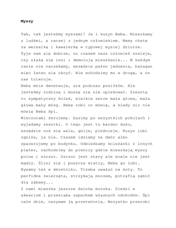 Myszy Tak, tak jesteśmy myszami! Ja i kuzyn Beba. Mieszkamy z ludźmi, a raczej z jednym człowiekiem. Mamy chatę za wersalką i kawalerkę w typowej mysiej dziurze. Żyje nam się dobrze, no czasem nasz człowiek szaleje, czy złażą się inni i demolują mieszkanie... W każdym razie nie narzekamy, wszędzie pełno jedzenia, bałagan więc łatwo się ukryć. Nie wchodzimy mu w drogę, a on nas toleruje. Beba mnie denerwuje, sra podczas posiłków. Ale jesteśmy rodziną i muszę się nim opiekować. Zresztą to sympatyczny koleś, wielkie serce mała głowa, mała głowa mały mózg. Beba robi co mówię, a kiedy nic nie mówię Beba śpi. Wieczorami żerujemy. Łazimy po wszystkich pokojach i wyjadamy resztki. O tego jest tu bardzo dużo, wszędzie coś się wala, gnije, pleśnieje. Kuzyn lubi zgniłe, ja nie. Czasem idziemy na dwór albo spacerujemy po budynku. Odwiedzamy koleżanki z innych pięter, zachodzimy do piwnicy gdzie mieszkają myszy polne i szczur. Szczur jest stary ale wcale nie jest mądry. Ślini się i puszcza wiatry, Beba go lubi. Bywamy też w śmietniku. Trzeba uważać na koty. To perfidne zwierzęta, strzykają moczem, potrafią zabić dla zabawy... Z nami mieszka jeszcze świnka morska. Siedzi w akwarium i przesiąka zapachem własnych odchodów. Śpi całe dnie, nazywam ją przetwórnią. Wszystko przerobi na gówno. Lubimy ją z Bebą, zawsze ma jakiś dowcip w zanadrzu, kiedy nie śpi to nawet fajna świnka. Nasz człowiek to degenerat, myślę, że zaawansowany alkoholik. Pali też trawę i łyka prochy. Lubimy go! Kiedyś mnie złapał... Trzymał w dłoni i opowiadał, potem dmuchał mi po pysku jakimś jointem. Zaczęliśmy się śmiać, zupełnie zgłupiałem. Przesiedziałem z nim do rana, spaliliśmy cały worek tego zielska. Jak wracałem do domu to miałem paranoje. Że kot wlazł przez lufcik i chce mnie zabić... Beba też miał kontakt z narkotykami. Wychlał resztki coli, coś tam musiało być... Biegał po norze i ryczał. Potem walił głową w ścianę i krzyczał żeby zdjąć mu to z głowy. Nad ranem przycichł, oglądał sobie łapy i kostki. Stygmaty! Wydarł się. Zaczął płakać, a potem dał mi w mordę i gdzieś pobiegł. Znalazłem go w łazience. Bał się wyjść z za rury. Twierdził, ze w wannie siedzi śmierć. Sprawdziłem, były tylko wirki. Takie robaczki mieszkające w odpływach. One też śmierci nie widziały, choć mówiły, że kręci się tu jakiś pająk. No tak, pająk dla wirków to śmierć... Do naszego człowieka przychodzi kobieta. Dziwnie pachnie ale nas lubi. Zostawia nam zawsze coś dobrego na spodeczku. My też ją lubimy. Kobiety to takie dziwne istoty. Karmią myszy... Ona zawsze jak przychodzi to wrzeszczy na naszego człowieka i bije go czym popadnie. Na nim to nie robi wrażenia, z reguły jest nieprzytomny. Potem kobieta wlecze go pod prysznic i cały czas na niego krzyczy. Kiedy on śpi w brodziku, ona trochę sprząta i przygotowuje jakieś fajne jedzonko. Potem się kochają. Mamy wtedy z Bebą niezły ubaw. Kobiety cały czas krzyczą, wolę myszki, one są spokojniejsze i nie biją. Jak kobieta wychodzi, nasz człowiek płacze i przeprasza. Nie wiem za co, może to taki ich rytuał? Przychodzi do niego też facet, przynosi mu prochy. Facet nie krzyczy, przytula go. Potem się kochają. Wtedy mamy jeszcze większy ubaw. Obaj krzyczą. Beba nie lubi pedałów i demonstracyjnie sra na środku pokoju. Mi to nie przeszkadza, znam nawet takiego jednego. To jamnik z parteru, nic do mnie nie ma. Może jestem zbyt mały albo brzydki... Potem facet wychodzi, nasz nie płacze. Wciąga podarki przyniesione przez tego drugiego. Jednak ja zostaję przy myszkach! Mam nawet przyjaciółkę. Myszka japońska. Jest trochę zboczona, bo jej właścicielka też jest zboczona. Rozbiera się, kładzie na wyrku i karze mojej małej biegać sobie po cyckach, brzuchu i tam niżej. Lubi dotyk zimnych małych łapek na ciele... Ja też. Po za tym moja myszka jest super, mogłaby się kochać cały dzień. Odwiedza naszego człowieka też wiele innych osób. Staruszek z chłopcami. Za każdym razem inni chłopcy. Zamykają się wtedy z tym naszym w sypialni i bawią, robią zdjęcia, piją szampana. A na koniec kochają się wszyscy. Nie mamy wtedy ubawu. Beba twierdzi, że to zboczeniec i demonstracyjnie szcza do cukiernicy. Beba mimo, że ciężko myśli, ma niewzruszone zasady moralne. Mnie nie oburzają wybryki naszego człowieka, obserwuję sobie. Mój kuzyn natomiast kipi ze złości. Gdyby był choć trochę większy to z pewnością coś by człowiekowi zrobił. Przychodzą też znajomi. Robią tzw. prywatkę. Wtedy spotykają się na przykład ta kobieta, z którą się kocha, facet od prochów, staruszek i wszyscy razem piją, wciągają prochy i palą. A potem kochają w różnych konfiguracjach. Nas też zapraszają, to znaczy dmuchają dymem z faji w naszą norę. Beba wkurza się wtedy. Ale co może zrobić? A ja to lubię, pić też z resztą lubię. Stawiają na spodeczku trochę browarku, czy winko i klaszczą kiedy wychodzę i piję. Z resztą nie mogę się powstrzymać, wiem, że to ludzie, że nie powinienem im ufać, wykazywać pewną dzikość. Jednak na widok spodeczka robię się najbardziej oswojoną myszą na świecie... Mieszkamy w bloku. To nie to co wieś, czy willa... Blok jest bezpieczniejszy. Nie szwendają się koty, ptaki drapieżne, psy. Znamy tu wszystkich. Łazimy sobie przewodami wentylacyjnymi, podglądamy z za wywietrzników, spod szaf. Mamy swoje sympatie i wrogów. Prowadzimy intensywne, ciekawe życie. Znamy rodzinę z ostatniego piętra. U nich zawsze słychać krzyki. To tak zwana rodzina patologiczna. Kobiecina, sześcioro dzieci i konkubent oprawca. Awantury słychać w całym budynku. Ten konkubent to bydlę, bije babę i dzieci. Sypia z najstarszą córką, a potem idzie siedzieć. Wtedy kobiecina odżywa, znajduje nowego konkubenta. Ten nosi ją na rękach, daje podar