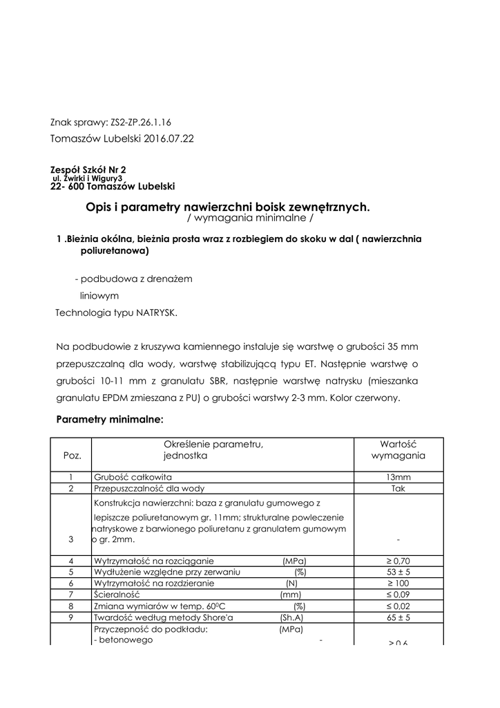 Znak sprawy: ZS2-ZP.26.1.16 Tomaszów Lubelski 2016.07.22 Zespół Szkół Nr 2 ul. Żwirki i Wigury3 22- 600 Tomaszów Lubelski Opis i parametry nawierzchni boisk zewnętrznych. / wymagania minimalne / 1 .Bieżnia okólna, bieżnia prosta wraz z rozbiegiem do skoku w dal ( nawierzchnia poliuretanowa) - podbudowa z drenażem liniowym Technologia typu NATRYSK. Na podbudowie z kruszywa kamiennego instaluje się warstwę o grubości 35 mm przepuszczalną dla wody, warstwę stabilizującą typu ET. Następnie warstwę o grubości 10-11 mm z granulatu SBR, następnie warstwę natrysku (mieszanka granulatu EPDM zmieszana z PU) o grubości warstwy 2-3 mm. Kolor czerwony. Parametry minimalne: Poz. 1 2 Określenie parametru, jednostka Wartość wymagania Grubość całkowita Przepuszczalność dla wody 13mm Tak Konstrukcja nawierzchni: baza z granulatu gumowego z 3 4 5 6 7 8 9 lepiszcze poliuretanowym gr. 11mm; strukturalne powleczenie natryskowe z barwionego poliuretanu z granulatem gumowym o gr. 2mm. Wytrzymałość na rozciąganie Wydłużenie względne przy zerwaniu Wytrzymałość na rozdzieranie Ścieralność Zmiana wymiarów w temp. 600C Twardość według metody Shore'a Przyczepność do podkładu: - betonowego (MPa) (%) (N) (mm) (%) (Sh.A) (MPa) ≥ 0,70 53 ± 5 ≥ 100 ≤ 0,09 ≤ 0,02 65 ± 5 - ≥ 0,6 10 asfaltobetonowego z mieszaniny kruszywa kwarcowego, granulatu gumowego i spoiwa ≥ 0,5 ≥ 0,5 PU Współczynnik tarcia kinetycznego powierzchni: 11 - w stanie suchym ≥ 0,35 - w stanie ≥ 0,30 mokrym 12 Odporność na uderzenie: powierzchnia odcisku kulki, (mm2) 550 ± 50 bez zmian - stan powierzchni po badaniu Odporność na działanie zmiennych cykli hydrotechnicznych oceniona: - przyrostem masy, 13 (%) zewnętrznego ≤ 0,70 - zmianą wyglądu bez zmian Nawierzchnia o 14 jednorodnej strukturze i barwie, mieszanina granulatu Wygląd zewnętrzny nawierzchni EPDM i spoiwa PU Mrozoodporność oceniona: 15 przyrostem masy, - ≤ 0,80 (%) bez zmian - zmianą wyglądu zewnętrznego Odporność na starzenie w warunkach sztucznych, 16 5 oceniona zmianą barwy po naświetleniu, bez zmian (nr skali szarej) 17 Masa powierzchniowa nawierzchni (kg/m2) 9,7 ± 0,3 2.Boiska wielofunkcyjne, boisko do piłki siatkowej, do piłki ręcznej (nawierzchnia poliuretanowa) - podbudowa z drenażem liniowym (wg projektu) Nawierzchnie typu EPDM- gładkie, przepuszczalne dla wody wykonane dwuwarstwowo. Dolna warstwa z granulatu SBR min. 8 mm, górna warstwa wykonana z kolorowego granulatu EPDM min. 8 mm. Nawierzchnie tego typu należy wykonywać na 35 mm podbudowie elastycznej typu ET. Kolor boiska czerwony. Parametry minimalne: Poz. 1 2 3 4 5 6 7 8 9 10 Określenie parametru, jednostka Wartość wymagania Grubość całkowita Konstrukcja nawierzchni: baza z granulatu gumowego SBR o frakcji 13mm z lepiszczem poliuretanowym gr. warstwy 8mm; warstwa nawierzchniowa z barwnego granulatu EPDM o frakcji 1-3mm z lepiszczem poliuretanowym gr. warstwy 8mm. Wytrzymałość na rozciąganie (MPa) Wydłużenie względne przy zerwaniu (%) Wytrzymałość na rozdzieranie (N) Ścieralność (mm) Twardość według metody Shore'a (Sh.A) Przyczepność do podkładu: (MPa) - betonowego asfaltobetonowego -z mieszaniny kruszywa kwarcowego, granulatu gumowego i spoiwa PU Współczynnik tarcia kinetycznego powierzchni: -w stanie suchym - w stanie mokrym Odporność na uderzenie: - powierzchnia odcisku kulki, (mm2) - stan powierzchni po badaniu 16mm - ≥ 0,60 ≥ 65 ≥ 100 ≤ 0,09 55 ± 10 ≥ 0,60 ≥ 0,50 ≥ 0,50 ≥ 0,35 ≥ 0,30 550 ± 50 bez zmian 3. Boiska wielofunkcyjne, boisko do piłki siatkowej, do piłki ręcznej (nawierzchnia poliuretanowa) - podbudowa z drenażem liniowym (wg projektu) Nawierzchnie typu EPDM- gładkie, przepuszczalne dla wody wykonane dwuwarstwowo. Dolna warstwa z granulatu SBR min. 8 mm, górna warstwa wykonana z kolorowego granulatu EPDM min. 8 mm. Nawierzchnie tego typu należy wykonywać na 35 mm podbudowie elastycznej typu ET. Kolor boiska czerwony. Parametry minimalne: Poz. 1 2 3 4 5 6 7 Wartość Określenie parametru, jednostka wymagania Grubość całkowita Konstrukcja nawierzchni: baza z granulatu gumowego SBR o frakcji 13mm z lepiszczem poliuretanowym gr. warstwy 8mm; warstwa nawierzchniowa z barwnego granulatu EPDM o frakcji 1-3mm z lepiszczem poliuretanowym gr. warstwy 8mm. Wytrzymałość na rozciąganie (MPa) Wydłużenie względne przy zerwaniu (%) Wytrzymałość na rozdzieranie (N) Ścieralność (mm) Twardość według metody Shore'a (Sh.A) Przyczepność do podkładu: 16mm - ≥ 0,60 ≥ 65 ≥ 100 ≤ 0,09 55 ± 10 (MPa) 8 - betonowego asfaltobetonowego -z mieszaniny kruszywa kwarcowego, granulatu gumowego i spoiwa PU ≥ 0,60 ≥ 0,50 ≥ 0,50 9 Współczynnik tarcia kinetycznego powierzchni: stanie suchym Odporność na uderzenie: odcisku kulki, (mm2) - stan powierzchni po badaniu ≥ 0,35 ≥ 0,30 10 -w - w stanie mokrym - powierzchnia 550 ± 50 bez zmian Odporność na działanie zmiennych cykli hydrotechnicznych oceniona: 11 12 13 - przyrostem masy, - zmianą wyglądu zewnętrznego Mrozoodporność oceniona: przyrostem masy, - zmianą wyglądu zewnętrznego (%) ≤ 0,65 bez zmian - (%) Odporność na starzenie w warunkach sztucznych, (nr w skali szarej) ≤ 0,80 bez zmian 5 W celu potwierdzenia spełnienia przez wykonawców wymagań na oferowane nawierzchnie boisk zewnętrznych określonych przez Zamawiającego wymaga się złożenia następujących dokumentów: Dokumenty dotyczące nawierzchni poliuretanowej: 1. Certyfikat lub deklaracja zgodności z normą PN-EN 14877:2008,lub aprobata techniczna ITB , lub rekomendacja techniczna ITB , lub dokument równoważny. 2. Karta techniczna oferowanej nawierzchni, potwierdzona przez jej producenta. 3. Atest PZH lub równoważny dla oferowanej nawierzchni. 4. Autoryzacja producenta nawierzchni poliuretanowej, wystawiona dla wykonawcy na realizowaną inwestycję wraz z potwierdzeniem gwarancji udzielonej przez producenta na tą 