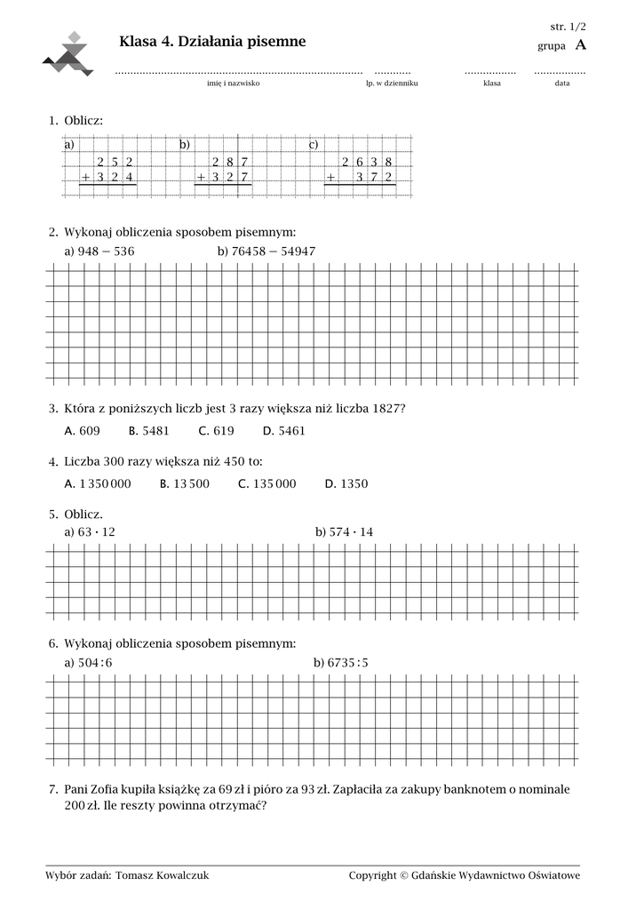 str. 1/2 Klasa 4. Działania pisemne grupa ............ ................. lp. w dzienniku klasa ................................................................................. imię i nazwisko A ................. data 1. Oblicz: a) b) 2 5 2 + 3 2 4 c) 2 8 7 + 3 2 7 + 2 6 3 8 3 7 2 2. Wykonaj obliczenia sposobem pisemnym: a) 948 − 536 b) 76458 − 54947 3. Która z poniższych liczb jest 3 razy większa niż liczba 1827? A. 609 B. 5481 C. 619 D. 5461 4. Liczba 300 razy większa niż 450 to: A. 1 350 000 B. 13 500 C. 135 000 D. 1350 5. Oblicz. a) 63 ⋅ 12 b) 574 ⋅ 14 6. Wykonaj obliczenia sposobem pisemnym: a) 504 : 6 b) 6735 : 5 7. Pani Zofia kupiła książkę za 69 zł i pióro za 93 zł. Zapłaciła za zakupy banknotem o nominale 200 zł. Ile reszty powinna otrzymać? Wybór zadań: Tomasz Kowalczuk 107684 Copyright © Gdańskie Wydawnictwo Oświatowe grupa A str. 2/2 8. Wykonano następujące mnożenie 3250 ⋅ 205. Oceń prawdziwość zdań. Wstaw znak X w odpowiednią kratkę. Otrzymano sześciocyfrową liczbę. prawda fałsz Wynik tego mnożenia jest większy od 4 mln. prawda fałsz Otrzymana liczba jest zakończona dwoma zerami. prawda fałsz 9. W sklepie Grafit jeden ołówek kosztuje 95 groszy, a zestaw składający się z pięciu takich ołówków — 4 zł. Pani Ala ma kupić 24 ołówki. Ile zapłaci, jeśli skorzysta z najtańszej opcji? O ile więcej kosztowałyby ołówki, gdyby kupiła je na sztuki? 10. Rodzice Ani i Wojtka kupili namiot za 666 zł, dwa materace po 59 zł, jeden materac za 83 zł i cztery śpiwory po 39 zł. Ile zapłacili za te zakupy? Wybór zadań: Tomasz Kowalczuk 107684 Copyright © Gdańskie Wydawnictwo Oświatowe str. 1/2 Klasa 4. Działania pisemne grupa ............ ................. lp. w dzienniku klasa ................................................................................. imię i nazwisko B ................. data 1. Oblicz: a) b) 3 7 4 + 2 1 5 c) 6 3 7 + 2 8 7 + 1 2 8 7 8 7 5 2. Wykonaj obliczenia sposobem pisemnym: a) 786 − 255 b) 57432 − 26216 3. Która z poniższych liczb jest 3 razy większa niż liczba 1743? A. 5129 B. 580 C. 5229 D. 581 4. Liczba 300 razy większa niż 550 to: A. 16 500 B. 1 650 000 C. 1650 D. 165 000 5. Oblicz. a) 81 ⋅ 19 b) 263 ⋅ 16 6. Wykonaj obliczenia sposobem pisemnym: a) 444 : 6 b) 8575 : 7 7. Pani Zofia kupiła książkę za 39 zł i pióro za 124 zł. Zapłaciła za zakupy banknotem o nominale 200 zł. Ile reszty powinna otrzymać? Wybór zadań: Tomasz Kowalczuk 107684 Copyright © Gdańskie Wydawnictwo Oświatowe grupa B str. 2/2 8. Wykonano następujące mnożenie 3950 ⋅ 805. Oceń prawdziwość zdań. Wstaw znak X w odpowiednią kratkę. Otrzymano sześciocyfrową liczbę. prawda fałsz Wynik tego mnożenia jest większy od 4 mln. prawda fałsz Otrzymana liczba jest zakończona dwoma zerami. prawda fałsz 9. W sklepie Grafit jeden ołówek kosztuje 85 groszy, a zestaw składający się z pięciu takich ołówków — 4 zł. Pani Ala ma kupić 23 ołówki. Ile zapłaci, jeśli skorzysta z najtańszej opcji? O ile więcej kosztowałyby ołówki, gdyby kupiła je na sztuki? 10. Rodzice Ani i Wojtka kupili namiot za 785 zł, dwa materace po 72 zł, jeden materac za 107 zł i cztery śpiwory po 47 zł. Ile zapłacili za te zakupy? Wybór zadań: Tomasz Kowalczuk 107684 Copyright © Gdańskie Wydawnictwo Oświatowe str. 1/2 Klasa 4. Działania pisemne grupa ............ ................. lp. w dzienniku klasa ................................................................................. imię i nazwisko C ................. data 1. Oblicz: a) b) 7 3 8 + 1 6 1 c) 4 8 9 + 2 7 3 + 2 5 7 9 8 4 8 2. Wykonaj obliczenia sposobem pisemnym: a) 839 − 615 b) 72536 − 40915 3. Która z poniższych liczb jest 3 razy większa niż liczba 1248? A. 3624 B. 419 C. 416 D. 3744 4. Liczba 200 razy większa niż 650 to: A. 13 000 000 B. 130 000 C. 260 000 D. 65 000 5. Oblicz. a) 61 ⋅ 17 b) 372 ⋅ 18 6. Wykonaj obliczenia sposobem pisemnym: a) 335 : 5 b) 8694 : 7 7. Pani Zofia kupiła książkę za 67 zł i pióro za 89 zł. Zapłaciła za zakupy banknotem o nominale 200 zł. Ile reszty powinna otrzymać? Wybór zadań: Tomasz Kowalczuk 107684 Copyright © Gdańskie Wydawnictwo Oświatowe grupa C str. 2/2 8. Wykonano następujące mnożenie 2350 ⋅ 305. Oceń prawdziwość zdań. Wstaw znak X w odpowiednią kratkę. Otrzymano siedmiocyfrową liczbę. prawda fałsz Wynik tego mnożenia jest mniejszy od 5 mln. prawda fałsz Otrzymana liczba jest zakończona jednym zerem. prawda fałsz 9. W sklepie Grafit jeden ołówek kosztuje 65 groszy, a zestaw składający się z pięciu takich ołówków — 3 zł. Pani Ala ma kupić 24 ołówki. Ile zapłaci, jeśli skorzysta z najtańszej opcji? O ile więcej kosztowałyby ołówki, gdyby kupiła je na sztuki? 10. Rodzice Ani i Wojtka kupili namiot za 945 zł, dwa materace po 64 zł, jeden materac za 102 zł i cztery śpiwory po 43 zł. Ile zapłacili za te zakupy? Wybór zadań: Tomasz Kowalczuk 107684 Copyright © Gdańskie Wydawnictwo Oświatowe str. 1/2 Klasa 4. Działania pisemne grupa ............ ................. lp. w dzienniku klasa ................................................................................. imię i nazwisko D ................. data 1. Oblicz: a) b) 3 2 8 + 2 7 1 c) 4 2 6 + 3 8 9 + 2 2 3 5 9 7 8 2. Wykonaj obliczenia sposobem pisemnym: a) 784 − 263 b) 57243 − 45621 3. Która z poniższych liczb jest 4 razy większa niż liczba 1568? A. 392 B. 6272 C. 390 D. 5042 4. Liczba 200 razy większa niż 550 to: A. 110 000 B. 10 000 C. 11 000 000 D. 220 000 5. Oblicz. a) 79 ⋅ 11 b) 482 ⋅ 17 6. Wykonaj obliczenia sposobem pisemnym: a) 294 : 6 b) 8665 : 5 7. Pani Zofia kupiła książkę za 73 zł i pióro za 99 zł. Zapłaciła za zakupy banknotem o nominale 200 zł. Ile reszty powinna otrzymać? Wybór zadań: Tomasz Kowalczuk 107684 Copyright © Gdańskie Wydawnictwo Oświatowe grupa D str. 2/2 8. Wykonano następujące mnożenie 