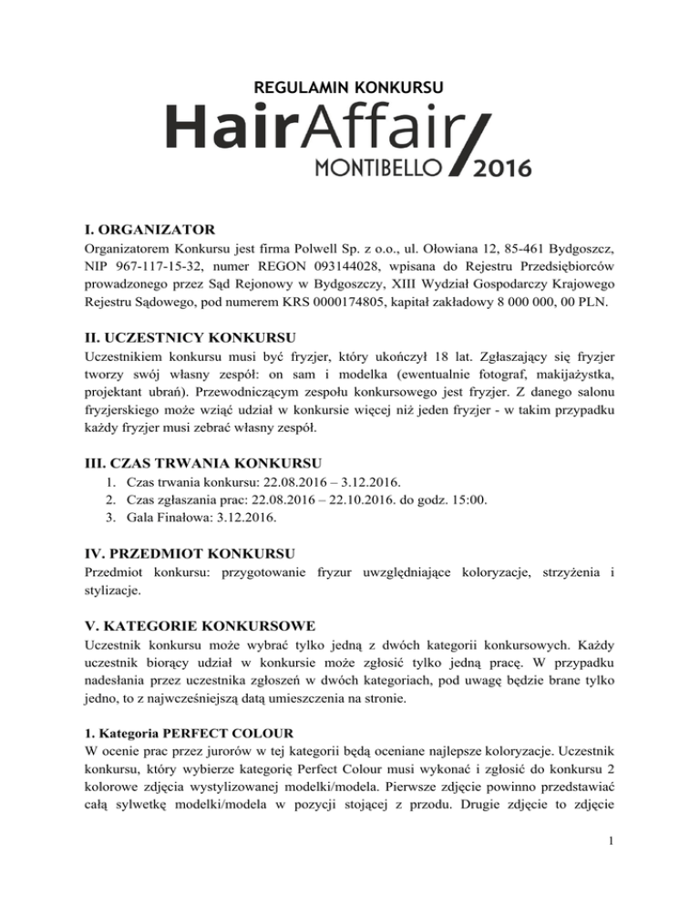 REGULAMIN KONKURSU I. ORGANIZATOR Organizatorem Konkursu jest firma Polwell Sp. z o.o., ul. Ołowiana 12, 85461 Bydgoszcz, NIP 9671171532, numer REGON 093144028, wpisana do Rejestru Przedsiębiorców prowadzonego przez Sąd Rejonowy w Bydgoszczy, XIII Wydział Gospodarczy Krajowego Rejestru Sądowego, pod numerem KRS 0000174805, kapitał zakładowy 8 000 000, 00 PLN. II. UCZESTNICY KONKURSU Uczestnikiem konkursu musi być fryzjer, który ukończył 18 lat. Zgłaszający się fryzjer tworzy swój własny zespół: on sam i modelka (ewentualnie fotograf, makijażystka, projektant ubrań). Przewodniczącym zespołu konkursowego jest fryzjer. Z danego salonu fryzjerskiego może wziąć udział w konkursie więcej niż jeden fryzjer w takim przypadku każdy fryzjer musi zebrać własny zespół. III. CZAS TRWANIA KONKURSU 1. Czas trwania konkursu: 22.08.2016 – 3.12.2016. 2. Czas zgłaszania prac: 22.08.2016 – 22.10.2016. do godz. 15:00. 3. Gala Finałowa: 3.12.2016. IV. PRZEDMIOT KONKURSU Przedmiot konkursu: przygotowanie fryzur uwzględniające koloryzacje, strzyżenia i stylizacje. V. KATEGORIE KONKURSOWE Uczestnik konkursu może wybrać tylko jedną z dwóch kategorii konkursowych. Każdy uczestnik biorący udział w konkursie może zgłosić tylko jedną pracę. W przypadku nadesłania przez uczestnika zgłoszeń w dwóch kategoriach, pod uwagę będzie brane tylko jedno, to z najwcześniejszą datą umieszczenia na stronie. 1..Kategoria PERFECT COLOUR W ocenie prac przez jurorów w tej kategorii będą oceniane najlepsze koloryzacje. Uczestnik konkursu, który wybierze kategorię Perfect Colour musi wykonać i zgłosić do konkursu 2 kolorowe zdjęcia wystylizowanej modelki/modela. Pierwsze zdjęcie powinno przedstawiać całą sylwetkę modelki/modela w pozycji stojącej z przodu. Drugie zdjęcie to zdjęcie 1 całościowe z profilu. Do wykonania fryzury nie mogą być użyte peruki, dopinki, nakrycia głowy oraz ozdoby. Do wykonania fryzury mogą być stosowane nieozdobne elementy techniczne, ukryte we włosach tj. wypełniacze, podkładki, gąbki, wsuwki, siatki. FRYZURA: koloryzacja/strzyżenie/stylizacja musi być wykonana osobiście przez fryzjera produktami Montibello: kolor może być wykonany dowolną techniką koloryzacji. Wykonując koloryzację, fryzjer może korzystać z produktów do dekoloryzacji Montibello. INNE: wymagana rozdzielczość zdjęć konkursowych:1080x1920 (300 dpi). Biorący udział w konkursie muszą wskazać produkty wykorzystane do przygotowania fryzury (numery farb, produkty do stylizacji i pielęgnacji). Ponadto zobowiązani są do wskazania osób współpracujących przy realizacji konkursowej tj. makijażysta, fotograf oraz projektant ubrań. Obligatoryjne jest również dołączenie w formularzu zgłoszeniowym zaświadczenia ze zgodą na wykorzystanie wizerunku modelki/modela. 2. Kategoria TOTAL LOOK W ocenie prac przez jurorów w tej kategorii będą punktowane: kolor, strzyżenie, stylizacja, make up, ubiór, czyli całokształt stylizacji. Uczestnik konkursu, który wybierze kategorię Total Look musi wykonać i zgłosić do konkursu 2 zdjęcia całkowicie wystylizowanej modelki/modela. Zdjęcie powinno przedstawiać całą sylwetkę modelki/modela w pozycji stojącej z przodu. Drugie zdjęcie to zdjęcie całościowe z profilu. W tej kategorii wiedzie prym zasada o zachowaniu maksymalnej kreatywności. Dopuszczalne są wszelkie techniczne i ozdobne dodatki: podkładki, gąbki, wsuwki, siatki, dopinki, przedłużane włosy, konstrukcje do podtrzymania formy i ozdoby. Niedopuszczalne są pełne peruki (zakrywające naturalne włosy) oraz nakrycia głowy (zasłaniające większość fryzury). FRYZURA: koloryzacja/strzyżenie/stylizacja musi być wykonana osobiście przez fryzjera produktami Montibello: kolor może być wykonany dowolną techniką koloryzacji. Wykonując koloryzację, fryzjer może korzystać z produktów do dekoloryzacji Montibello. INNE: wymagana rozdzielczość zdjęć konkursowych: 1080x1920 (300 dpi). Biorący udział w konkursie muszą wskazać produkty wykorzystane do wystylizowania fryzury (numery farb, produkty do stylizacji i pielęgnacji). Ponadto zobowiązani są do wskazania osób współpracujących przy realizacji tj. makijażysta, fotograf oraz projektant ubrań. Obligatoryjne jest również dołączenie w formularzu zgłoszeniowym zaświadczenia ze zgodą na wykorzystanie wizerunku modelki/modela. 3. Kategoria INSTAGRAM Zdjęcia do tej kategorii nie są zgłaszane oddzielnie. Prace w tej kategorii to prace finalistów 12 zgłoszeń. W przypadku kategorii Instagram w ocenie prac od etapu półfinału udział brać będą użytkownicy serwisu Instagram. Prace finałowe zostaną anonimowo umieszczone w serwisie Instagram na profilu organizatora @montibello_pl po ogłoszeniu listy finalistów, w opisie będą zwierały: #montibellohairaffair #montibello, nr pracy ustalony na podstawie daty zgłoszenia. O zwycięstwie zadecyduje liczba polubień pod daną pracą uzyskanych do 30.11.2016 do godz. 15:00. 2 4. Inne wymogi formalne Istnieje bezwzględny zakaz publikacji przez autorów zgłoszonych prac przed 30.11.2016. Opublikowanie pracy przed wyżej wymienionym terminem jest równoznaczne z dyskwalifikacją z konkursu. VI. ETAPY KONKURSU 1. Zgłoszenie 1. W dniach od 22.08.2016 do 22.10.2016 (do godz. 15.00) należy wypełnić formularz zgłoszeniowy na stronie internetowej www.hairaffair.montibello.pl. 2. W formularzu należy zaznaczyć jedną z dwóch kategorii, do której uczestnik nadsyła pracę i w której będzie oceniany przez komisję konkursową. 3. Podczas rejestracji fryzjer musi podać adres salonu, w którym pracuje. Adres będzie wykorzystany do późniejszego kontaktu w sprawie konkursu. W przypadku publikacji nazwy salonu przy pracy konkursowej, w dniu finału lub w mediach komunikowana będzie nazwa salonu umieszczona w formularzu w momencie zgłoszenia. 4. Po wypełnieniu wszystkich wymaganych pól na