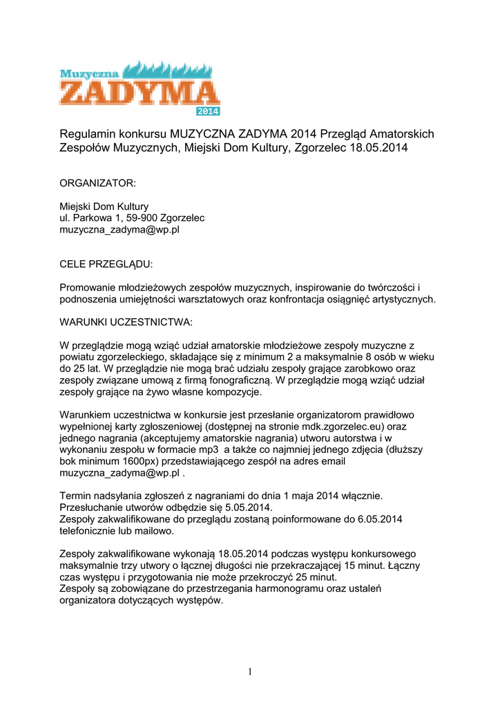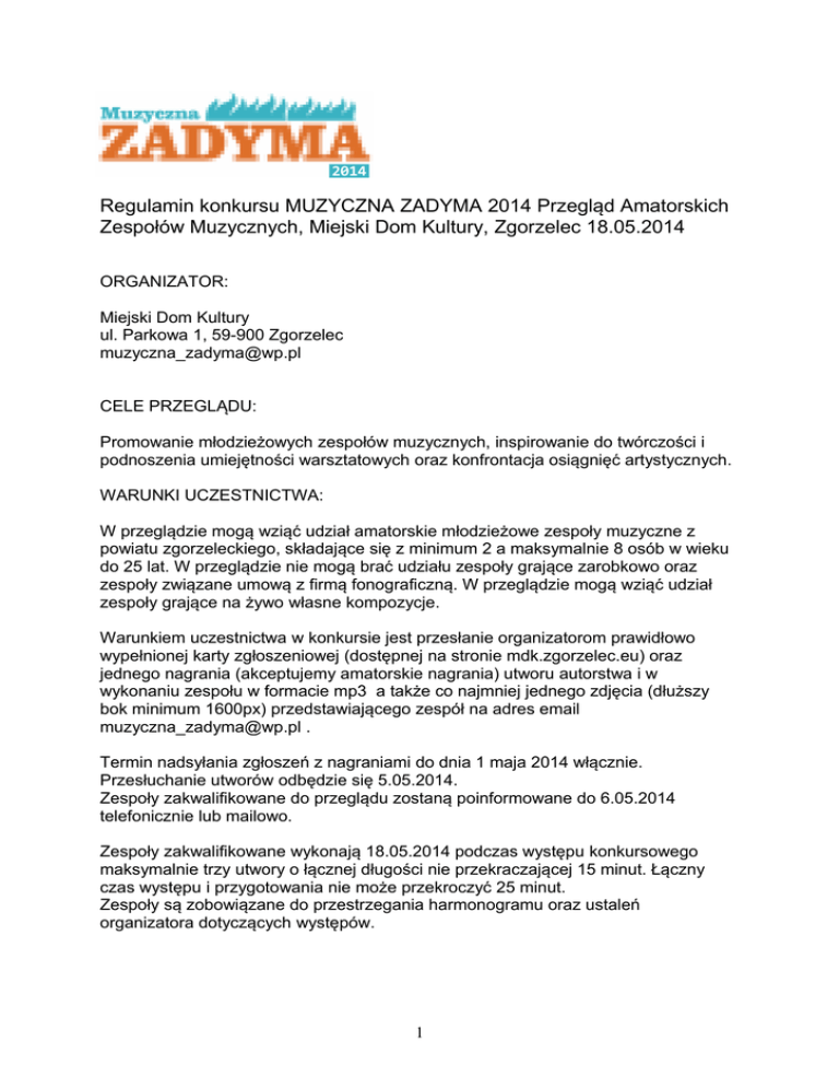 Regulamin konkursu MUZYCZNA ZADYMA 2014 Przegląd Amatorskich Zespołów Muzycznych, Miejski Dom Kultury, Zgorzelec 18.05.2014 ORGANIZATOR: Miejski Dom Kultury ul. Parkowa 1, 59-900 Zgorzelec [email protected] CELE PRZEGLĄDU: Promowanie młodzieżowych zespołów muzycznych, inspirowanie do twórczości i podnoszenia umiejętności warsztatowych oraz konfrontacja osiągnięć artystycznych. WARUNKI UCZESTNICTWA: W przeglądzie mogą wziąć udział amatorskie młodzieżowe zespoły muzyczne z powiatu zgorzeleckiego, składające się z minimum 2 a maksymalnie 8 osób w wieku do 25 lat. W przeglądzie nie mogą brać udziału zespoły grające zarobkowo oraz zespoły związane umową z firmą fonograficzną. W przeglądzie mogą wziąć udział zespoły grające na żywo własne kompozycje. Warunkiem uczestnictwa w konkursie jest przesłanie organizatorom prawidłowo wypełnionej karty zgłoszeniowej (dostępnej na stronie mdk.zgorzelec.eu) oraz jednego nagrania (akceptujemy amatorskie nagrania) utworu autorstwa i w wykonaniu zespołu w formacie mp3 a także co najmniej jednego zdjęcia (dłuższy bok minimum 1600px) przedstawiającego zespół na adres email [email protected] . Termin nadsyłania zgłoszeń z nagraniami do dnia 1 maja 2014 włącznie. Przesłuchanie utworów odbędzie się 5.05.2014. Zespoły zakwalifikowane do przeglądu zostaną poinformowane do 6.05.2014 telefonicznie lub mailowo. Zespoły zakwalifikowane wykonają 18.05.2014 podczas występu konkursowego maksymalnie trzy utwory o łącznej długości nie przekraczającej 15 minut. Łączny czas występu i przygotowania nie może przekroczyć 25 minut. Zespoły są zobowiązane do przestrzegania harmonogramu oraz ustaleń organizatora dotyczących występów. 1 Podczas występów konkursowych każdy z widzów będzie mógł oddać głos na najlepszy zespół. Trzy zespoły, które uzyskają największą liczbę głosów (oddanych na przygotowanych przez nas kartach) zostaną wyróżnione nagrodami finansowymi: 1 miejsce – 1000 zł 2 miejsce – 500 zł 3 miejsce – 300 zł Organizatorzy zapewniają nagłośnienie: przody, monitory, mikrofony, perkusję (bez talerzy), wzmacniacz basowy, wzmacniacz gitarowy. Organizator zastrzega sobie prawo do zmian w regulaminie. Organizator zastrzega sobie prawo do zmian w podziale nagród. Wszelkie kwestie sporne rozstrzyga organizator. Kontakt: Miejski Dom Kultury ul. Parkowa 1 59-900 Zgorzelec Tomasz Szeremeta: 727623507 [email protected] 2