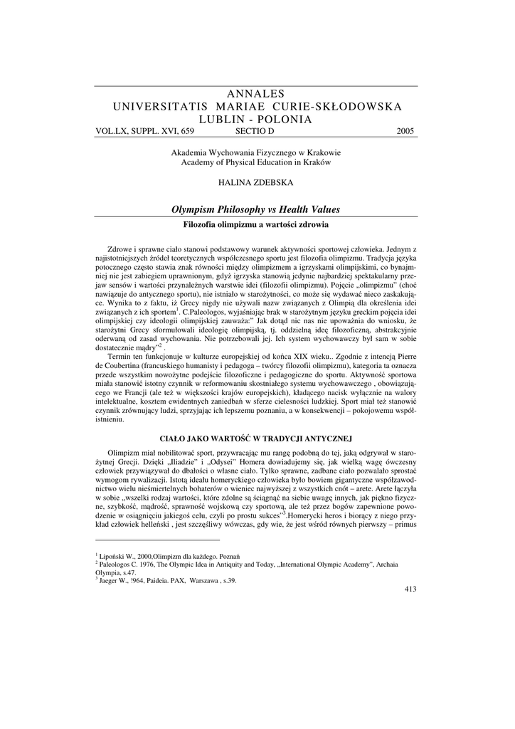 ANNALES UNIVERSITATIS MARIAE CURIE-SKŁODOWSKA LUBLIN - POLONIA VOL.LX, SUPPL. XVI, 659 SECTIO D 2005 Akademia Wychowania Fizycznego w Krakowie Academy of Physical Education in Kraków HALINA ZDEBSKA Olympism Philosophy vs Health Values Filozofia olimpizmu a wartości zdrowia Zdrowe i sprawne ciało stanowi podstawowy warunek aktywności sportowej człowieka. Jednym z najistotniejszych źródeł teoretycznych współczesnego sportu jest filozofia olimpizmu. Tradycja języka potocznego często stawia znak równości między olimpizmem a igrzyskami olimpijskimi, co bynajmniej nie jest zabiegiem uprawnionym, gdyż igrzyska stanowią jedynie najbardziej spektakularny przejaw sensów i wartości przynależnych warstwie idei (filozofii olimpizmu). Pojęcie „olimpizmu” (choć nawiązuje do antycznego sportu), nie istniało w starożytności, co może się wydawać nieco zaskakujące. Wynika to z faktu, iż Grecy nigdy nie używali nazw związanych z Olimpią dla określenia idei związanych z ich sportem1. C.Paleologos, wyjaśniając brak w starożytnym języku greckim pojęcia idei olimpijskiej czy ideologii olimpijskiej zauważa:” Jak dotąd nic nas nie upoważnia do wniosku, że starożytni Grecy sformułowali ideologię olimpijską, tj. oddzielną ideę filozoficzną, abstrakcyjnie oderwaną od zasad wychowania. Nie potrzebowali jej. Ich system wychowawczy był sam w sobie dostatecznie mądry”2 . Termin ten funkcjonuje w kulturze europejskiej od końca XIX wieku.. Zgodnie z intencją Pierre de Coubertina (francuskiego humanisty i pedagoga – twórcy filozofii olimpizmu), kategoria ta oznacza przede wszystkim nowożytne podejście filozoficzne i pedagogiczne do sportu. Aktywność sportowa miała stanowić istotny czynnik w reformowaniu skostniałego systemu wychowawczego , obowiązującego we Francji (ale też w większości krajów europejskich), kładącego nacisk wyłącznie na walory intelektualne, kosztem ewidentnych zaniedbań w sferze cielesności ludzkiej. Sport miał też stanowić czynnik zrównujący ludzi, sprzyjając ich lepszemu poznaniu, a w konsekwencji – pokojowemu współistnieniu. CIAŁO JAKO WARTOŚĆ W TRADYCJI ANTYCZNEJ Olimpizm miał nobilitować sport, przywracając mu rangę podobną do tej, jaką odgrywał w starożytnej Grecji. Dzięki „Iliadzie” i „Odysei” Homera dowiadujemy się, jak wielką wagę ówczesny człowiek przywiązywał do dbałości o własne ciało. Tylko sprawne, zadbane ciało pozwalało sprostać wymogom rywalizacji. Istotą ideału homeryckiego człowieka było bowiem gigantyczne współzawodnictwo wielu nieśmiertelnych bohaterów o wieniec najwyższej z wszystkich cnót – arete. Arete łączyła w sobie „wszelki rodzaj wartości, które zdolne są ściągnąć na siebie uwagę innych, jak piękno fizyczne, szybkość, mądrość, sprawność wojskową czy sportową, ale też przez bogów zapewnione powodzenie w osiągnięciu jakiegoś celu, czyli po prostu sukces”3.Homerycki heros i biorący z niego przykład człowiek helleński , jest szczęśliwy wówczas, gdy wie, że jest wśród równych pierwszy – primus 1 Lipoński W., 2000,Olimpizm dla każdego. Poznań Paleologos C. 1976, The Olympic Idea in Antiquity and Today, „International Olympic Academy”, Archaia Olympia, s.47. 3 Jaeger W., !964, Paideia. PAX, Warszawa , s.39. 2 413 inter pares. W okresie pokoju zamiłowanie do współzawodnictwa znajduje swoje odbicie w agonach sportowych, stanowiących okazję do wykazywania się sprawnością fizyczną i mistrzowskim posługiwaniem się bronią, odpornością na zmęczenie, przebiegłością w walce.Kontynuacją tradycji okresu achajskiego były igrzyska w starożytnej Grecji, które poza programem sportowym, połączone były z kultem religijnym i zawodami artystycznymi. Największą sławę i autorytet społeczny uzyskały igrzyska odbywające się co cztery lata na Peloponezie, w miejscowości Olimpia w Elidzie. Były one wyrazem ideału platońskiej kalokagatii, w którym zdrowe i sprawne ciało w połączeniu z walorami moralnymi, miało stanowić rezultat oddziaływań wychowawczych. Kalos – to synonim doskonałości fizycznej, przymiotów ciała ludzi świetnie ukształtowanych do wysiłku wojennego i agonistyki sportowej. Przymiotnik agathos był określeniem człowieka doskonałego pod względem intelektu i charakteru. „Szlachetny i odkrywczy ideał fizycznego piękna i fizycznej doskonałości, i na jego przykładzie formułujący się postulat moralnego piękna i doskonałości duchowej (...) to trwałe wartości, jakie grecka agonistyka wniosła do skarbca ogólnoludzkiej kultury4. WARTOŚCI ZDROWIA I CIAŁA W COUBERTINOWSKIEJ WIZJI OLIMPIZMU Kalokagatia (podobnie jak ekecheiria -zasada pokoju bożego oraz arete i szlachetny agon), wywarła największy wpływ na Coubertinowską wizję olimpizmu. „Pierwszą, najbardziej istotną cechą zarówno antycznego, jak i nowożytnego olimpizmu jest dążenie do tego, aby stał się on kultem, religią. Antyczny atleta czcił swoich bogów modelując ciało przy pomocy ćwiczeń, podobnie jak to czyni z posągiem rzeźbiarz. Postępując podobnie, współczesny sportowiec rozsławia swoją ojczyznę, swoją rasę, swój sztandar5. Twórca olimpizmu postrzegał nowoczesnych atletów jako pewnego rodzaju elitę, wyróżniającą cię walorami ciała. „ Ruchowi olimpijskiemu – towarzyszy kształtowanie się arystokracji, elity pochodzenia egalitarnego, określonej jedynie przewagą ciała i właściwościami fizycznymi podniesionymi do określonego poziomu wolą doskonalenia się”6 – pisał. Realizacja ideału kalokagatii zakładała troskę o piękne, harmonijnie ukształtowane ludzkie ciało. Kanony piękna, któremu bezwzględnie towarzyszyć miała wzniosłość i czystość moralna tworzyli artyści. Antyczny stadion nauczył Greków traktowania nagiego ciała w sposób naturalny. Pod wpływem Pitagorejczyków (dla których piękno- to właśn