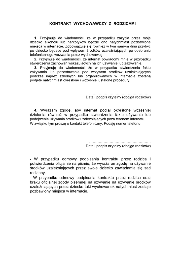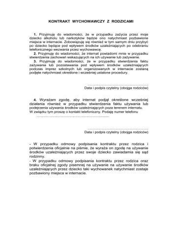 KONTRAKT WYCHOWAWCZY Z RODZICAMI 1. Przyjmuję do wiadomości, że w przypadku zażycia przez moje dziecko alkoholu lub narkotyków będzie ono natychmiast pozbawione miejsca w internacie. Zobowiązuję się również w tym samym dniu przybyć po dziecko będące pod wpływem środków uzależniających po odebraniu telefonicznego wezwania przez wychowawcę. 2. Przyjmuję do wiadomości, że internat powiadomi mnie w przypadku stwierdzenia zachowań wskazujących na ich używanie lub zażywanie. 3. Przyjmuję do wiadomości, że w przypadku stwierdzenia faktu zażywania lub pozostawania pod wpływem środków uzależniających podczas imprez szkolnych lub organizowanych w internacie zostaną podjęte natychmiast określone i wcześniej ustalone procedury. …………………………………………… Data i podpis czytelny (obojga rodziców) 4. Wyrażam zgodę, aby internat podjął określone wcześniej działania również w przypadku stwierdzenia faktu używania lub podejrzenia używania środków uzależniających poza terenem internatu. W związku tym proszę o kontakt telefoniczny. Podaję numer telefonu ………………………………………………........ …………………………………………… Data i podpis czytelny (obojga rodziców) - W przypadku odmowy podpisania kontraktu przez rodzica i potwierdzenia oficjalnie na piśmie, że wyraża on zgodę na używanie środków uzależniających przez swoje dziecko zawiadamia się sąd rodzinny. - W przypadku odmowy podpisania kontraktu przez rodzica oraz braku oficjalnej zgody pisemnej na używanie na używanie środków uzależniających przez dziecko taki wychowanek natychmiast zostaje pozbawiony miejsca w internacie. KONTRAKT Z WYCHOWANKIEM Ja …………………………………………….., zobowiązuję się podczas mojego zamieszkania w internacie szkolnym: - nie brać oraz nie sprzedawać żadnych środków uzależniających na terenie i w budynku internatu - nie przychodzić do internatu pod wpływem środków uzależniających - nie spożywać i nie częstować kolegów i koleżanek środkami uzależniającymi podczas dyskotek, imienin, urodzin /m. ln. osiemnastek/ i innych imprez urządzanych w internacie - nie posiadać na terenie internatu żadnych środków uzależniających - uczęszczać na grupowe zajęcia profilaktyczne. Jeśli nie dotrzymam warunków umowy, liczę się z następującymi konsekwencjami: - powiadomienie rodziców o złamanym kontrakcie - utratą przywilejów …………………………………… …………………………………… …………………………………… - powiadomienie Dyrektora Szkoły - natychmiastowym pozbawieniem miejsca w internacie - zawiadomieniem policji …………………………………………… / Czytelny podpis wychowanka / OŚWIADCZENIE RODZICÓW 1/ Oświadczam, że syn/córka* ............................................ będzie/nie będzie* przyjeżdżać w każdą niedzielę do internatu. W przypadku sytuacji innej niż zadeklarowana zobowiązuję się poinformować wychowawcę telefonicznie /nr tel. 84 686 21 57/ w niedzielę po godz. 16:30 2/ Każdą nieobecność syna/córki* w internacie potwierdzam telefonicznie w dniu tej nieobecności, a także tą nieobecność poświadczam pisemnie w dniu powrotu do internatu NUMER TELEFONU DO INTERNATU 84 686 21 57 ................................................................................. Czytelny podpis opiekunów • niepotrzebne skreślić