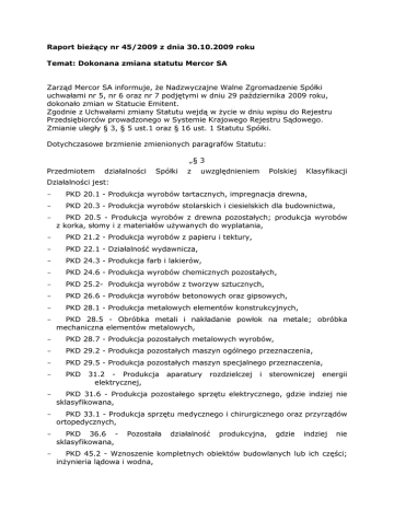 Raport bieŜący nr 45/2009 z dnia 30.10.2009 roku Temat: Dokonana zmiana statutu Mercor SA Zarząd Mercor SA informuje, Ŝe Nadzwyczajne Walne Zgromadzenie Spółki uchwałami nr 5, nr 6 oraz nr 7 podjętymi w dniu 29 października 2009 roku, dokonało zmian w Statucie Emitent. Zgodnie z Uchwałami zmiany Statutu wejdą w Ŝycie w dniu wpisu do Rejestru Przedsiębiorców prowadzonego w Systemie Krajowego Rejestru Sądowego. Zmianie uległy § 3, § 5 ust.1 oraz § 16 ust. 1 Statutu Spółki. Dotychczasowe brzmienie zmienionych paragrafów Statutu: „§ 3 Przedmiotem działalności Spółki z uwzględnieniem Polskiej Klasyfikacji Działalności jest: - PKD 20.1 - Produkcja wyrobów tartacznych, impregnacja drewna, - PKD 20.3 - Produkcja wyrobów stolarskich i ciesielskich dla budownictwa, - PKD 20.5 - Produkcja wyrobów z drewna pozostałych; produkcja wyrobów z korka, słomy i z materiałów uŜywanych do wyplatania, - PKD 21.2 - Produkcja wyrobów z papieru i tektury, - PKD 22.1 - Działalność wydawnicza, - PKD 24.3 - Produkcja farb i lakierów, - PKD 24.6 - Produkcja wyrobów chemicznych pozostałych, - PKD 25.2- Produkcja wyrobów z tworzyw sztucznych, - PKD 26.6 - Produkcja wyrobów betonowych oraz gipsowych, - PKD 28.1 - Produkcja metalowych elementów konstrukcyjnych, - PKD 28.5 - Obróbka metali i nakładanie powłok na metale; obróbka mechaniczna elementów metalowych, - PKD 28.7 - Produkcja pozostałych metalowych wyrobów, - PKD 29.2 - Produkcja pozostałych maszyn ogólnego przeznaczenia, - PKD 29.5 - Produkcja pozostałych maszyn specjalnego przeznaczenia, - PKD 31.2 - Produkcja elektrycznej, aparatury rozdzielczej i sterowniczej energii - PKD 31.6 - Produkcja pozostałego sprzętu elektrycznego, gdzie indziej nie sklasyfikowana, - PKD 33.1 - Produkcja sprzętu medycznego i chirurgicznego oraz przyrządów ortopedycznych, - PKD 36.6 sklasyfikowana, - PKD 45.2 - Wznoszenie kompletnych obiektów budowlanych lub ich części; inŜynieria lądowa i wodna, Pozostała działalność produkcyjna, gdzie indziej nie - PKD 45.3 - Wykonywanie instalacji budowlanych, - PKD 45.4 - Wykonywanie robót budowlanych wykończeniowych, - PKD 45.5 - Wynajem sprzętu budowlanego i burzącego z obsługą operatorską, PKD 51.4 - SprzedaŜ hurtowa artykułów uŜytku domowego i osobistego, PKD 51.5 - SprzedaŜ hurtowa półproduktów i odpadów pochodzenia nierolniczego oraz złomu, - PKD 51.8 - SprzedaŜ hurtowa maszyn, sprzętu i dodatkowego wyposaŜenia, - PKD 51.9 - Pozostała sprzedaŜ hurtowa, - PKD 52.6 - Handel detaliczny poza siecią sklepową, - PKD 63.1 - Przeładunek, magazynowanie, i przechowywanie towarów, - PKD 63.3 - Działalność związana z turystyką, - PKD 65.2 – Pozostałe pośrednictwo finansowe, - PKD 70.1 - Obsługa nieruchomości na własny rachunek, - PKD 71.3 - Wynajem maszyn i urządzeń, - PKD 73.1 - Prace badawczo – rozwojowe w dziedzinie nauk przyrodniczych i technicznych, - PKD 74.15 - Działalność holdingów, - PKD 74.2 - Działalność w zakresie architektury, inŜynierii, - PKD 74.3 - Badania i analizy techniczne, - PKD 74.4 – Reklama, - PKD 74.7 - Sprzątanie i czyszczenie obiektów, - PKD 74.8 - Pozostała działalność komercyjna, - PKD 93.0 - Pozostała działalność usługowa.” „§5 1. Kapitał zakładowy Spółki wynosi 3.558.758 (trzy miliony pięćset pięćdziesiąt osiem tysięcy siedemset pięćdziesiąt osiem) złotych i dzieli się na 14.235.032 (czternaście milionów dwieście trzydzieści pięć tysięcy trzydzieści dwa) akcji o wartości nominalnej 25 (słownie: dwadzieścia pięć) groszy kaŜda akcja. W Spółce wydano: 1) 12.454.544 (dwanaście milionów czterysta pięćdziesiąt cztery tysiące pięćset czterdzieści cztery) akcje zwykłe na okaziciela serii AA o numerach od AA1 do AA 12.454.544, 2) 1.780.488 (jeden milion siedemset osiemdziesiąt tysięcy czterysta osiemdziesiąt osiem) akcji zwykłych na okaziciela serii BB o numerach od BB 1 do BB 1.780.488.” „§16 1. Rokiem obrotowym Spółki jest rok kalendarzowy, z tym, Ŝe pierwszy rok obrotowy kończy się z dniem 31 grudnia 2004 roku.” Brzmienie paragrafów Statutu po zmianie: „§ 3 „Przedmiotem działalności gospodarczej Spółki jest według Polskiej Klasyfikacji Działalności w brzmieniu przyjętym rozporządzeniem Rady Ministrów z dnia 24 grudnia 2007 roku w sprawie Polskiej Klasyfikacji Działalności (PKD) (Dz. U. nr 251, poz. 1885 ze zm.): 1. Produkcja wyrobów tartacznych – 16.10.Z, 2. Produkcja gotowych parkietów podłogowych – 16.22.Z, 3. Produkcja pozostałych wyrobów stolarskich i ciesielskich dla budownictwa – 16.23.Z, 4. Produkcja pozostałych wyrobów z drewna; produkcja wyrobów z korka, słomy i materiałów uŜywanych do wyplatania – 16.29.Z, 5. Produkcja wyrobów z papieru i tektury – 17.2, 6. Pozostałe drukowanie – 18.12.Z, 7. Produkcja farb, lakierów i podobnych powłok, farb drukarskich i mas uszczelniających – 20.30.Z, 8. Produkcja pozostałych wyrobów chemicznych – 20.5, 9. Produkcja pozostałych wyrobów z gumy – 22.19.Z, 10. Produkcja wyrobów z tworzyw sztucznych – 22.2, 11. Produkcja pozostałych technicznych wyrobów ceramicznych – 23.44.Z, 12. Produkcja wyrobów z betonu, cementu i gipsu – 23.6, 13. Produkcja wyrobów formowanych na zimno – 24.33.Z, 14. Produkcja konstrukcji metalowych i ich części – 25.11.Z, 15. Produkcja metalowych elementów stolarki budowlanej – 25.12.Z, 16. Obróbka metali i nakładanie powłok na metale; obróbka mechaniczna elementów metalowych – 25.6, 17. Produkcja wyrobów noŜowniczych i sztućców – 25.71.Z, 18. Produkcja narzędzi – 25.73.Z, 19. Produkcja pozostałych gotowych wyrobów metalowych – 25.9, 20. Produkcja elektronicznych elementów i obwodów drukowanych – 26.1, 21. Produkcja sprzętu (tele)komunikacyjnego – 26.30.Z, 22. Produkcja instrumentów i nawigacyjnych – 26.51.Z, i przyrządów pomiarowych, 23. Produkcja urządzeń nap