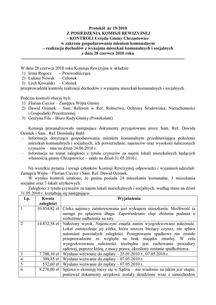 Protokół nr 19/2010 Z POSIEDZENIA KOMISJI REWIZYJNEJ - KONTROLI Urzędu Gminy Chrząstowice w zakresie gospodarowania mieniem komunalnym – realizacja dochodów z wynajmu mieszkań komunalnych i socjalnych z dnia 28 czerwca 2010 roku W dniu 28 czerwca 2010 roku Komisja Rewizyjna w składzie: 1) Irena Rogocz – Przewodnicząca 2) Łukasz Nowak – Członek 3) Lech Kowalski – Członek przeprowadziła kontrolę realizacji dochodów z wynajmu mieszkań komunalnych i socjalnych. Podczas kontroli obecni byli: 1) Florian Ciecior – Zastępca Wójta Gminy 2) Dawid Ozimek – Sam. Referent w Ref. Rolnictwa, Ochrony Środowiska, Nieruchomości i Gospodarki Przestrzennej 3) Grażyna Fila – Biuro Rady Gminy (Protokolant) Komisja przeanalizowała następujące dokumenty przygotowane przez Sam. Ref. Dawida Ozimek i Sam . Ref. Dominikę Buhl: - Informacja dotycząca gospodarowania mieniem komunalnym przedstawiająca położenie mieszkań komunalnych i socjalnych, ich powierzchnie, najemców oraz wysokość naliczonych czynszów – stan na dzień 24.06.2010 r. - Informacja na temat zaległości z tytułu czynszów za najem lokali mieszkalnych będących własnością gminy Chrząstowice – saldo na dzień 31.05.2010 r. Na wszelkie pytania i uwagi członków Komisji Rewizyjnej odpowiedzi i wyjaśnień udzielali: Zastępca Wójta – Florian Ciecior i Sam. Ref. Dawid Ozimek. W wyniku kontroli ustalono, że gmina posiada 24 mieszkania komunalne, 3 mieszkania socjalne oraz 7 lokali użytkowych. Zaległości z tytułu czynszów za najem lokali mieszkalnych i socjalnych, według stanu na dzień 31.05.2010 r. kształtują się następująco: Lp. Kwota Wyjaśnienia zaległości 1 10.454,82 zł Córka najemcy zainteresowana jest wykupem mieszkania. Możliwość ta nastąpi po spłaceniu długu. Zapowiedziano chęć złożenia podania o rozłożenie zadłużenia na raty. 2 14.832,58 zł Nałożony wyrok. Najemczyni zmarła zanim wyegzekwowano należność. Lokal zamieszkuje jej córka, która uiszcza bieżący czynsz, nie spłaca natomiast powstałych zaległości. Postępowanie spadkowe nie zostało przeprowadzone ze względu na brak majątku zmarłej. W celu wyegzekwowania należności niezbędne jest zachowanie procedury sądowej, poprzez którą, z mocy prawa, określony zostanie spadkobierca. 3 7.700,10 zł Wysłano wezwanie do zapłaty – 25.01.2010 r., 07.05.2010 r. 4 399,85 zł Wysłano wezwanie do zapłaty – 07.05.2010 r. 5 532,60 zł Wysłano wezwanie do zapłaty – 07.05.2010 r. 6 8.276,00 zł Sprawa o eksmisję toczy się w Sądzie – nie wiadomo na jakim jest etapie, ponieważ dokumenty urzędowe zostały skradzione wraz z samochodem 7 7.349,90 zł 8 9 266,00 zł 12.626,67 zł 10 11 12 5.463,68 zł 2.755,80 zł 145,40 zł 13 6.061,56 zł radcy prawnego Urzędu Gminy, podjęto starania związane z uzyskaniem dokumentów z Sądu. W związku z planowanym remontem dachu budynku w Dębskiej Kuźni, podjęte zostaną działania zmierzające do przeniesienia lokatora do wolnego mieszkania socjalnego w Dąbrowicach Sprawa o eksmisję toczy się w Sądzie – nie wiadomo na jakim jest etapie, ponieważ dokumenty urzędowe zostały skradzione wraz z samochodem radcy prawnego Urzędu Gminy, podjęto starania związane z uzyskaniem dokumentów z Sądu Wysłano wezwanie do zapłaty – 07.05.2010 r. Wysłano wezwanie do zapłaty – 28.06.2010 r. – najemca został przeniesiony z mieszkania komunalnego w Dębskiej Kuźni do mieszkania socjalnego w Dąbrowicach, gdzie w dalszym ciągu nie uiszcza czynszu. Ośrodek Pomocy Społecznej w Chrząstowicach sprawuje nad nim pieczę, gdyż stwarza uciążliwość dla otoczenia, nie dba o swoje i wspólne mienie. Umowa o najem mieszkania socjalnego dobiega końca, lecz urząd gminy nie ma możliwości wyeksmitowania lokatora z mieszkania socjalnego. Zwolnione mieszkanie w Dębskiej Kuźni mieści się w budynku przedszkolnym i docelowo planuje się je zaadoptować na potrzeby przedszkola – niezbędny jest kapitalny remont. Wysłano wezwanie do zapłaty – 25.01.2010 r., 07.05.2010 r. Wysłano wezwanie do zapłaty – 25.01.2010 r., 07.05.2010 r. Wysłano wezwanie do zapłaty – 25.01.2010 r. – zgodnie z zapewnieniem najemcy zaległość zostanie uregulowana z kolejną ratą czynszu. Z byłym najemcą nie można nawiązać żadnego kontaktu, prawdopodobnie przebywa za granicą, mieszkanie zostało sprzedane, przygotowywane są dokumenty do umorzenia zaległości Razem 76.864,96 zł Zastępca Wójta Florian Ciecior poinformował, że wysokość naliczanego czynszu uzależniona jest od metrażu i standardu mieszkań (centralne ogrzewanie, media, łazienka itp.). Ze względu na trudną sytuację materialną i nieporadność życiową, lokatorzy mieszkania komunalnego w Dąbrowicach zostali całkowicie zwolnieni z czynszu. Zastępca Wójta wyjaśnił ponadto, że najemcy zalegający z płatnością czynszu to w większości osoby bezrobotne długotrwale niepracujące. W przypadku stwierdzenia zaległości wysyłane są wezwania do zapłaty. Nieuregulowanie należności w terminie wskazanym w ostatecznym wezwaniu do zapłaty, kwalifikuje sprawę do skierowania do sądu. Z drugiej zaś strony gmina ma obowiązek zapewnienia lokalu dla mieszkańców zameldowanych na jej terenie. Ponieważ na terenie gminy są tylko 3 mieszkania socjalne, nie ma możliwości wyeksmitowania z mieszkań komunalnych wszystkich lokatorów nie uiszczających czynszu. Członkowie Komisji wystąpili z propozycją zwiększenia ilości mieszkań socjalnych poprzez przekształcenie obecnych mieszkań komunalnych, za które lokatorzy nie regulują należności czynszowych. WNIOSKI I ZALECENIA POKOTROLNE: 1) Na bieżąco monitorować stan spraw o eksmisję dochodzonych drogą sądową. 2) Przeanalizować stan mieszkań komunalnych, za które lokatorzy zalegają z płatnościami czynszu (z wyłączeniem lokali możliwych do zbycia na rzecz najemców po uregulowaniu zadłużenia) i przygot