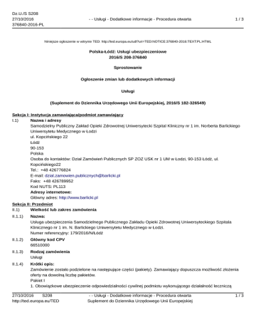 Dz.U./S S208 27/10/2016 376840-2016-PL - - Usługi - Dodatkowe informacje - Procedura otwarta 1/3 Niniejsze ogłoszenie w witrynie TED: http://ted.europa.eu/udl?uri=TED:NOTICE:376840-2016:TEXT:PL:HTML Polska-Łódź: Usługi ubezpieczeniowe 2016/S 208-376840 Sprostowanie Ogłoszenie zmian lub dodatkowych informacji Usługi (Suplement do Dziennika Urzędowego Unii Europejskiej, 2016/S 182-326549) Sekcja I: Instytucja zamawiająca/podmiot zamawiający I.1) Nazwa i adresy Samodzielny Publiczny Zakład Opieki Zdrowotnej Uniwersytecki Szpital Kliniczny nr 1 im. Norberta Barlickiego Uniwersytetu Medycznego w Łodzi ul. Kopcińskiego 22 Łódź 90-153 Polska Osoba do kontaktów: Dział Zamówień Publicznych SP ZOZ USK nr 1 UM w Łodzi, 90-153 Łódź, ul. Kopcińskiego22 Tel.: +48 426776824 E-mail: [email protected] Faks: +48 426789952 Kod NUTS: PL113 Adresy internetowe: Główny adres: http://www.barlicki.pl Sekcja II: Przedmiot II.1) Wielkość lub zakres zamówienia II.1.1) Nazwa: Usługa ubezpieczenia Samodzielnego Publicznego Zakładu Opieki Zdrowotnej Uniwersyteckiego Szpitala Klinicznego nr 1 im. N. Barlickiego Uniwersytetu Medycznego w Łodzi. Numer referencyjny: 179/2016/N/Łódź II.1.2) Główny kod CPV 66510000 II.1.3) Rodzaj zamówienia Usługi II.1.4) Krótki opis: Zamówienie zostało podzielone na następujące części (pakiety). Zamawiający dopuszcza możliwość złożenia oferty na dowolną liczbę pakietów. Pakiet I 1. Obowiązkowe ubezpieczenie odpowiedzialności cywilnej podmiotu wykonującego działalność leczniczą 27/10/2016 S208 http://ted.europa.eu/TED - - Usługi - Dodatkowe informacje - Procedura otwarta Suplement do Dziennika Urzędowego Unii Europejskiej 1/3 Dz.U./S S208 27/10/2016 376840-2016-PL - - Usługi - Dodatkowe informacje - Procedura otwarta 2/3 2. Dobrowolne ubezpieczenie odpowiedzialności cywilnej z tyt. prowadzenia działalności medycznej 3. Dobrowolne ubezpieczenie odpowiedzialności cywilnej z tyt. prowadzonej działalności i posiadanego mienia Pakiet II 1. Ubezpieczenie mienia od ognia i innych żywiołów 2. Ubezpieczenie szyb i przedmiotów szklanych od stłuczenia 3. Ubezpieczenie mienia od kradzieży z włamaniem i rabunku oraz ryzyka dewastacji Pakiet III 1. Ubezpieczenie sprzętu elektronicznego medycznego w systemie wszystkich ryzyk. Sekcja VI: Informacje uzupełniające VI.5) Data wysłania niniejszego ogłoszenia: 25/10/2016 VI.6) Numer pierwotnego ogłoszenia Numer ogłoszenia w Dz.Urz. UE – OJ/S: 2016/S 182-326549 Sekcja VII: Zmiany VII.1) Informacje do zmiany lub dodania VII.1.2) Tekst, który należy poprawić w pierwotnym ogłoszeniu Numer sekcji: VI.3 Zamiast: Wadium- Oferta winna być zabezpieczona wadium do dnia 27.10.2016 do godz. 12:00 w wysokości: Pakiet I 15 000 PLN, Pakiet II 680 PLN, Pakiet III 300 PLN. Powinno być: Wadium- Oferta winna być zabezpieczona wadium do dnia 15.11.2016 do godz. 12:00 w wysokości: Pakiet I 15 000 PLN, Pakiet II 680 PLN, Pakiet III 300 PLN. Numer sekcji: IV.2.2 Zamiast: Data 27/10/2016 Czas lokalny: 12:00. Powinno być: Data 15/11/2016 Czas lokalny: 12:00. Numer sekcji: IV.2.7 Zamiast: Warunki otwarcia ofert Data: 27/10/2016 Czas lokalny: 12:10 Miejsce: SPZOZ Uniwersytecki Szpital Kliniczny nr 1 im. N. Barlickiego Uniwersytetu Medycznego w Łodzi. 90-153 Łódź, ul. Kopcińskiego 22 Budynek Administracyjny, Klatka K, pokój 201 (sekretariat techniczno-finansowy). Powinno być: Warunki otwarcia ofert Data: 15/112016 Czas lokalny: 12:10 Miejsce: SPZOZ Uniwersytecki Szpital Kliniczny nr 1 im. N. Barlickiego Uniwersytetu Medycznego w Łodzi. 90-153 Łódź, ul. Kopcińskiego 22 Budynek Administracyjny, Klatka K, pokój 201 (sekretariat techniczno-finansowy). 27/10/2016 S208 http://ted.europa.eu/TED - - Usługi - Dodatkowe informacje - Procedura otwarta Suplement do Dziennika Urzędowego Unii Europejskiej 2/3 Dz.U./S S208 27/10/2016 376840-2016-PL - - Usługi - Dodatkowe informacje - Procedura otwarta 3/3 Numer sekcji: IV.2.6 Zamiast: Oferta musi zachować ważność do 27/12/2016. Powinno być: Oferta musi zachować ważność do 15/01/2017. VII.2) Inne dodatkowe informacje: 27/10/2016 S208 http://ted.europa.eu/TED - - Usługi - Dodatkowe informacje - Procedura otwarta Suplement do Dziennika Urzędowego Unii Europejskiej 3/3