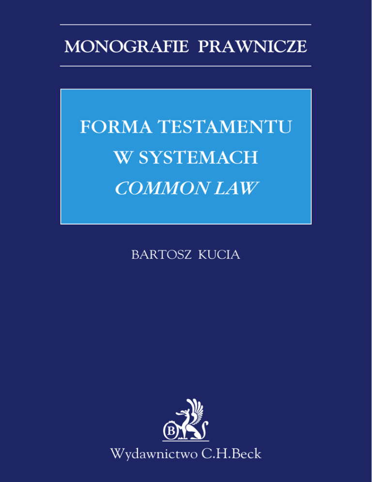 MONOGRAFIE PRAWNICZE Forma testamentu w systemach common law Bartosz Kucia Wydawnictwo C.H.Beck MONOGRAFIE PRAWNICZE BARTOSZ KUCIA • FORMA TESTAMENTU W SYSTEMACH COMMON LAW Polecamy nasze najnowsze publikacje z tej serii: Grzegorz Klich ZMIANA UMOWY W SPRAWIE ZAMÓWIENIA PUBLICZNEGO Małgorzata Sieradzka CHARAKTER PRAWNY POSTĘPOWANIA I RODZAJE ROZSTRZYGNIĘĆ WYDAWANYCH W POSTĘPOWANIU W SPRAWACH PRAKTYK NARUSZAJĄCYCH ZBIOROWE INTERESY KONSUMENTÓW Konrad Jan Marciniak MORSKIE ZASOBY GENETYCZNE W PRAWIE MIĘDZYNARODOWYM Sebastian Koczur AKSJOLOGIA ODPOWIEDZIALNOŚCI MATERIALNEJ PRACOWNIKA Marcin Kamiński MECHANIZM I GRANICE WERYFIKACJI SĄDOWOADMINISTRACYJNEJ A NORMY PRAWA ADMINISTRACYJNEGO I ICH KONKRETYZACJA Andrzej Olaś UMORZENIE PROCESU CYWILNEGO www.ksiegarnia.beck.pl FORMA TESTAMENTU W SYSTEMACH COMMON LAW BARTOSZ KUCIA WYDAWNICTWO C.H.BECK WARSZAWA 2016 Wydawca: Natalia Adamczyk Redakcja: Ewa Sadowska Publikacja dofinansowana przez Uniwersytet Śląski w Katowicach. © Wydawnictwo C.H.Beck 2016 Wydawnictwo C.H.Beck Sp. z o.o. ul. Bonifraterska 17, 00-203 Warszawa Skład i łamanie: Wydawnictwo C.H.Beck Druk i oprawa: Elpil, Siedlce ISBN 978-83-255-9143-4 ISBN e-book 978-83-255-9144-1 Spis treści Przedmowa ................................................................................................................. VII Wykaz skrótów .......................................................................................................... IX Wykaz literatury ....................................................................................................... XVII Wykaz orzecznictwa ................................................................................................ XXXV Rozdział I. Wprowadzenie ..................................................................................... § 1. Uzasadnienie wyboru tematu .................................................................. § 2. Zadanie badawcze i założenia metodologiczne .................................... § 3. Zakres terytorialny badań naukowych .................................................. § 4. Zakres przedmiotowy badań naukowych ............................................. 1 1 5 7 10 Rozdział II. Źródła prawa materialnego dotyczącego formy testamentu w systemach common law ................................................................................. § 1. Klasyfikacja źródeł prawa ........................................................................ § 2. Prawo międzynarodowe ........................................................................... § 3. Statute law i common law ......................................................................... § 4. Equity law, zwyczaje ................................................................................. § 5. Tzw. books of authority ........................................................................... § 6. Uwarunkowania historyczne a obecny stan prawny (działania zmierzające do zmiany rygoru formalnego testamentu i ujednolicenia prawa państw common law) ......................................... 13 13 14 20 25 27 27 Rozdział III. Podstawowe pojęcia dla rozważań o formie testamentu ........ § 1. Testament (last will and testament) ....................................................... § 2. Zamiar testowania (animus testandi) a przesłanki ważności testamentu w systemach common law ................................................... § 3. Formuła treści testamentu (form) .......................................................... § 4. Wymagania formalne (formalities) ......................................................... I. Pojęcie ................................................................................................ II. Funkcje ............................................................................................... § 5. Formalizm (formalism) ............................................................................. I. Pojęcie ................................................................................................ II. Kwestie terminologiczne ................................................................. 39 39 Rozdział IV. Formy testamentu ........................................................................... § 1. Rodzaje form testamentu występujących w prawach państw common law ................................................................................................ 69 49 55 57 57 57 63 63 65 69 V Spis treści § 2. Zwykłe formy testamentu ........................................................................ I. Formal will ........................................................................................ 1. Uwagi wprowadzające .............................................................. 2. Wymóg pisemności (writing) .................................................. 3. Podpis testatora ......................................................................... 4. Wymagania związane z udziałem świadków testamentu ... II. Testament holograficzny ................................................................ III. Testament notarialny ...................................................................... IV. Testament międzynarodowy .......................................................... V. Testament elektroniczny ................................................................. § 3. Szczególne formy testamentu .................................................................. Rozdział V. Formalizm rozwiązań prawnych dotyczących formy testamentu w systemach common law na przykładzie prawa amerykańskiego .................................................................................................. § 1. Uwagi ogólne ............................................................................................. § 2. Działalność orzecznicza ........................................................................