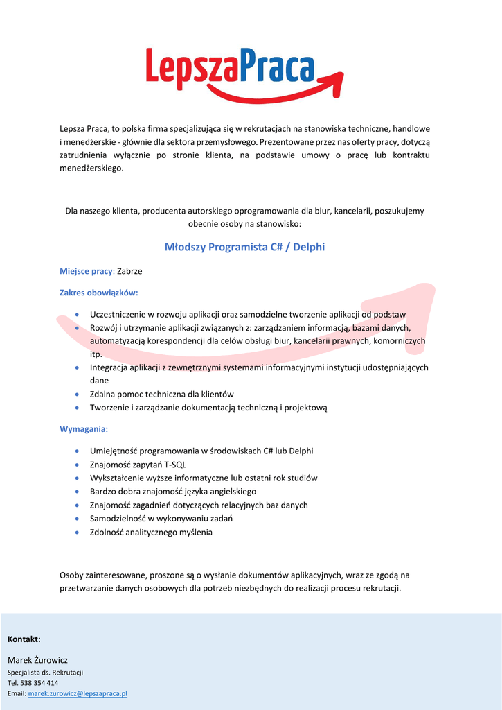 Lepsza Praca, to polska firma specjalizująca się w rekrutacjach na stanowiska techniczne, handlowe i menedżerskie - głównie dla sektora przemysłowego. Prezentowane przez nas oferty pracy, dotyczą zatrudnienia wyłącznie po stronie klienta, na podstawie umowy o pracę lub kontraktu menedżerskiego. Dla naszego klienta, producenta autorskiego oprogramowania dla biur, kancelarii, poszukujemy obecnie osoby na stanowisko: Młodszy Programista C# / Delphi Miejsce pracy: Zabrze Zakres obowiązków: Uczestniczenie w rozwoju aplikacji oraz samodzielne tworzenie aplikacji od podstaw Rozwój i utrzymanie aplikacji związanych z: zarządzaniem informacją, bazami danych, automatyzacją korespondencji dla celów obsługi biur, kancelarii prawnych, komorniczych itp. Integracja aplikacji z zewnętrznymi systemami informacyjnymi instytucji udostępniających dane Zdalna pomoc techniczna dla klientów Tworzenie i zarządzanie dokumentacją techniczną i projektową Wymagania: Umiejętność programowania w środowiskach C# lub Delphi Znajomość zapytań T-SQL Wykształcenie wyższe informatyczne lub ostatni rok studiów Bardzo dobra znajomość języka angielskiego Znajomość zagadnień dotyczących relacyjnych baz danych Samodzielność w wykonywaniu zadań Zdolność analitycznego myślenia Osoby zainteresowane, proszone są o wysłanie dokumentów aplikacyjnych, wraz ze zgodą na przetwarzanie danych osobowych dla potrzeb niezbędnych do realizacji procesu rekrutacji. Kontakt: Marek Żurowicz Specjalista ds. Rekrutacji Tel. 538 354 414 Email: [email protected]