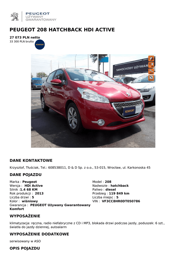 PEUGEOT 208 HATCHBACK HDI ACTIVE 27 073 PLN netto 33 300 PLN brutto DANE KONTAKTOWE Krzysztof, Tłuściak, Tel.: 608538011, D & D Sp. z o.o., 53-015, Wrocław, ul. Karkonoska 45 DANE POJAZDU Marka : Peugeot Wersja : HDi Active Silnik :1.4 68 KM Rok produkcji : 2013 Liczba drzwi : 5 Kolor : wiśniowy Gwarancja : PEUGEOT Używany Gwarantowany Komfort Model : 208 Nadwozie : hatchback Paliwo : diesel Przebieg : 119 849 km Liczba miejsc : 5 VIN : VF3CC8HR0DT050786 WYPOSAŻENIE klimatyzacja: ręczna, radio niefabryczne z CD i MP3, blokada drzwi podczas jazdy, poduszek: 6 szt., światła do jazdy dziennej, autoalarm WYPOSAŻENIE DODATKOWE serwisowany w ASO OPIS POJAZDU PAKIET KORZYŚCI: Dlaczego warto kupić auto w D&D PEUGEOT UŻYWANY GWARANTOWANY: -Bo jesteśmy liderem w sprzedaży samochodów Peugeot Używany Gwarantowany na DOLNYM ŚLĄSKU -Dokładnie sprawdzamy stan techniczny, -W każdym samochodzie GWARANTUJEMY przebieg, -Na fakturze sprzedaży zawsze wpisujemy przebieg i wystawiamy na pełną wartość auta -Auto zawsze posiada aktualne badanie techniczne i ważne ubezpieczenie OC -Klient zawsze otrzymuje komplet dokumentów do rejestracji -Gwarantujemy jazdę próbną i profesjonalną obsługą -Dla nas najważniejszy jest Klient KREDYT- dla osób fizycznych i firm do 84 miesięcy, kredyt do 100% wartości auta LEASING – minimalne wpłaty, wykup 1%, od 24-84 miesięcy UBEZPIECZENIA- atrakcyjne PAKIETY DEALERSKIE ODKUPUJEMY SAMOCHODY WSZYSTKICH MAREK ZA GOTÓWKE, ROZLICZAMY BEZGOTÓWKOWO PRZY ZAKUPIE AUTA UŻYWANEGO LUB NOWEGO. Niniejsze ogłoszenie nie stanowi oferty handlowej w myśl art.66, paragraf 1.Kodeksu Cywilnego. Sprzedawca nie odpowiada za ewentualne błędy lub nieaktualność ogłoszenia ABS, Airbag 6 sztuk: poduszki powietrzne czołowe i boczne dla kierowcy i pasażera, kurtyny powietrzne, ESP - system stabilizacji toru jazdy, AFU - system wspomagania hamowania, Elektryczne podnoszenie szyb, przód, Felgi stalowe 15 z ogumieniem 185/65, Komputer pokładowy, Immobilizer, Gniazdo 12V, Fotel kierowcy z mech. regulacją wysokości, Klamki zewnętrzne w kolorze nadwozia, Klimatyzacja, Klamki wewnętrzne chromowane, Kolumna kierownicy z regulacją w dwóch płaszczyznach, Lusterka boczne ze zintegrowanymi kierunkowskazami, regulowane elektrycznie i ogrzewane, Lakier uni, Lusterka boczne w kolorze nadwozia, Koło zapasowe pełnowymiarowe, Kontrolki zapięcia pasów bezpieczeństwa dla wszystkich miejsc z funkcją ostrzegania o odpięciu pasów, Szyby barwione, Oświetlenie bagażnika, Tapicerka materiałowa, Szyba tylna ogrzewana, Pasy bezpieczeństwa przednie z napinaczami, ogranicznikami napięcia i regulacja wysokości mocowania, Schowek w desce rozdzielczej przed pasażerem, zamykany, podświetlany, Tempomat z organicznikiem prędkości, Pasy bezpieczeństwa z napinaczami - tył, Tylne oparcie składane, dzielone, Uchwyty ISOFIX do mocowania fotelika dziecięcego tył, WIP Sound: Radio CD z MP3, gniazdo AUX, 4 głośniki, sterowanie z kierownicy, Uchwyty na kubki w konsoli środkowej, Światła przeciwmgielne, Światła do jazdy dziennej, Wycieraczka szyby tylnej, Zamek centralny z pilotem, Zagłówki przednie i tylne z regulacją wysokości, Wspomaganie układu kierowniczego, Automatyczna blokada drzwi podczas jazdy, Lakier metalik, Alarm Pierwszy właściciel, Kupiony w ASO w Polsce, Pojazd regularnie serwisowany, samochód sprzedawany z 8 miesięczna gwarancją PUG Samochód sprzedawany w programie PEUGEOT Używany Gwarantowany KOMFORT: Gwarancja Umowna 6 Miesięcy Certyfikat Jakości Pojazdu Dekra Opieka Peugeot Assitance Specjalna Oferta Ubezpieczeniowa Specjalna Oferta Finansowania Zakupu Dowiedz się więcej na : http://www.UzywanyGwarantowany.pl QR CODE DLA OGŁOSZENIA W SERWISIE UZYWANYGWARANTOWANY.PL Powered by TCPDF (www.tcpdf.org)