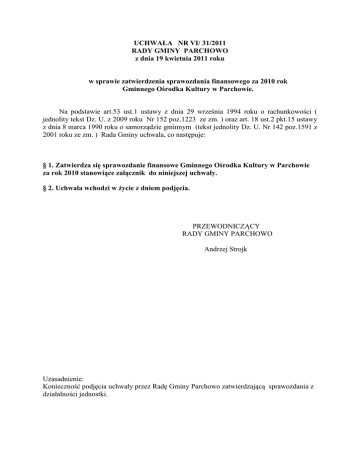 UCHWAŁA NR VI/ 31/2011 RADY GMINY PARCHOWO z dnia 19 kwietnia 2011 roku w sprawie zatwierdzenia sprawozdania finansowego za 2010 rok Gminnego Ośrodka Kultury w Parchowie. Na podstawie art.53 ust.1 ustawy z dnia 29 września 1994 roku o rachunkowości ( jednolity tekst Dz. U. z 2009 roku Nr 152 poz.1223 ze zm. ) oraz art. 18 ust.2 pkt.15 ustawy z dnia 8 marca 1990 roku o samorządzie gminnym (tekst jednolity Dz. U. Nr 142 poz.1591 z 2001 roku ze zm. ) Rada Gminy uchwala, co następuje: § 1. Zatwierdza się sprawozdanie finansowe Gminnego Ośrodka Kultury w Parchowie za rok 2010 stanowiące załącznik do niniejszej uchwały. § 2. Uchwała wchodzi w życie z dniem podjęcia. PRZEWODNICZĄCY RADY GMINY PARCHOWO Andrzej Strojk Uzasadnienie: Konieczność podjęcia uchwały przez Radę Gminy Parchowo zatwierdzającą sprawozdania z działalności jednostki. Rozliczenie finansowe Gminnego Ośrodka Kultury w Parchowie za rok 2010 Dochody : - Stan środków finansowych na 01.01.2010 - Dotacja z gminy na działalność podstawową - wpływ odsetek - za wynajem sal: Nakla – 1.966,21, Jamno- 1.166,88 P-wo – 5.279,23 G-wo – 2.927,65 Ż-ko- 1.511,24 - za wynajem sceny - dotacje na MOTO FOLK 2010 - za punkty gastronomiczne na MOTO FOLK Razem : Wydatki: 334.235,28 312.963,00 2.669,33 12.851,21 2.400,00 500,00 2.000,00 667.618,82 plan na 2010 wykonanie do 31.12.2010 - wynagrodzenia i pochodne 4010 – wynagrodzenia osobowe pracowników - 134.182,00 4110 – składki na ubezpieczenia społeczne - 21.157,00 4120 – składki na fundusz pracy - 3.254,00 Razem : - 158.593,00 - zakup materiałów i energii 4260 zakup energii , 4210 – materiały - zakup opału Razem - usługi obce 4170 – wynagrodzenia umowy zlecenia, dzieło 4370 usługi telekomunikacji stacjo 4350 Internet 4300 - usługi Razem - koszty remontowe 131.091,00 20.625,84 1.828,88 153.545,72 - 12.000,00 - 61.400,00 - 22.800,00 - 96.200,00 14.064,59 49.106,70 23.357,44 86.528,73 - 39.970,00 - 8.000,00 57.181,00 2.504,67 1.811,61 23.280,70 84.777,98 - 9.500,00 - 57.470,00 0 - inwestycje 6050 wykonanie zadania „plac zabaw.. „ - pozostałe 4440 Zakładowy Fundusz Świadczeń Socjalnych 4.700,00 4240 zakup książek, prenumerata czasopism 4410 podróże służbowe, ryczałt 6.000,00 4430 różne opłaty składki (ubezpieczenia sprzętu inne) 4740 zakup mat. i sprzętu drukarsk. 4750 zakup akces. komputer i programów licenc. Razem 10.700,00 0 325.108,19 4.584,30 254,29 4.453,76 675,00 799,28 2.226,53 12.993,16 - stan należności i zobowiązań , w tym wymagalnych OGÓŁEM plan 322.963,00 0 0 wydatki 662.953,79 – 325.108,19 337.845,60 Stan konta na 31 GRUDNIA 2010 roku - 4.665,03 W PARAGRAFACH 4170, 4210, 4300 - 129.568,40 wydatkowano na: remonty i wyposażenie GOK i świetlic 11.792,71 Zakupy sprzętu biurowych muzycznego, akcesoria 22.128,21 ( komputer, projektor, kolumny, statyw, patelnia elektr. Jamno ) Dla „Modelarzy” i regaty 3.699,22 Święto Latawca 2.041,30 Konkursy Ptaki ptaszki, Rodno Mowa Niebieskie tarcze 4.562,30 Wieczór kolęd , bale przebierańców, kaszubska Baśka 3.013,17 Dzień dziecka 500,98 Festyny – Gołczewo, Nakla , Jamno, Chośnica 3.081,25 MOTO FOLK KASZUBY 2010 23.009,91 Koncert akordeonowy , konkurs piosenki 1.127,08 Dzień seniora 526,00 druk gazety Czas Parchowa 4.953,20 materiały naprowadzenie zajęć plast. muzycznych 1.495,55 wywóz nieczystości Gołczewo 1.925,00 prowadzenie zajęć - instruktorzy 42.581,00 różne materiały do bieżącej działalności 3.131,52 129.568,40 Sprawozdanie z działalności Gminnego Ośrodka Kultury w Parchowie w roku 2010. Gminny Ośrodek Kultury w Parchowie administruje i prowadzi działalność edukacyjno kulturalną w swojej siedzibie w Parchowie, Wiejskim Domu Kultury w Nakli, Gołczewie, Żukówku, Świetlicy Wiejskiej w Sylcznie, Chośnicy i Jamnie . 1. W sferze edukacji kulturalnej w GOK prowadzone były w roku ubiegłym : -zajęcia plastyczne w ramach „Klubu Młodego Twórcy” -zajęcia nauki gry na instrumentach muzycznych -zajęcia muzyczno-ruchowe dla grupy przedszkolnej − zajęcia modelarskie , te w ramach prowadzonego Klubu Modelarskiego Mausz − warsztaty taneczno-ruchowe − zajęcia sekcji prasowej − W GOK -u regularnie odbywały się spotkania członków zespołu Modraki . − GOK jest wydawcą gazety gminnej „Czas Parchowa” Wszystkie zajęcia i warsztaty prowadzone są przez instruktorów z odpowiednim profesjonalnym przygotowaniem i doświadczeniem w pracy z dziećmi i młodzieżą. Zajęcia odbywają się od poniedziałku do piątku w godz. otwarcia GOK , czyli 9-19 w okresie zimowym , od 9-20 w okresie letnim. Miejsce odbywania zajęć to nie tylko GOK ale również stara szkoła w Parchowie , przedszkole i szkoła w Parchowie. Świetlica w Gminnym Ośrodku Kultury jest także miejscem w którym można korzystać z darmowego dostępu do Internetu . 2. Wiejski Dom Kultury w Nakli; Godziny otwarcia poniedziałek, środa, piątek 14.30-17; wtorek , czwartek 13-15. Zakres zajęć obejmuje: plastykę, zajęcia muzyczne, teatr, taniec, organizację imprez okolicznościowych, praca z dziećmi mającymi problemy z nauką w szkole oraz zajęcia świetlicowe (tenis stołowy, komputer, gry planszowe itp.) 3.Wiejski Dom Kultury w Gołczewie Godziny otwarcia wtorek-sobota, godz. 15-20 Zakres zajęć obejmuje: zajęcia plastyczne, gry i zabawy świetlicowe, tenis stołowy, zajęcia muzyczno -ruchowe, siłownię. W soboty organizowane są tu dyskoteki dla dzieci a w środy wieczory bajek . Pracownik ma w swoich obowiązkach opiekę nad Izbą Regionalną w tej miejscowości, która otwierana i użytkowana jest w miarę potrzeb. 4.Sala Wiejska Jamno Tu zajęcia odbywają się w czwartki , w godz. 17-19 Są to zajęcia z plastyki, zajęcia muzyczne, teatr, taniec organizacja imprez okolicznościowych, praca z dziećmi mającymi problemy z nauką , zajęcia świetlicowe 5.Świetlica w Chośnicy Zajęcia odbywają się dwa razy w tygodniu, są to