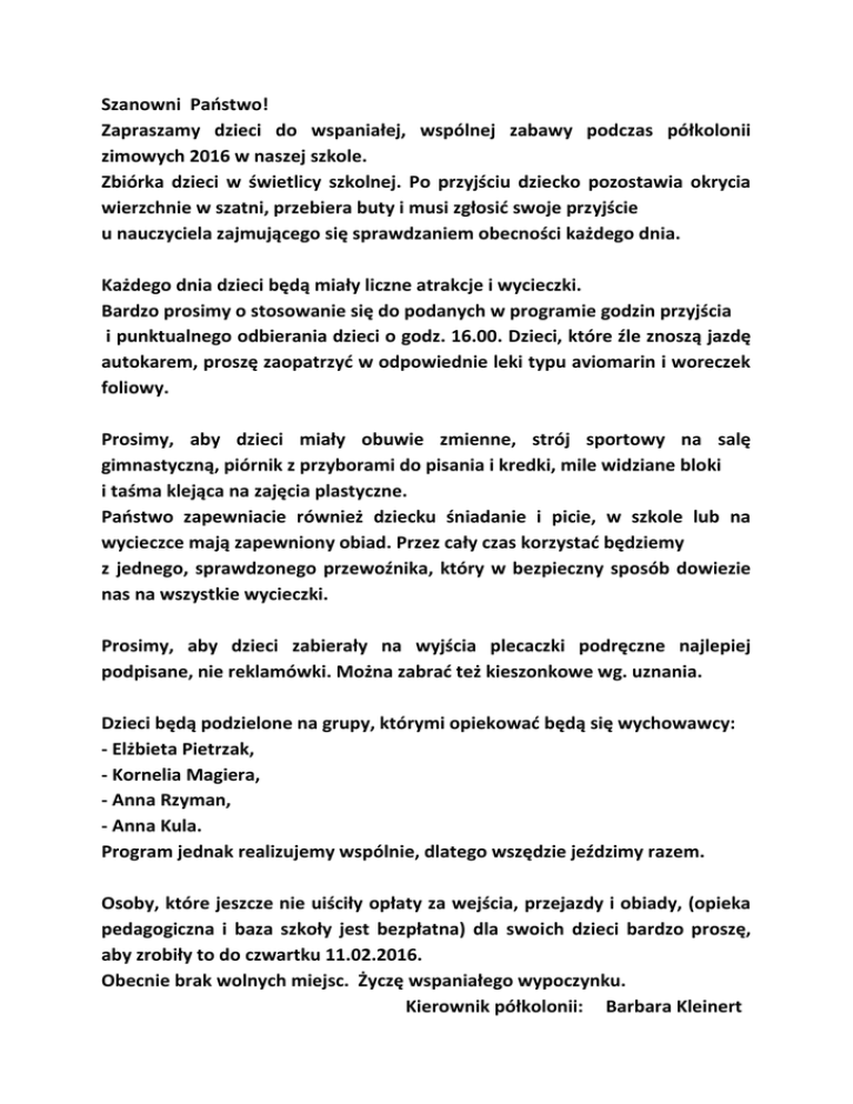 Szanowni Państwo! Zapraszamy dzieci do wspaniałej, wspólnej zabawy podczas półkolonii zimowych 2016 w naszej szkole. Zbiórka dzieci w świetlicy szkolnej. Po przyjściu dziecko pozostawia okrycia wierzchnie w szatni, przebiera buty i musi zgłosić swoje przyjście u nauczyciela zajmującego się sprawdzaniem obecności każdego dnia. Każdego dnia dzieci będą miały liczne atrakcje i wycieczki. Bardzo prosimy o stosowanie się do podanych w programie godzin przyjścia i punktualnego odbierania dzieci o godz. 16.00. Dzieci, które źle znoszą jazdę autokarem, proszę zaopatrzyć w odpowiednie leki typu aviomarin i woreczek foliowy. Prosimy, aby dzieci miały obuwie zmienne, strój sportowy na salę gimnastyczną, piórnik z przyborami do pisania i kredki, mile widziane bloki i taśma klejąca na zajęcia plastyczne. Państwo zapewniacie również dziecku śniadanie i picie, w szkole lub na wycieczce mają zapewniony obiad. Przez cały czas korzystać będziemy z jednego, sprawdzonego przewoźnika, który w bezpieczny sposób dowiezie nas na wszystkie wycieczki. Prosimy, aby dzieci zabierały na wyjścia plecaczki podręczne najlepiej podpisane, nie reklamówki. Można zabrać też kieszonkowe wg. uznania. Dzieci będą podzielone na grupy, którymi opiekować będą się wychowawcy: - Elżbieta Pietrzak, - Kornelia Magiera, - Anna Rzyman, - Anna Kula. Program jednak realizujemy wspólnie, dlatego wszędzie jeździmy razem. Osoby, które jeszcze nie uiściły opłaty za wejścia, przejazdy i obiady, (opieka pedagogiczna i baza szkoły jest bezpłatna) dla swoich dzieci bardzo proszę, aby zrobiły to do czwartku 11.02.2016. Obecnie brak wolnych miejsc. Życzę wspaniałego wypoczynku. Kierownik półkolonii: Barbara Kleinert Półkolonie zimowe 2016 – program I tydzień – 15.02.2016 – 19.02.2016 ( w godzinach 8.00- 16.00) 15.02.2016 poniedziałek (zbiórka w świetlicy szkolnej do godz. 9.00) - Podział dzieci na grupy, zabawy integracyjne, ustalenie wspólnych zasad. - Wycieczka do LaserHouse, jedna gra na arenie, laserowy labirynt i strzały do celu (grupa starszych dzieci), dla dzieci młodszych w tym samym czasie Multikino, film pt.: „Misiek w Nowym Yorku”. - obiad w szkole a następnie zajęcia w grupach: sportowe, komputerowe, plastyczne, gry i zabawy stolikowe, planszowe, zabawy konstrukcyjne klockami. 16.02.2016 wtorek (zbiórka w świetlicy szkolnej do godz. 8.30) - 8.30 wyjazd autokarem na basen MOS Katowice ( pływa ok. 40 dzieci) Dzieci zgłoszone zabierają strój na basen, kąpielówki, klapki, czepek, ręcznik, mydło najlepiej w płynie, suszarkę do włosów. - Bezpośrednio po basenie przejazd do sali zabaw „Świat Dory”. - Obiad w szkole, a następnie zajęcia w grupach: sportowe, komputerowe, plastyczne, gry i zabawy stolikowe, planszowe, zabawy konstrukcyjne klockami. 17.02.2016 środa (zbiórka w świetlicy szkolnej do 9.00, brak obiadu w szkole) - Wycieczka do ośrodka „HUSAR” – Kuźniczka Mała za Dąbrową Górniczą. Kulig lub przejazd wozem, przejażdżka na koniu, spacer do lasu, oglądanie paśników, karmienie zwierząt, obiad – kiełbaska z grilla, chleb, gorąca herbata z cytryną. Powrót ok. 15.00 do szkoły. 18.02.2016 czwartek (zbiórka w świetlicy szkolnej do godz. 8.30) - zajęcia warsztatowe – mydlarskie w szkole. Uczniowie wykonują dwa mydełka i zabierają je do domu. - zajęcia plastyczne, komputerowe i sportowe. - Wyjście na zajęcia z daktyloskopii oraz zwiedzanie strzelnicy w Szkole Policji w Piotrowicach. Poznanie pracy policjantów, oglądanie sprzętu policyjnego. - Obiad w szkole i zajęcia popołudniowe, wybrane przez dzieci w grupach. 19.02.2016 piątek (zbiórka w świetlicy do godz. 9.00, brak obiadu w szkole). - Wycieczka całodniowa do zamku – Tarnowice Stare. - Zwiedzanie zamku z przewodnikiem, - Zajęcia warsztatowe – ozdabianie drewnianej szkatułki, którą dzieci zabierają do domu. - obiad w „ Gospodzie u Wrochema” (naleśniki z twarożkiem w cenie półkolonii). Możliwość zakupu czegoś do picia i do jedzenia we własnym zakresie, można zabrać kieszonkowe. II tydzień – 22.02.2016 – 26.02.2016 ( w godzinach 8.00- 16.00) 22.02.2016 poniedziałek (zbiórka w świetlicy szkolnej do godz. 9.00) - Przyjęcie do grup nowych osób, zabawy integracyjne. - Wycieczka do Osikowej Doliny na zajęcia warsztatowe. (Dzieci wykonają dwie prace, które zabiorą do domu). - Przyjazd ok. godz.14.00 na obiad do szkoły, - Zajęcia w grupach: sportowe, komputerowe, plastyczne, gry i zabawy stolikowe, planszowe, zabawy konstrukcyjne klockami, oglądanie wybranego przez dzieci filmu dla dzieci na dvd. 23.02.2016 wtorek (zbiórka w świetlicy szkolnej do godz. 8.20) - 8.30 wyjazd autokarem na basen MOS Katowice ( pływa ok. 40 dzieci) Dzieci zgłoszone zabierają strój na basen, kąpielówki, klapki, czepek, ręcznik, mydło najlepiej w płynie, suszarkę do włosów. - Przejazd do Multikina w Galerii Katowickiej, film „Alwin i Wiewiórki”, kolejna część. (można zabrać pieniążki na popcorn itp.) - Obiad w szkole a następnie zajęcia w grupach: sportowe, komputerowe, plastyczne, gry i zabawy stolikowe, planszowe, zabawy konstrukcyjne klockami. 24.02.2016 środa (zbiórka w świetlicy szkolnej do godz. 9.00, brak obiadu w szkole) - Wycieczka do „Zaczarowanego lasu” w Piasku pod Janowem. Spotkanie z różnymi postaciami bajkowymi, wizyta w chacie Baby Jagi, przejazd wozami lub kulig, ognisko z pieczeniem kiełbasek w ramach obiadu, Zabawy przy muzyce z baśniowymi bohaterami. Powrót do szkoły ok. godz. 15.00. 25.02.2016 czwartek ( zbiórka w świetlicy szkolnej godz.8.00, brak obiadu w szkole) - Całodniowa wycieczka do parku atrakcji w Żorach – Miasteczko TwinPigs. Zwiedzanie z przewodnikiem a następnie korzystanie z wszystkich atrakcji parku. - Pokaz iluzjonisty, ok. 14.00 Pokaz Eskimosów. - Obiad w restauracji - nuggetsy, frytki, jabłko, napój w cenie wejściówki. - Zwie