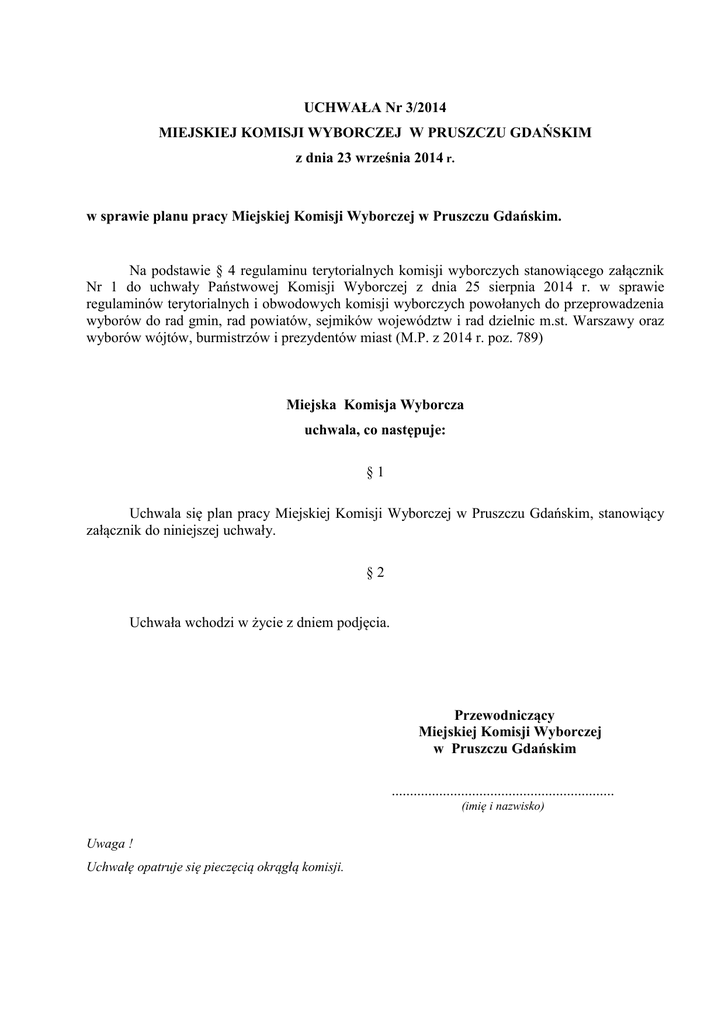 UCHWAŁA Nr 3/2014 MIEJSKIEJ KOMISJI WYBORCZEJ W PRUSZCZU GDAŃSKIM z dnia 23 września 2014 r. w sprawie planu pracy Miejskiej Komisji Wyborczej w Pruszczu Gdańskim. Na podstawie § 4 regulaminu terytorialnych komisji wyborczych stanowiącego załącznik Nr 1 do uchwały Państwowej Komisji Wyborczej z dnia 25 sierpnia 2014 r. w sprawie regulaminów terytorialnych i obwodowych komisji wyborczych powołanych do przeprowadzenia wyborów do rad gmin, rad powiatów, sejmików województw i rad dzielnic m.st. Warszawy oraz wyborów wójtów, burmistrzów i prezydentów miast (M.P. z 2014 r. poz. 789) Miejska Komisja Wyborcza uchwala, co następuje: §1 Uchwala się plan pracy Miejskiej Komisji Wyborczej w Pruszczu Gdańskim, stanowiący załącznik do niniejszej uchwały. §2 Uchwała wchodzi w życie z dniem podjęcia. Przewodniczący Miejskiej Komisji Wyborczej w Pruszczu Gdańskim ............................................................. (imię i nazwisko) Uwaga ! Uchwałę opatruje się pieczęcią okrągłą komisji. Załącznik do uchwały Nr 3/2014 Miejskiej Komisji Wyborczej w Pruszczu Gdańskim z dnia 23 września 2014 r. Plan pracy Miejskiej Komisji Wyborczej w Pruszczu Gdańskim Lp. 1. 2. 3. 4. 5. 6. 7. 8. Zadania Odbycie pierwszego posiedzenia Miejskiej Komisji Wyborczej Dokonanie wyboru przewodniczącego oraz wyboru zastępcy przewodniczącego Uchwalenie planu pracy Ustalenie sposobu podania do publicznej wiadomości informacji o swoim składzie, siedzibie i pełnionych dyżurach Ustalenie dyżurów członków Komisji w jej siedzibie Ustalenie działań związanych z przyjmowaniem zgłoszeń list kandydatów na radnych oraz kandydatów na burmistrza miasta Podanie do publicznej wiadomości ustaleń dotyczących działań związanych z przyjmowaniem zgłoszeń list kandydatów na radnych oraz kandydatów na burmistrza miasta Przyjmowanie zgłoszeń list kandydatów na radnych Termin wykonania niezwłocznie po powołaniu na pierwszym posiedzeniu na pierwszym posiedzeniu na pierwszym posiedzeniu na pierwszym posiedzeniu na pierwszym posiedzeniu niezwłocznie po pierwszym posiedzeniu według ustalonego planu dyżurów do 7 października 2014 r. do godz. 2400 9. Przyjmowanie zgłoszeń kandydatów na burmistrza miasta 10. Wydawanie potwierdzeń przyjęcia zgłoszenia do rejestracji list kandydatów na radnych oraz potwierdzeń przyjęcia zgłoszenia 11. 12. do rejestracji kandydata na burmistrza miasta Sprawdzanie, czy dokonane zgłoszenia list kandydatów na radnych oraz kandydatów na burmistrza miasta są zgodne z przepisami Kodeksu wyborczego oraz podejmowanie odpowiednich czynności związanych z wynikami badań Rejestrowanie list kandydatów na radnych oraz kandydatów na burmistrza miasta według ustalonego planu dyżurów do dnia 17 października 2014 r. do godz. 2400 niezwłocznie po zgłoszeniu kandydatów na radnych niezwłocznie po dokonaniu zgłoszenia niezwłocznie po przyjęciu dokumentów zgłoszenia, nie później niż w ciągu 3 dni po dokonaniu zgłoszenia 13. Nadawanie w drodze losowania numerów zarejestrowanym niezwłocznie po przyznaniu przez Komisarza Wyborczego w drodze losowania numerów dla list kandydatów na radnych do rad powiatów 14. Ustalenie treści i zarządzenie wydrukowania obwieszczenia po zakończeniu rejestracji i przyznaniu numerów listom kandydatów z wyprzedzeniem umożliwiającym ich druk i rozplakatowanie najpóźniej do dnia 27 października 2014 r. listom kandydatów na radnych zgodnie z przepisami Kodeksu wyborczego o zarejestrowanych listach kandydatów na radnych zawierającego dane wymagane przepisami Kodeksu wyborczego listy -2– 15. 16. 17. 18. 19. 20. 21. 22. 23. 24. 25. Ustalenie treści i zarządzenie wydrukowania obwieszczenia o kandydatach na burmistrza miasta zawierającego dane wymagane przepisami Kodeksu wyborczego Powołanie obwodowych komisji wyborczych na podstawie zgłoszeń dokonanych przez pełnomocników komitetów wyborczych Dokonywanie zmian w składach obwodowych komisji wyborczych Wykonywanie czynności związanych ze skreślaniem nazwisk kandydatów na radnych, kandydatów na burmistrza miasta oraz unieważnianiem rejestracji listy kandydatów w przypadkach określonych w Kodeksie wyborczym Ustalenie treści i zarządzenie wydrukowania kart do głosowania, odrębnie dla każdego okręgu wyborczego i kart do głosowania w wyborach burmistrza miasta oraz kontrola prawidłowości ich druku Zapewnienie przekazania kart do głosowania, nakładek na karty do głosowania i innych dokumentów obwodowym komisjom wyborczym Uczestniczenie w szkoleniach członków obwodowych komisji wyborczych niezwłocznie po rejestracji Rozpatrywanie w zakresie swojej właściwości skarg na działalność obwodowych komisji wyborczych i udzielanie im pomocy w zakresie wykonywania przez nie zadań wyborczych Współdziałanie z Komisarzem Wyborczym, Dyrektorem Delegatury Krajowego Biura Wyborczego oraz organami administracji samorządowej przy ustalaniu zasad i sposobu wykonywania zadań wyborczych Opracowanie planu organizacyjnego związanego z ustaleniem wyników głosowania i wyników wyborów do rad oraz wyborów burmistrza miasta Opracowanie planu organizacyjnego w przypadku konieczności przeprowadzenia II tury wyborów burmistrza miasta zadanie stałe do dnia 27 października 2014 r. w miarę zaistniałych potrzeb niezwłocznie po wystąpieniu przyczyny uzasadniającej dokonanie skreślenia, unieważnienia w terminie i stosownie do ustaleń PKW i Komisarza Wyborczego w terminie i trybie określonym przez Komisarza Wyborczego w terminie i stosownie do ustaleń Komisarza Wyborczego zadanie stałe do dnia 14 listopada 2014 r. do dnia 29 listopada 2014 r. r. Przewodniczący Miejskiej Komisji Wyborczej w Pruszczu Gdańskim ............................................................. (imię i nazwisko)