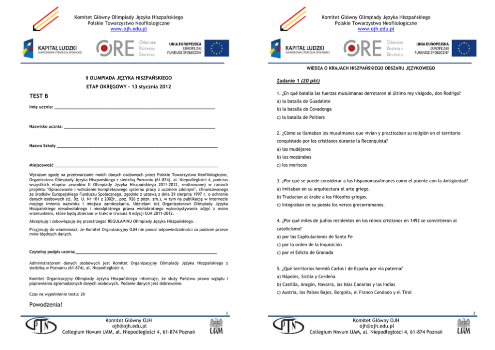 Komitet Główny Olimpiady Języka Hiszpańskiego Polskie Towarzystwo Neofilologiczne www.ojh.edu.pl Komitet Główny Olimpiady Języka Hiszpańskiego Polskie Towarzystwo Neofilologiczne www.ojh.edu.pl WIEDZA O KRAJACH HISZPAŃSKIEGO OBSZARU JĘZYKOWEGO II OLIMPIADA JĘZYKA HISZPAŃSKIEGO Zadanie 1 (20 pkt) ETAP OKRĘGOWY – 13 stycznia 2012 1. ¿En qué batalla las fuerzas musulmanas derrotaron al último rey visigodo, don Rodrigo? TEST B a) la batalla de Guadalete Imię ucznia: __________________________________________________________________ b) la batalla de Covadonga c) la batalla de Poitiers Nazwisko ucznia: ______________________________________________________________ 2. ¿Cómo se llamaban los musulmanes que vivían y practicaban su religión en el territorio conquistado por los cristianos durante la Reconquista? Nazwa Szkoły __________________________________________________________________ a) los mudéjares b) los mozárabes c) los moriscos Miejscowość ___________________________________________________________________ WyraŜam zgodę na przetwarzanie moich danych osobowych przez Polskie Towarzystwo Neofilologiczne, Organizatora Olimpiady Języka Hiszpańskiego z siedzibą Poznaniu (61-874), al. Niepodległości 4, podczas wszystkich etapów zawodów II Olimpiady Języka Hiszpańskiego 2011-2012, realizowanej w ramach projektu "Opracowanie i wdroŜenie kompleksowego systemu pracy z uczniem zdolnym", sfinansowanego ze środków Europejskiego Funduszu Społecznego, zgodnie z ustawą z dnia 29 sierpnia 1997 r. o ochronie danych osobowych (tj. Dz. U. Nr 101 z 2002r., poz. 926 z pózn. zm.), w tym na publikację w internecie mojego imienia nazwiska i miejsca zamieszkania. Udzielam teŜ Organizatorowi Olimpiady Języka Hiszpańskiego nieodwołalnego i nieodpłatnego prawa wielokrotnego wykorzystywania zdjęć z moim wizerunkiem, które będą zbierane w trakcie trwania II edycji OJH 2011-2012. 3. ¿Por qué se puede considerar a los hispanomusulmanes como el puente con la Antigüedad? a) Imitaban en su arquitectura el arte griego. b) Traducían al árabe a los filósofos griegos. c) Integraban en su poesía los versos grecorromanos. Akceptuję i zobowiązuję się przestrzegać REGULAMINU Olimpiady Języka Hiszpańskiego. 4. ¿Por qué miles de judíos residentes en los reinos cristianos en 1492 se convirtieron al Przyjmuję do wiadomości, Ŝe Komitet Organizacyjny OJH nie ponosi odpowiedzialności za podanie przeze mnie błędnych danych. catolicismo? a) por las Capitulaciones de Santa Fe c) por la orden de la Inquisición Czytelny podpis ucznia:__________________________________________________________ c) por el Edicto de Granada Administratorem danych osobowych jest Komitet Organizacyjny Olimpiady Języka Hiszpańskiego z siedzibą w Poznaniu (61-874), al. Niepodległości 4. 5. ¿Qué territorios heredó Carlos I de España por vía paterna? Komitet Organizacyjny Olimpiady Języka Hiszpańskiego informuje, Ŝe słuŜy Państwu prawo wglądu i poprawiania zgromadzonych danych osobowych. Podanie danych jest dobrowolne. a) Nápoles, Sicilia y Cerdeña b) Castilla, Aragón, Navarra, las Islas Canarias y las Indias c) Austria, los Países Bajos, Borgoña, el Franco Condado y el Tirol Czas na wypełnienie testu: 2h Powodzenia! 1 Komitet Główny OJH [email protected] Collegium Novum UAM, al. Niepodległości 4, 61-874 Poznań 2 Komitet Główny OJH [email protected] Collegium Novum UAM, al. Niepodległości 4, 61-874 Poznań Komitet Główny Olimpiady Języka Hiszpańskiego Polskie Towarzystwo Neofilologiczne www.ojh.edu.pl Komitet Główny Olimpiady Języka Hiszpańskiego Polskie Towarzystwo Neofilologiczne www.ojh.edu.pl 6. ¿Cómo se llamaba el sistema de trabajo en las colonias españolas en América en el que los a) la Selección Nacional de fútbol ganando la Copa Mundial en 2007 españoles percibían de los indígenas tributos y a cambio les garantizaban mantenimiento, b) Miguel Indurain ganando los torneos de tenis de Wimbledon protección y evangelización? c) Pau Gasol - un jugador de baloncesto de la NBA a) la estancia b) la encomienda 12. El Camino de Santiago... c) la hacienda a) fue una vía de contacto cultural, económico e ideológico entre los reinos peninsulares y Europa. 7. ¿Contra quiénes lucharon los españoles en la batalla de Lepanto en 1571? b) fue recorrido desde el siglo III cuando se encontró la tumba del Apóstol Santiago. a) contra los ingleses c) tuvo su auge después de la victoria definitiva de los Reyes Católicos en 1492. b) contra los franceses c) contra los turcos 13. ¿Cuál de las siguientes tradiciones festivas españolas es correcta? 8. ¿Qué consecuencias para la Corona española trajo la Guerra de los Treinta Años? a) Se queman las figuras gigantescas en la fiesta de San Jordi. a) Perdió sus posesiones en Nueva España. b) Se organizan procesiones de penitentes en Semana Santa. b) Perdió las Provincias Unidas. c) Se regalan libros y se baila la sardana en las Fallas. c) Logró limitar la Reforma protestante. 14. Los encierros son una costumbre... 9. ¿Qué grupos políticos apoyaron al bando republicano en la Guerra Civil Española? a. celebrada en los Sanfermines, que consiste en premiar al torero con una oreja del toro. a) socialistas, comunistas, cedistas b. celebrada en Pamplona, que consiste en torear seis toros. b) republicanos, socialistas, carlistas c. celebrada en varias localidades, que consiste en correr delante de los toros. c) republicanos de izquierda, marxistas, anarquistas 15. En el arte flamenco... 10. ¿Qué ciudades fueron las últimas en caer en poder del bando nacional durante la Guerra Civil Española? a. el cante jondo es un cantaor que interpreta el cante flamenco. a) Sevilla, Cádiz b. palo es un instrumento que marca el ritmo al bailaor. b) Madrid, Valencia c. un tablao es un local dedicado a espectáculos flamencos. c) Barcelona, Bilbao 16. En la gastronomía española... 11. Entre muchos otros deportist