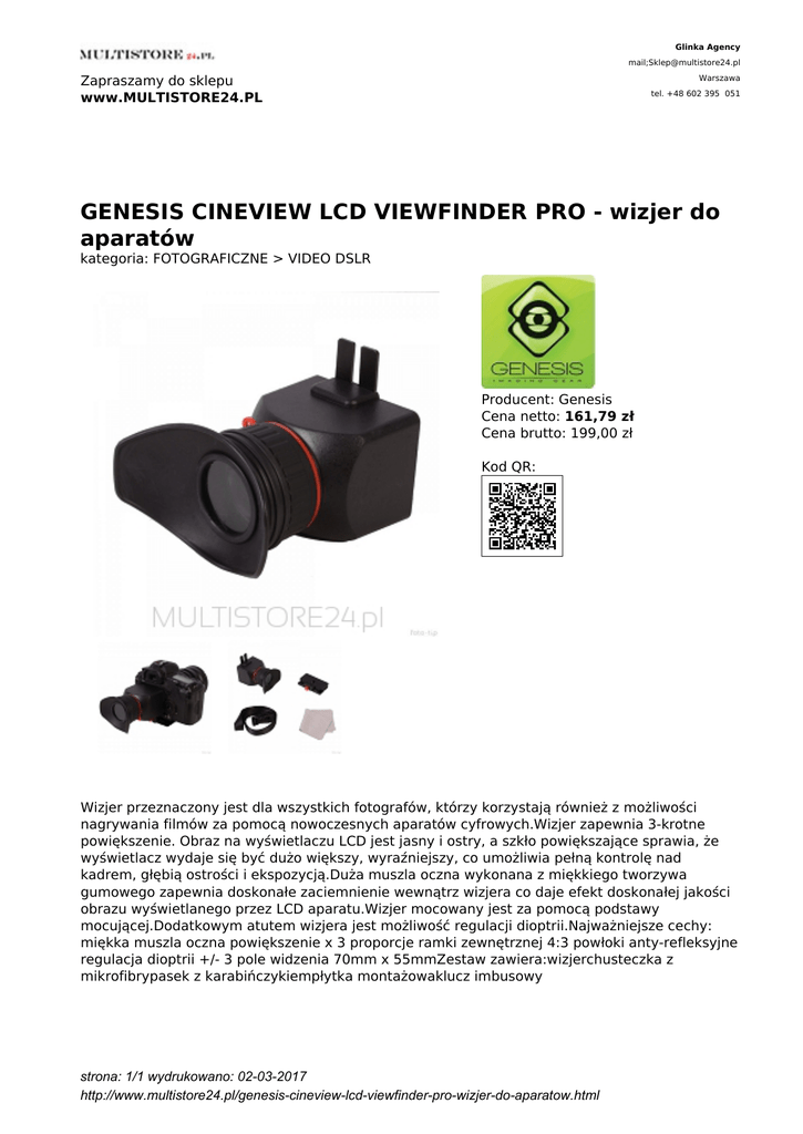 Glinka Agency mail;[email protected] Zapraszamy do sklepu www.MULTISTORE24.PL Warszawa tel. +48 602 395 051 GENESIS CINEVIEW LCD VIEWFINDER PRO - wizjer do aparatów kategoria: FOTOGRAFICZNE > VIDEO DSLR Producent: Genesis Cena netto: 161,79 zł Cena brutto: 199,00 zł Kod QR: Wizjer przeznaczony jest dla wszystkich fotografów, którzy korzystają również z możliwości nagrywania filmów za pomocą nowoczesnych aparatów cyfrowych.Wizjer zapewnia 3-krotne powiększenie. Obraz na wyświetlaczu LCD jest jasny i ostry, a szkło powiększające sprawia, że wyświetlacz wydaje się być dużo większy, wyraźniejszy, co umożliwia pełną kontrolę nad kadrem, głębią ostrości i ekspozycją.Duża muszla oczna wykonana z miękkiego tworzywa gumowego zapewnia doskonałe zaciemnienie wewnątrz wizjera co daje efekt doskonałej jakości obrazu wyświetlanego przez LCD aparatu.Wizjer mocowany jest za pomocą podstawy mocującej.Dodatkowym atutem wizjera jest możliwość regulacji dioptrii.Najważniejsze cechy: miękka muszla oczna powiększenie x 3 proporcje ramki zewnętrznej 4:3 powłoki anty-refleksyjne regulacja dioptrii +/- 3 pole widzenia 70mm x 55mmZestaw zawiera:wizjerchusteczka z mikrofibrypasek z karabińczykiempłytka montażowaklucz imbusowy strona: 1/1 wydrukowano: 02-03-2017 http://www.multistore24.pl/genesis-cineview-lcd-viewfinder-pro-wizjer-do-aparatow.html