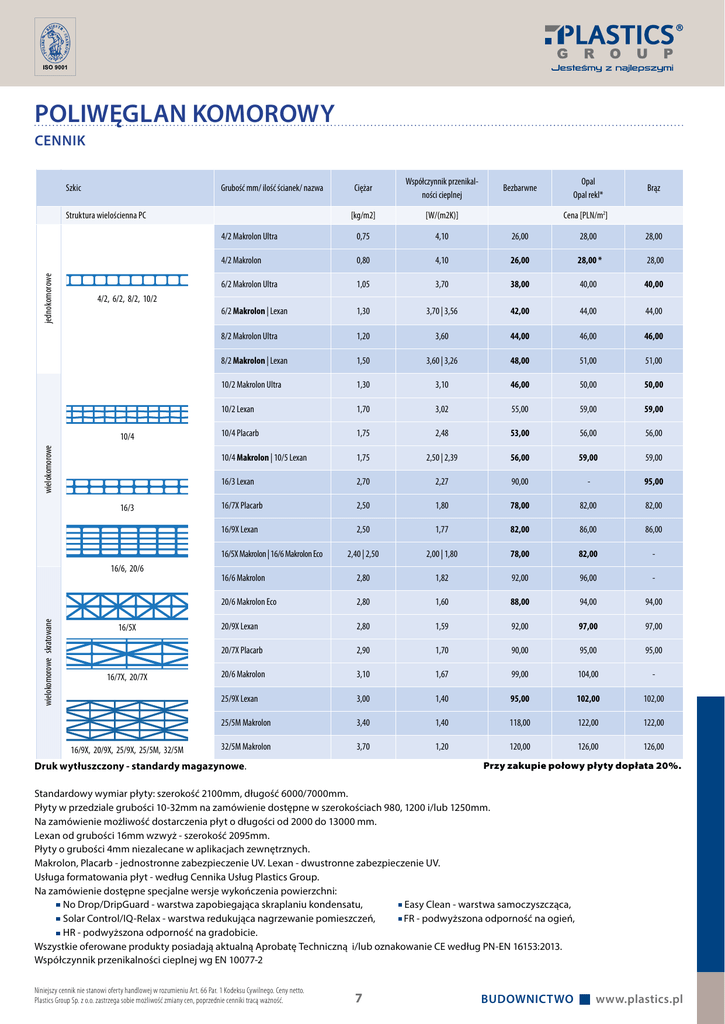 POLIWĘGLAN KOMOROWY CENNIK Szkic Ciężar Współczynnik przenikalności cieplnej [kg/m2] [W/(m2K)] 4/2 Makrolon Ultra 0,75 4,10 26,00 28,00 28,00 4/2 Makrolon 0,80 4,10 26,00 28,00 * 28,00 6/2 Makrolon Ultra 1,05 3,70 38,00 40,00 40,00 6/2 Makrolon | Lexan 1,30 3,70 | 3,56 42,00 44,00 44,00 8/2 Makrolon Ultra 1,20 3,60 44,00 46,00 46,00 8/2 Makrolon | Lexan 1,50 3,60 | 3,26 48,00 51,00 51,00 10/2 Makrolon Ultra 1,30 3,10 46,00 50,00 50,00 10/2 Lexan 1,70 3,02 55,00 59,00 59,00 10/4 Placarb 1,75 2,48 53,00 56,00 56,00 10/4 Makrolon | 10/5 Lexan 1,75 2,50 | 2,39 56,00 59,00 59,00 16/3 Lexan 2,70 2,27 90,00 - 95,00 16/7X Placarb 2,50 1,80 78,00 82,00 82,00 16/9X Lexan 2,50 1,77 82,00 86,00 86,00 2,40 | 2,50 2,00 | 1,80 78,00 82,00 - 16/6 Makrolon 2,80 1,82 92,00 96,00 - 20/6 Makrolon Eco 2,80 1,60 88,00 94,00 94,00 20/9X Lexan 2,80 1,59 92,00 97,00 97,00 20/7X Placarb 2,90 1,70 90,00 95,00 95,00 20/6 Makrolon 3,10 1,67 99,00 104,00 - 25/9X Lexan 3,00 1,40 95,00 102,00 102,00 25/5M Makrolon 3,40 1,40 118,00 122,00 122,00 32/5M Makrolon 3,70 1,20 120,00 126,00 126,00 Grubość mm/ ilość ścianek/ nazwa jednokomorowe Struktura wielościenna PC Opal Opal rekl* Brąz Cena [PLN/m2] 4/2, 6/2, 8/2, 10/2 wielokomorowe 10/4 16/3 16/5X Makrolon | 16/6 Makrolon Eco 16/6, 20/6 wielokomorowe skratowane Bezbarwne 16/5X 16/7X, 20/7X 16/9X, 20/9X, 25/9X, 25/5M, 32/5M Druk wytłuszczony - standardy magazynowe. Przy zakupie połowy płyty dopłata 20%. Standardowy wymiar płyty: szerokość 2100mm, długość 6000/7000mm. Płyty w przedziale grubości 10-32mm na zamówienie dostępne w szerokościach 980, 1200 i/lub 1250mm. Na zamówienie możliwość dostarczenia płyt o długości od 2000 do 13000 mm. Lexan od grubości 16mm wzwyż - szerokość 2095mm. Płyty o grubości 4mm niezalecane w aplikacjach zewnętrznych. Makrolon, Placarb - jednostronne zabezpieczenie UV. Lexan - dwustronne zabezpieczenie UV. Usługa formatowania płyt - według Cennika Usług Plastics Group. Na zamówienie dostępne specjalne wersje wykończenia powierzchni: No Drop/DripGuard - warstwa zapobiegająca skraplaniu kondensatu, Easy Clean - warstwa samoczyszcząca, Solar Control/IQ-Relax - warstwa redukująca nagrzewanie pomieszczeń, FR - podwyższona odporność na ogień, HR - podwyższona odporność na gradobicie. Wszystkie oferowane produkty posiadają aktualną Aprobatę Techniczną i/lub oznakowanie CE według PN-EN 16153:2013. Współczynnik przenikalności cieplnej wg EN 10077-2 Niniejszy cennik nie stanowi oferty handlowej w rozumieniu Art. 66 Par. 1 Kodeksu Cywilnego. Ceny netto. Plastics Group Sp. z o.o. zastrzega sobie możliwość zmiany cen, poprzednie cenniki tracą ważność. 7 BUDOWNICTWO www.plastics.pl OSPRZĘT DO POLIWĘGLANU KOMOROWEGO CENNIK Szkic www.plastics.pl Kod Zastosowanie (porównać z odpowiednim rysunkiem w instrukcji montażu) Długość (mb) Jednostka miary Cena [PLN/mb] 99205 Profil aluminiowy górny, szerokość 60 mm 6,00/7,00 mb 6,00 99204 Profil aluminiowy dolny, szerokość 60 mm 6,00/7,00 mb 10,60 A-6472 Profil aluminiowy dolny, samonośny, szerokość 60 mm 6,00/7,00 mb 18,00 90092 Profil aluminiowy dolny samonośny szerokość 60 mm 6,00/7,00 mb mb 19,35 AL-F6 Profil aluminiowy zamykający do płyt o grubości 6 mm 6,00 mb 3,90 AL-F8 Profil aluminiowy zamykający do płyt o grubości 8 mm 6,00 mb 4,00 AL-F10 Profil aluminiowy zamykający do płyt o grubości 10 mm 6,00 mb 4,40 AL-F16 Profil aluminiowy zamykający do płyt o grubości 16 mm 6,00 mb 4,70 AL-F20 Profil aluminiowy zamykający do płyt o grubości 20 mm 6,00 mb 4,80 AL-F25 Profil aluminiowy zamykający do płyt o grubości 25 mm 6,00 mb 5,00 PC-H4 Profil poliwęglanowy łączący do płyt o grubości 4 mm 6,00 mb 12,40 PC-H6 Profil poliwęglanowy łączący do płyt o grubości 6 mm 6,00 mb 15,00 PC-H8 Profil poliwęglanowy łączący do płyt o grubości 8mm 6,00 mb 15,40 PC-H10 Profil poliwęglanowy łączący do płyt o grubości 10 mm 6,00 mb 15,40 PC-H16 Profil poliwęglanowy łączący do płyt o grubości 16 mm 6,00 mb 21,10 PC-U4 Profil poliwęglanowy zamykający do płyt o grubości 4 mm 2,10 mb 4,10 PC-U6 Profil poliwęglanowy zamykający do płyt o grubości 6 mm 2,10 mb 4,10 PC-U8 Profil poliwęglanowy zamykający do płyt o grubości 8 mm 2,10 mb 5,70 PC-U10 Profil poliwęglanowy zamykający do płyt o grubości 10 mm 2,10 mb 5,70 PC-U16 Profil poliwęglanowy zamykający do płyt o grubości 16 mm 2,10 mb 9,00 S-229 Uszczelka EPDM 100/200 mb 1,65 S-228 Uszczelka dolna EPDM. Szerokość 60 mm - mb 5,50 SD-12 Uszczelka dolna EPDM. Samoprzylepna, szerokość 60 mm 120 mb 6,05 SD-13 Uszczelka dolna EPDM. Samoprzylepna, szerokość 50 mm 120 mb 5,60 PES20 Uszczelka samoprzylepna PES szara 3x20 mm 30 rolka 18,00 PES25 Uszczelka samoprzylepna PES szara 3x25 mm 30 rolka 24,00 PES30 Uszczelka samoprzylepna PES szara 3x30 mm 30 rolka 27,00 PES40 Uszczelka samoprzylepna PES szara 3x40 mm 30 rolka 37,00 PES60 Uszczelka samoprzylepna PES szara 3x60 mm 30 rolka 56,00 BUDOWNICTWO 8 Ceny netto. Niniejszy cennik nie stanowi oferty handlowej w rozumieniu Art. 66 Par. 1 Kodeksu Cywilnego. Plastics Group Sp. z o.o. zastrzega sobie możliwość zmiany cen, poprzednie cenniki tracą ważność. OSPRZĘT DO POLIWĘGLANU KOMOROWEGO CENNIK Szkic Kod Zastosowanie (porównać z odpowiednim rysunkiem w instrukcji montażu) Długość [mb] Jednostka miary Cena [PLN/szt.] TZ-Z25 Taśma HDPE samoprzylepna, pełna do płyt o grubości 4, 6 i 8 mm; szerokość 25 mm 50 rolka 36,00 TZ-Z38 Taśma HDPE samoprzylepna, pełna do płyt o grubości 10, 16 mm; szerokość 38 mm 50 rolka 54,00 TZ-Z45 Taśma HDPE samoprzylepna, pełna do płyt o grubości 20, 25 mm; szerokość 45 mm 50 rolka 76,00 TZ-Z60 Taśma HDPE samoprzylepna, pełna do płyt o grubości 32, 40 mm; szerokość 60 mm 50 rolka 104,00 TZ-P25 Taśma HDPE samoprzylepna, paroprzepuszczalna do płyt o grubości 4, 6 i 8 mm; szerokość 25 mm 33 rolka 60,00 TZ-P38 Taśma HDPE samoprzylep