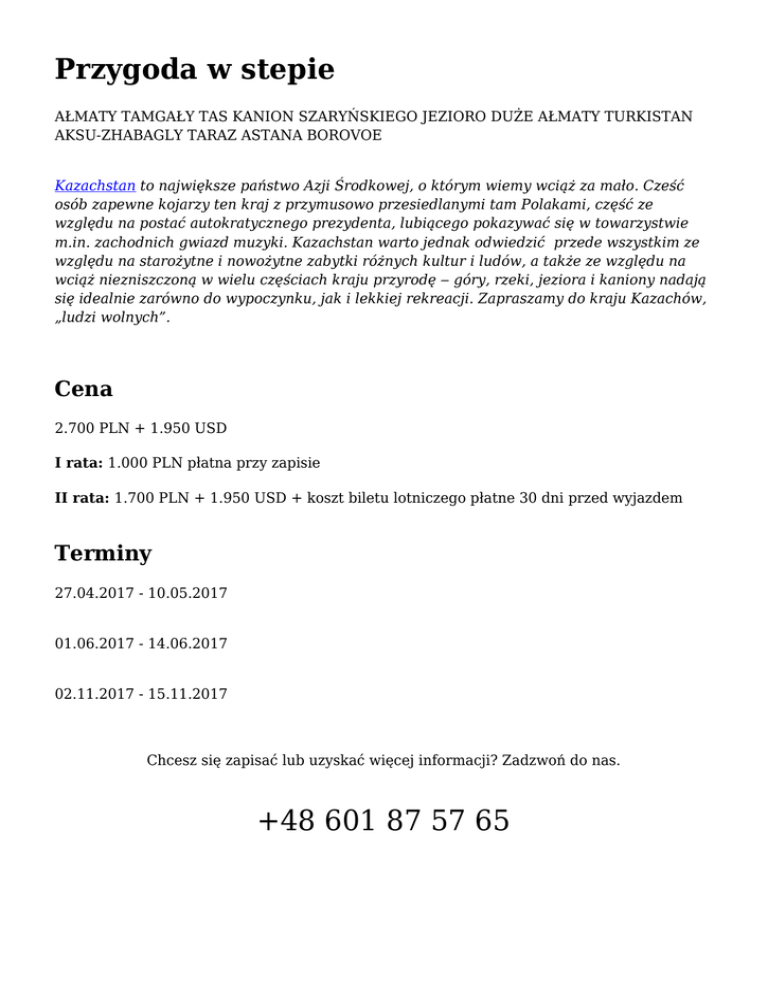 Przygoda w stepie AŁMATY TAMGAŁY TAS KANION SZARYŃSKIEGO JEZIORO DUŻE AŁMATY TURKISTAN AKSU-ZHABAGLY TARAZ ASTANA BOROVOE Kazachstan to największe państwo Azji Środkowej, o którym wiemy wciąż za mało. Cześć osób zapewne kojarzy ten kraj z przymusowo przesiedlanymi tam Polakami, część ze względu na postać autokratycznego prezydenta, lubiącego pokazywać się w towarzystwie m.in. zachodnich gwiazd muzyki. Kazachstan warto jednak odwiedzić przede wszystkim ze względu na starożytne i nowożytne zabytki różnych kultur i ludów, a także ze względu na wciąż niezniszczoną w wielu częściach kraju przyrodę ‒ góry, rzeki, jeziora i kaniony nadają się idealnie zarówno do wypoczynku, jak i lekkiej rekreacji. Zapraszamy do kraju Kazachów, „ludzi wolnych”. Cena 2.700 PLN + 1.950 USD I rata: 1.000 PLN płatna przy zapisie II rata: 1.700 PLN + 1.950 USD + koszt biletu lotniczego płatne 30 dni przed wyjazdem Terminy 27.04.2017 - 10.05.2017 01.06.2017 - 14.06.2017 02.11.2017 - 15.11.2017 Chcesz się zapisać lub uzyskać więcej informacji? Zadzwoń do nas. +48 601 87 57 65 Cena obejmuje przeloty wewnętrzne, przejazd pociągiem, transport autokarem, zakwaterowanie w hotelach 3* i 4*, w pensjonacie w dniach: 7.,8 ,w dniu 5. nocleg w pociągu, wyżywienie: trzy posiłki dziennie w dniach 2.-11., w dniu 12. śniadanie i lunch, w dniu 13. śniadanie, bilety wstępy, opiekę polskiego pilota, pomoc w uzyskaniu wizy do Kazachstanu, opiekę lokalnych przewodników, ubezpieczenie KLA, NNW, KR oraz bagażu. Cena nie obejmuje biletów lotniczych na trasie Warszawa ‒ Ałmaty ‒ Warszawa: od ok. 2.500 PLN, wizy do Kazachstanu (samodzielnie uzyskiwanej w konsulacie): 35 EUR, dopłaty do pokoju jednoosobowego: 495 USD, zwyczajowych napiwków: 70 USD. Plan wyjazdu Dzień 1 Wylot z lotniska Okęcie z Warszawy. Dzień 2 Lądowanie w Ałmaty w Kazachstanie. Poznawanie miasta: wizyta na placu i w parku poświęconym generałowi Panfiłowowi – bohaterowi z czasów II wojny światowej oraz w soborze Wniebowstąpienia Pańskiego – drugim najwyższym drewnianym budynku na świecie. Zwiedzanie Muzeum Instrumentów Muzycznych, w którym można zobaczyć tradycyjne kazachskie instrumenty ludowe. Wizyta na orientalnym Zielonym Bazarze. Rzut oka na centrum miasta: budynki Opery, teatru Baletowego i Parlamentu. Po południu wycieczka do Medeo, gdzie znajduje się jedno z najsławniejszych na świecie lodowisk, które również można podziwiać z pobliskiej tamy wodnej. Kolacja w lokalnej restauracji. Dzień 3 Przejazd do Tamgały Tas , gdzie można podziwiać wyryte w skałach rysunki – petroglify (obiekt z listy UNESCO). Najstarsze z nich datowane są na XVI – XIV w. p.n.e. W okolicy znajdują się również unikatowe buddyjskie skalne rysunki z XII wieku. Po lekcji kultury antycznej powrót do Ałmaty. Dzień 4 Całodniowa wycieczka do kanionu Szaryńskiego, który swoją urodą przypomina kanion Kolorado. Podziwianie fantastycznych form „Doliny Czerwonego Pałacu” z kilkusetmetrowymi ścianami . Po spacerze powrót do Ałmaty na nocleg. Dzień 5 Wycieczka nad jezioro Duże Ałmaty. Po drodze zwiedzanie tamy w dolinie rzeki Bolszaja Almatinka. Poznawanie okolic górskiego jeziora położonego na terenie Parku Narodowego Ile Alatau na wysokości 2511 m n.p.m. Wizyta w obserwatorium, obiad i odpoczynek nad brzegiem jeziora. Powrót do Ałmaty, na nocny pociąg do miasta Turkistanu. Dzień 6 Dotarcie do Turkistanu, ośrodka liczącego sobie 5000 lat. Po śniadaniu zwiedzanie miasta: grobowca sufickiego świętego Chodży Ahmada Jasawiego, wzniesionego za panowania Timura w XIV wieku (i do dziś jednego z najważniejszych miejsc pielgrzymkowych muzułmanów w środkowej Azji, obecnego także na liście UNESCO), cmentarza, orientalnych łaźni oraz podziemnego meczetu. Wieczorem wizyta na nocnym bazarze. Nocleg w Turkiestanie. Dzień 7 Po obfitym śniadaniu przejazd w góry Kirgiskie – pasmo górskie położone w Tienszanie. Po drodze zwiedzanie mauzoleum Arystana Baba – nauczyciela Chodży Ahmada Jasawiego oraz wykopalisk w dawnym mieście Otrar. Po południu dojazd do wioski położonej na terenie rezerwatu Aksu-Zhabagly. Rezerwat obejmuje zarówno tereny półpustynne, jak i pokrytych lodem, na których spotkać można różne gatunki rzadkich roślin, także szereg endemicznych. Poznawanie bujnej okolicznej przyrody i nocleg w pensjonacie. Dzień 8 Całodniowe poznawanie uroków rezerwatu: wodospadu oraz wąwozu rzeki Aksu – jednego z najgłębszych w całej Azji. Lunch w formie pikniku na szlaku. Powrót do wioski. Kolacja i nocleg w pensjonacie. Dzień 9 Po śniadaniu przejazd do Taraz, jednego z najstarszy miast w Kazachstanie. Zwiedzanie mauzoleów z czasów Karachanidów (X – XII w.): Babadżi Chatun i Ajszi Bibi. Kolacja i nocleg. Dzień 10 Rano przelot do Astany, stolicy Kazachstanu. Zwiedzanie wizytówki miasta – wieży widokowej Bejterek. W środku mieści się galeria sztuki, duże akwarium oraz restauracja. Zobaczyć będzie można także najważniejsze budynki w mieście m.in. Operę, teatr Baletowy i Dramatyczny. Wizyta w parku etnograficznym Atameken. Kolacja i nocleg. Dzień 11 Przejazd do Borovoe, położonego w malowniczym regionie niewysokich gór i jezior zwanym przez lokalnych mieszkańców „Kazachską Szwajcarią”. Zakwaterowanie w pensjonacie z widokiem na jezioro. Spacer w wzdłuż brzegu jeziora. Kolacja i nocleg. Dzień 12 Trekking po magicznej okolicy, której klimat podobno działa leczniczo. Po południu powrót do Astany. Dzień 13 Transfer na lot do Ałmaty, następnie przelot powrotny do Polski. Dzień 14 Przylot do Warszawy. Chcesz się zapisać lub uzyskać więcej informacji? Zadzwoń do nas. +48 601 87 57 65