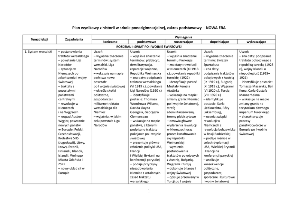 Plan wynikowy z historii w szkole ponadgimnazjalnej, zakres podstawowy – NOWA ERA Temat lekcji 1. System wersalski Zagadnienia – postanowienia traktatu wersalskiego – powstanie Ligi Narodów – sytuacja w Niemczech po zakończeniu I wojny światowej – traktaty z pozostałymi państwami centralnymi – rewolucje w Niemczech i na Węgrzech – rozpad AustroWęgier, powstanie nowych państw w Europie: Polski, Czechosłowacji, Królestwa SHS (Jugosławii), Litwy, Łotwy, Estonii, Finlandii, Irlandii, Islandii, Wolnego Miasta Gdańska i ZSRR – nowy układ sił w Europie Wymagania konieczne podstawowe rozszerzające ROZDZIAŁ I: ŚWIAT PO I WOJNIE ŚWIATOWEJ Uczeń: Uczeń: Uczeń: – wyjaśnia znaczenie – wyjaśnia znaczenie – wyjaśnia znaczenie terminów: system terminów: plebiscyt, terminu Freikorps wersalski, Liga demilitaryzacja, – zna daty: rewolucji Narodów reparacje wojenne, w Niemczech (XI 1918 – wskazuje na mapie Republika Weimarska r.), powstania republiki państwa nowo – zna daty: podpisania tureckiej (1922) powstałe traktatu wersalskiego – identyfikuje postać po I wojnie światowej (VI 1919 r.), powstania Mustafy Kemala – określa skutki Ligi Narodów (1920 r.) Atatürka polityczne, – identyfikuje – wskazuje na mapie: gospodarcze i postacie: Thomasa zmiany granic Niemiec militarne traktatu Woodrowa Wilsona, po I wojnie światowej, wersalskiego dla Davida Lloyda strefę Niemiec George’a, Georges’a zdemilitaryzowaną, – wyjaśnia, w jakim Clemenceau tereny plebiscytowe celu powstała Liga – wskazuje na mapie – omawia główne Narodów państwa, z którymi wydarzenia rewolucji podpisano traktaty w Niemczech oraz pokojowe po I wojnie proces kształtowania światowej się Republiki – prezentuje główne Weimarskiej założenia polityki USA, – wymienia Francji postanowienia i Wielkiej Brytanii na traktatów pokojowych konferencji paryskiej z Austrią, Bułgarią, – podaje przyczyny Węgrami i Turcją niezadowolenia – dokonuje bilansu I Niemiec z ustalonych wojny światowej zasad traktatu – opisuje przemiany w wersalskiego Turcji po I wojnie 1 dopełniające wykraczające Uczeń: – wyjaśnia znaczenie terminu: Związek Spartakusa – zna daty: podpisania traktatów pokojowych z Austrią (IX 1919 r.), Bułgarią (XI 1919 r.), Węgrami (VI 1920 r.), Turcją (VIII 1920 r.) – identyfikuje postacie: Karla Liebknechta, Róży Luksemburg, – ocenia związki rewolucji w Niemczech z rewolucją bolszewicką w Rosji Radzieckiej – podaje różnice w celach dyplomacji USA, Wielkiej Brytanii i Francji na konferencji paryskiej – analizuje konsekwencje polityczne, gospodarcze, społeczne i kulturowe I wojny światowej Uczeń: – zna daty: podpisania traktatu pokojowego z republiką turecką (1923 r.), wojny Irlandii o niepodległość (1919– 1921) – identyfikuje postacie: Tomasza Masaryka, Beli Kuna, Carla Gustafa Mannerheima – wskazuje na mapie zmiany granic na terytorium dawnego imperium tureckiego – charakteryzuje procesy państwotwórcze w Europie po I wojnie światowej światowej 2. Odbudowa powojenna i wielki kryzys – skutki I wojny światowej (kryzys gospodarczy, zniszczenia wojenne, bezrobocie, konflikty społeczne) – powojenna hiperinflacja – zasady funkcjonowania i działalność Ligi Narodów – problemy narodowościowe – kryzys demokracji w Europie – pierwsze koncepcje zjednoczenia Europy – wielki kryzys gospodarczy – metody walki z kryzysem (New Deal) Uczeń: – wyjaśnia znaczenie terminów: nacjonalizm, wielki kryzys gospodarczy – zna datę wielkiego kryzysu gospodarczego w USA (1929-1933) – identyfikuje postać Benito Mussoliniego – podaje przyczyny wielkiego kryzysu gospodarczego – przedstawia najważniejsze skutki wielkiego kryzysu Uczeń: – wyjaśnia znaczenie terminów: totalitaryzm, autorytaryzm, rządy parlamentarnogabinetowe, czarny czwartek, inflacja – zna datę: tzw. czarnego czwartku (X 1929 r.) – identyfikuje postać Franklina Delano Roosevelta – opisuje strukturę Ligi Narodów – określa wzrost nastrojów nacjonalistycznych w Europie wpływających na ustanawianie reżimów autorytarnych i totalitarnych – wymienia kraje europejskie, które w okresie międzywojennym nie doświadczyły kryzysu demokracji 2 Uczeń: – wyjaśnia znaczenie terminów: hiperinflacja, mały traktat wersalski, interwencjonizm państwowy, cło protekcyjne, zasada samostanowienia, New Deal – zna daty: podpisania małego traktatu wersalskiego (1919 r.), ogłoszenia New Deal (1933 r.) – charakteryzuje wpływ małego traktatu wersalskiego na sytuację politycznospołeczną Europy Środkowej – wyjaśnia mechanizm powstania wielkiego kryzysu gospodarczego – wymienia najważniejsze państwa należące do Ligi Narodów – ocenia założenia i trwałość systemu wersalskiego Uczeń: – wyjaśnia znaczenie terminów: pandemia, etatyzm gospodarczy, deflacja – zna datę podpisania paktu BriandaKellogga (1928 r.) – identyfikuje postać Aristide’a Brianda – ocenia znaczenie paktu BriandaKellogga – ocenia decyzję Stanów Zjednoczonych o nieprzystąpieniu do Ligi Narodów – opisuje pierwsze próby podważenia systemu wersalskiego w Europie na początku lat 20. XX w. (Bawaria, Włochy) Uczeń: – wyjaśnia znaczenie terminu: idea paneuropejska – identyfikuje postacie: Erica Drummonda, Richarda CoudenhoveKalergiego – przedstawia pierwsze koncepcje zjednoczenia Europy 3. Kryzys demokracji w Europie – narodziny i rozwój włoskiego faszyzmu (ideologia, działalność partii faszystowskiej, przejęcie władzy, budowa państwa totalitarnego) – Republika Weimarska – powstanie nazizmu w Niemczech – przejęcie władzy przez Adolfa Hitlera, budowa państwa totalitarnego – społeczeństwo III Rzeszy – początek zbrodni nazistów przed wybuchem II wojny światowej – faszyzm i autorytaryzm winnych krajach europejskich Uczeń: – wyjaśnia znaczenie terminów: faszyzm, nazizm (na