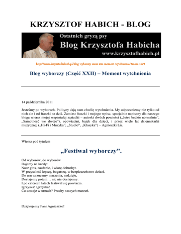 KRZYSZTOF HABICH - BLOG http://www.krzysztofhabich.pl/blog-wyborczy-czesc-xxii-moment-wytchnienia/#more-1679 Blog wyborczy (Część XXII) – Moment wytchnienia 14 października 2011 Jesteśmy po wyborach. Politycy dają nam chwilę wytchnienia. My odpoczniemy nie tylko od nich ale i od fraszki na dziś. Zamiast fraszki i mojego wpisu, specjalnie napisany dla naszego bloga wiersz mojej wspaniałej sąsiadki – autorki dwóch powieści („Jutro będzie normalnie”, „Samotność we dwoje”), opowiadań, bajek dla dzieci, i przez wiele lat dziennikarki muzycznej („Hi-Fi i Muzyka”, „Studio”, „Klasyka”) – Agnieszki Lis. Wiersz pod tytułem „Festiwal wyborczy”. Od wyborów, do wyborów Dajemy na kredyt. Nasz głos, zaufanie, i wiarę dobrobyt. W przyszłość lepszą, bogatszą, w bezpieczeństwo dzieci. Do urn wrzucamy marzenia, nadzieje, Dostajemy potem… nic nie dostajemy. I po czterech latach festiwal się powtarza. Igrzyska! Igrzyska! Co zostaje w urnach? Prochy naszych marzeń. Dziękujemy Pani Agnieszko!