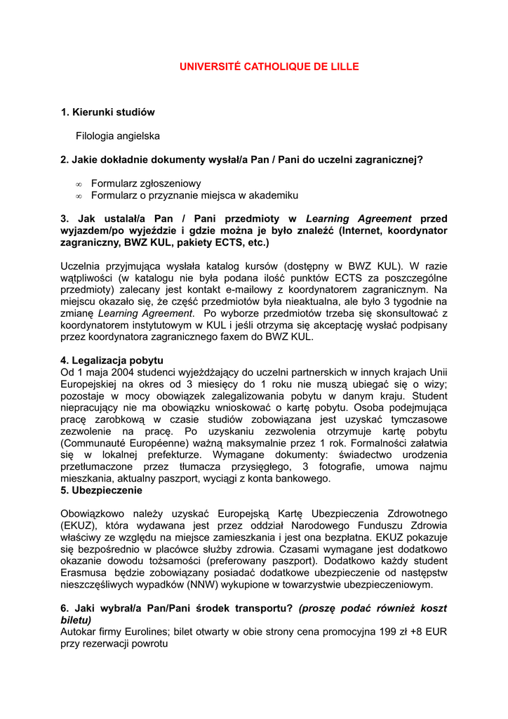 UNIVERSITÉ CATHOLIQUE DE LILLE 1. Kierunki studiów Filologia angielska 2. Jakie dokładnie dokumenty wysłał/a Pan / Pani do uczelni zagranicznej? • • Formularz zgłoszeniowy Formularz o przyznanie miejsca w akademiku 3. Jak ustalał/a Pan / Pani przedmioty w Learning Agreement przed wyjazdem/po wyjeździe i gdzie można je było znaleźć (Internet, koordynator zagraniczny, BWZ KUL, pakiety ECTS, etc.) Uczelnia przyjmująca wysłała katalog kursów (dostępny w BWZ KUL). W razie wątpliwości (w katalogu nie była podana ilość punktów ECTS za poszczególne przedmioty) zalecany jest kontakt e-mailowy z koordynatorem zagranicznym. Na miejscu okazało się, że część przedmiotów była nieaktualna, ale było 3 tygodnie na zmianę Learning Agreement. Po wyborze przedmiotów trzeba się skonsultować z koordynatorem instytutowym w KUL i jeśli otrzyma się akceptację wysłać podpisany przez koordynatora zagranicznego faxem do BWZ KUL. 4. Legalizacja pobytu Od 1 maja 2004 studenci wyjeżdżający do uczelni partnerskich w innych krajach Unii Europejskiej na okres od 3 miesięcy do 1 roku nie muszą ubiegać się o wizy; pozostaje w mocy obowiązek zalegalizowania pobytu w danym kraju. Student niepracujący nie ma obowiązku wnioskować o kartę pobytu. Osoba podejmująca pracę zarobkową w czasie studiów zobowiązana jest uzyskać tymczasowe zezwolenie na pracę. Po uzyskaniu zezwolenia otrzymuje kartę pobytu (Communauté Européenne) ważną maksymalnie przez 1 rok. Formalności załatwia się w lokalnej prefekturze. Wymagane dokumenty: świadectwo urodzenia przetłumaczone przez tłumacza przysięgłego, 3 fotografie, umowa najmu mieszkania, aktualny paszport, wyciągi z konta bankowego. 5. Ubezpieczenie Obowiązkowo należy uzyskać Europejską Kartę Ubezpieczenia Zdrowotnego (EKUZ), która wydawana jest przez oddział Narodowego Funduszu Zdrowia właściwy ze względu na miejsce zamieszkania i jest ona bezpłatna. EKUZ pokazuje się bezpośrednio w placówce służby zdrowia. Czasami wymagane jest dodatkowo okazanie dowodu tożsamości (preferowany paszport). Dodatkowo każdy student Erasmusa będzie zobowiązany posiadać dodatkowe ubezpieczenie od następstw nieszczęśliwych wypadków (NNW) wykupione w towarzystwie ubezpieczeniowym. 6. Jaki wybrał/a Pan/Pani środek transportu? (proszę podać również koszt biletu) Autokar firmy Eurolines; bilet otwarty w obie strony cena promocyjna 199 zł +8 EUR przy rezerwacji powrotu Samolot – ok. 80 EUR w obie strony (Wizzair) oraz pociągi Beauvais – Paryż (ok. 15 EUR), Paryż – Lille (ok. 40 EUR) Autobus Orbis – 331 zł +8 EUR 7. Co warto ze sobą zabrać? • • • • • • • • ciepłe ubrania parasol zdjęcia śpiwór proszek do prania lampkę na biurko leki – są bardzo drogie we Francji słowniki 8. O czym należy pamiętać/co warto załatwić przed wyjazdem (sprawy studenckie / administracyjne/ finansowe etc.)? • • • • • opłacić opłatę administracyjną i podstemplować legitymację studencką kontakt z wykładowcami w KUL, którzy prowadzą zajęcia, na które nie będzie się uczęszczać z powodu wyjazdu i uprzedzić ich o swojej nieobecności zabezpieczyć się finansowo jak najwcześniej kupić bilet ze względu na możliwość promocji uregulować sprawę zaliczeń i egzaminów – lepiej zdawać wszystkie egzaminy przed wyjazdem 9. Zakwaterowanie • Rodzaj (akademik, wynajęte mieszkanie, itp.) akademik • Czy było zapewnione przez uczelnię zagraniczną? tak nie • Czy wymagano kaucji? tak nie • Jeśli tak, to w jakiej wysokości? 410 euro (jeśli chce się wyjechać przed upływem kontraktu to potrącane jest z tego 160 euro) • Czy wymagano opłat z góry i za jaki okres ? za pierwszy miesiąc • Jaki był koszt zakwaterowania? 230 – 320 EUR • Adres, który chce Pan / Pani polecić kolegom i dlaczego (ze względu na cenę, położenie, itp.) oraz wskazówki jak znaleźć dobre/niedrogie zakwaterowanie Adresy i wskazówki dostępne w BWZ KUL. 10. Wyżywienie: • • • w akademiku (w cenę pokoju wliczone jest śniadanie) w stołówce akademickiej we własnym zakresie Uwagi/wskazówki: Najlepiej kupować w dużych hipermarketach, polecam Carrefour, Champion. W stołówce można kupować obiady za 2,70 EUR. 11. Czy można na miejscu podjąć pracę ? Jeśli tak, prosimy o Pana/Pani uwagi: Studenci z krajów członkowskich Unii Europejskiej mają prawo do podjęcia pracy zarobkowej w wymiarze określonym przez ustawodawstwo danego kraju. Aby podjąć pracę we Francji należy mieć pozwolenie na pobyt „carte de séjour” i „la securite sociale”. Na uczelni jest osoba, która pomaga w załatwieniu formalności. Trzeba zapytać o to p. Bray. 12. Ile dni przed rozpoczęciem semestru warto przyjechać na miejsce? Uczelnia o tym szczegółowo informuje. Około tydzień wcześniej. 13. Co i w jakiej kolejności załatwiał/a Pan/Pani w ciągu pierwszych dni po przyjeździe? - podpisanie umowy o wynajem pokoju z AEU - wybór zajęć i przesłanie poprawionego Learning Agreement do BWZ KUL - założenie konta w banku (polecane Société Générale) - złożenie dokumentów w CAF o dofinansowanie do mieszkania - wyrobienie karty VIVA, która uprawnia do zniżek na bilety komunikacji miejskiej 14. Wybór przedmiotów/kontakty z koordynatorem na uczelni zagranicznej/przesłanie uzgodnionego Learning Agreement do Biura Współpracy z Zagranicą KUL, kontakt ze swoim koordynatorem w KUL – prosimy o Pana/Pani wskazówki/rady dla przyszłych studentów Erasmusa: Uczelnia organizuje specjalne spotkanie, gdzie studenci zagraniczni układają plan zajęć. Zmiany w Learning Agreement są bardzo prawdopodobne. Należy być w stałym kontakcie z koordynatorem w KUL. Wszelkie zmiany dobrze jest konsultować z koordynatorem zagranicznym. Lepiej na początku chodzić na większą ilość zajęć, aby potem wybrać te najciekawsze. 15. Jaką w przybliżeniu łączną kwotę wyda