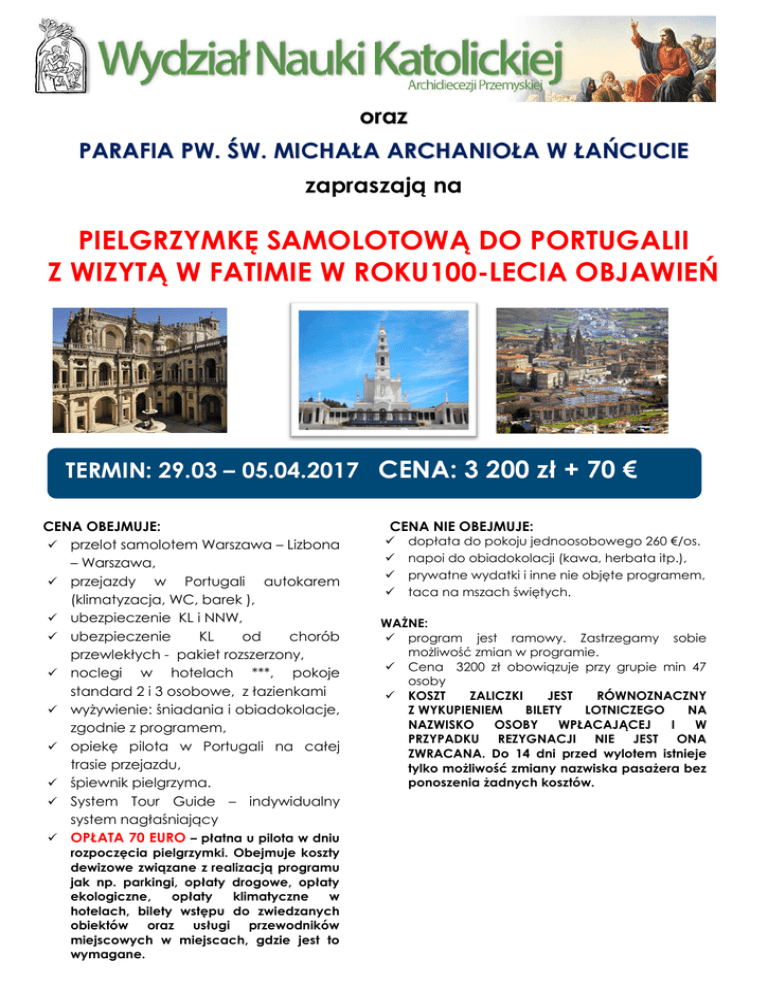oraz PARAFIA PW. ŚW. MICHAŁA ARCHANIOŁA W ŁAŃCUCIE zapraszają na PIELGRZYMKĘ SAMOLOTOWĄ DO PORTUGALII Z WIZYTĄ W FATIMIE W ROKU100-LECIA OBJAWIEŃ TERMIN: 29.03 – 05.04.2017 CENA: 3 200 zł + 70 € CENA OBEJMUJE: przelot samolotem Warszawa – Lizbona – Warszawa, przejazdy w Portugali autokarem (klimatyzacja, WC, barek ), ubezpieczenie KL i NNW, ubezpieczenie KL od chorób przewlekłych - pakiet rozszerzony, noclegi w hotelach ***, pokoje standard 2 i 3 osobowe, z łazienkami wyżywienie: śniadania i obiadokolacje, zgodnie z programem, opiekę pilota w Portugali na całej trasie przejazdu, śpiewnik pielgrzyma. System Tour Guide – indywidualny system nagłaśniający OPŁATA 70 EURO – płatna u pilota w dniu na rozpoczęcia pielgrzymki. Obejmuje koszty dewizowe związane z realizacją programu jak np. parkingi, opłaty drogowe, opłaty ekologiczne, opłaty klimatyczne w hotelach, bilety wstępu do zwiedzanych obiektów oraz usługi przewodników miejscowych w miejscach, gdzie jest to wymagane. CENA NIE OBEJMUJE: dopłata do pokoju jednoosobowego 260 €/os. napoi do obiadokolacji (kawa, herbata itp.), prywatne wydatki i inne nie objęte programem, taca na mszach świętych. WAŻNE: program jest ramowy. Zastrzegamy sobie możliwość zmian w programie. Cena 3200 zł obowiązuje przy grupie min 47 osoby KOSZT ZALICZKI JEST RÓWNOZNACZNY Z WYKUPIENIEM BILETY LOTNICZEGO NA NAZWISKO OSOBY WPŁACAJĄCEJ I W PRZYPADKU REZYGNACJI NIE JEST ONA ZWRACANA. Do 14 dni przed wylotem istnieje tylko możliwość zmiany nazwiska pasażera bez ponoszenia żadnych kosztów. www.matteotravel.pl Zapisy ze względu na termin wykupienia biletów lotniczych do dnia 20.01.2017 r. – zaliczka 400 zł. ZGŁOSZENIA PRZYJMUJE: Ks. Waldemar Janiga – 883 325 899 Ks. Marek Blecharczyk tel. – 725 999 535 Uwaga: katechizujący nie mogą w tym terminie wyjeżdżać! 1. DZIEŃ (śr) 29.03.2017 Zbiorka uczestników pielgrzymki w Warszawie na lotnisku Okęcie15.10. Odprawa bagażowo – paszportowa i wylot o godzinie 17:10 do Lizbony. Lądowanie na miejscu o godzinie 20:15 (czasu miejscowego, czas lotu 4:10 godz.). Przejazd do hotelu w okolicach Lizbony, zakwaterowanie, kolacja. 2. DZIEŃ (czw) 30.03.2017 Po śniadaniu zwiedzanie LIZBONY - dzielnica Belem: wieża Belem ważny symbol miasta z czasów wielkich odkryć geograficznych, pomnik odkrywców, monasterio dos Jeronimos. Przejazd do centrum: dzielnica Alfama z katedrą i kościołem Św Antoniego, Baixa: Plac Handlowy, reprezentacyjny deptak Rua Augusta, Plac Rossio. Przejazd na CABO DA ROCA – najdalej wysuniętego na zachód punktu Europy kontynentalnej. Przejazd do FATIMY, zakwaterowanie, kolacja. Procesja różańcowa. Nocleg. 3. DZIEŃ (pt) 31.03.2017 Śniadanie. Msza Święta. Zwiedzanie Sanktuarium – CAPELINHA – kaplica stojąca w miejscu objawień Matki Bożej trójce małych pastuszków: Łucji, Franciszkowi i Hiacyncie; Bazylika Matki Boskiej Różańcowej z grobami Franciszka i Hiacynty. Uczestnictwo w węgierskiej drodze krzyżowej prowadzącej do wioski VALINHOS – miejsca objawień anielskich oraz do wioski ALJUSTREL- zwiedzanie domów rodzinnych Franciszka i Łucji. Po południu przejazd do TOMAR i zwiedzanie klasztoru Templariuszy. Powrót do hotelu. Kolacja. Procesja Różańcowa o godzinie 21.30. Nocleg. 4. DZIEŃ (sb) 01.04.2017 Po śniadaniu, udział w uroczystym różańcu o godzinie 9.00 i mszy świętej o godzinie 10.00. Wyjazd do BATALHI - zwiedzanie klasztoru Nossa Sra da Victoria. Wizyta w opactwie Cystersów w ALCOBACA. Przejazd do NAZARÉ, najstarszego miejsca kultu maryjnego w Portugalii i wspaniałego kurortu nad Oceanem Atlantyckim, gdzie rybacy kultywują lokalne tradycje. Zwiedzanie kościółka na klifie. Odpoczynek nad oceanem, możliwość odwiedzenia miejscowych restauracyjek – wspaniała okazja do spróbowania słynnych portugalskich sardynek. Powrót do Fatimy, kolacja. Udział w nabożeństwie wieczornym: różaniec, procesja ze świecami. Nocleg. 5. DZIEŃ (ndz) 02.04.2017 Po śniadaniu wyjazd do Santiago de Compostela. Zwiedzanie COIMBRY – dawnej stolicy Portugalii. Po drodze zwiedzanie BRAGI – stolicy arcybiskupstwa z najstarszą katedrą w kraju. Sanktuarium Bom Jesus. Zakwaterowanie w hotelu w Bradze. Kolacja i nocleg. 6. Dzień (pn) 03.04.2017 Po śniadaniu przejazd do SANTIAGO DE COMPOSTELA. Uczestnictwo we Mszy Św. Zwiedzanie jednego z trzech głównych celów średniowiecznego pątnictwa, wyruszali ludzie wszystkich stanów płci obojga. Zwiedzanie katedry św. Jakuba. Msza św. Kolacja i nocleg w Santiago de Compostela. 7. Dzień (wt) 04.04.2017 Po śniadaniu Msza św., następnie wyjazd autokarem do FATIMY, po drodze zwiedzanie PORTO: dworzec Sao Bento, kościół Św. Franciszka, Ribeira. Zakwaterowanie, kolacja. Udział w nabożeństwie wieczornym: różaniec, procesja ze świecami. Nocleg. 8. Dzień (śr) 05.04.2017 Śniadanie. Wykwaterowanie. Przejazd na lotnisko, wylot o godzinie 11:20, przylot do Warszawy o godzinie 16:15 (czasu miejscowego, lot 4 godziny). Zakończenie pielgrzymki.