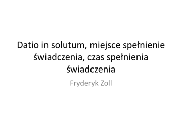 Datio in solutum, miejsce spełnienie świadczenia, czas spełnienia świadczenia Fryderyk Zoll Datio in solutum • Art. 453. Jeżeli dłużnik w celu zwolnienia się z zobowiązania spełnia za zgodą wierzyciela inne świadczenie, zobowiązanie wygasa. Jednakże gdy przedmiot świadczenia ma wady, dłużnik obowiązany jest do rękojmi według przepisów o rękojmi przy sprzedaży. Datio in solutum • I. Przedsiębiorca A sprzedał przedsiębiorcy B 200 rowerów marki X. Jednak gdy miał dostarczyd te rowery okazało się, że nie jest w stanie zdobyd marki X, ale może dostarczyd porównywalne klasą rowery Y. A zaoferował więc B, że dostarczy rowery Y. Rowery te dostarczył. Okazały się jednak wadliwe. Jakie uprawnienia przysługują B? Datio in solutum • Ad I. Stosownie do art. 453 wierzycielowi przysługują uprawnienia z tytułu rękojmi przy sprzedaży (560 – 561 k.c.). • Uprawnienia te przysługują jednak nie w stosunku do całej umowy, ale dotyczą umowy o spełnienie świadczenia. Odstąpienie od tej umowy powoduje jedynie wygaśnięcie skutków spełnienia świadczenia i tym samym odżycie roszczenia o spełnienie pierwotnego świadczenia Datio in solutum • Mimo pewnych kontrowersji możliwe jest także zastosowanie obniżenia ceny – ono ma jednak także dotyczyd jedynie umowy o spełnienie świadczenia, a nie samej umowy, która stanowiła źródło pierwotnego zobowiązania. Dlatego odpowiednie zastosowania obniżenia ceny prowadzi jedynie do ustalenia że spełnienie świadczenia w mniejszym stopniu zaspokoiło wierzyciela, co powoduje odżycie części pierwotnego roszczenia. Datio in solutum • II. Przedsiębiorca A sprzedał konsumentowi B rower X. Jednak ponieważ roweru X nie było wydał za zgodą konsumenta rower Y. Rower Y okazał się wadliwy. Jakie uprawnienia przysługują konsumentowi? Datio in solutum • Ad. II. Tu powstaje pytanie czy art. 453 odsyła także do ustawy o sprzedaży konsumenckiej. Najpewniej trzeba uznad, że tak. W takiej sytuacji konsument ma roszczenie o dostarczenie nowego roweru X. Czy ma roszczenie o naprawienie roweru Y. Pewnie tak, chod prowadzi to do logicznych niespójności. Datio in solutum • Świadczenie w miejsce wykonania a nowacja z art. 506 k.c. • Zbędnośd regulacji datio in solutum jako instytucji nadmiernie teoretycznie wyrafinowanej. Miejsce spełnienia świadczenia • Art. 454. § 1. Jeżeli miejsce spełnienia świadczenia nie jest oznaczone ani nie wynika z właściwości zobowiązania, świadczenie powinno byd spełnione w miejscu, gdzie w chwili powstania zobowiązania dłużnik miał zamieszkanie lub siedzibę. Jednakże świadczenie pieniężne powinno byd spełnione w miejscu zamieszkania lub w siedzibie wierzyciela w chwili spełnienia świadczenia; jeżeli wierzyciel zmienił miejsce zamieszkania lub siedzibę po powstaniu zobowiązania, ponosi spowodowaną przez tę zmianę nadwyżkę kosztów przesłania. • § 2. Jeżeli zobowiązanie ma związek z przedsiębiorstwem dłużnika lub wierzyciela, o miejscu spełnienia świadczenia rozstrzyga siedziba przedsiębiorstwa. Miejsce spełnienia świadczenia • III. A zawarł z B umowę pożyczki. A zamieszkuje w Krakowie przy ul. Studenckiej, B w Poznaniu przy ul. św. Marcin. A był pożyczkodawcą. A sprzedał wierzytelnośd C, zamieszkałemu w Warszawie przy ul. Jagiellooskiej. Gdzie znajduje się miejsce spełnienia świadczenia? Miejsce spełnienia świadczenia • Ad III. Miejscem spełnienia świadczenia pieniężnego jest zamieszkanie lub siedziba wierzyciela z chwili spełnienia świadczenia. Tę regułę należy zastosowad także w przypadku przelewu. Argument, że przelew nie zmienia treści zobowiązania, nie prowadzi do innej konkluzji, ponieważ art. 454 k.c. wyznacza treśd zobowiązania i zakłada, że jest do każdorazowe miejsce zamieszkiwania lub siedziba wierzyciela. • Jest to reguła dyspozytywna Miejsce spełnienie świadczenia • V. Konsument B kupił od sprzedawcy A telewizor w supermarkecie. Konsument wybrał opcję z transportem do domu. Po drodze samochód miał wypadek i z tego powodu telewizor został zniszczony. Konsument, który już zapłacił za telewizor, domaga się dostarczenia urządzenia. Czy zasadnie? Miejsce spełnienie świadczenia • Art. 544. § 1. Jeżeli rzecz sprzedana ma byd przesłana przez sprzedawcę do miejsca, które nie jest miejscem spełnienia świadczenia, poczytuje się w razie wątpliwości, że wydanie zostało dokonane z chwilą, gdy w celu dostarczenia rzeczy na miejsce przeznaczenia sprzedawca powierzył ją przewoźnikowi trudniącemu się przewozem rzeczy tego rodzaju. • § 2. Jednakże kupujący obowiązany jest zapłacid cenę dopiero po nadejściu rzeczy na miejsce przeznaczenia i po umożliwieniu mu zbadania rzeczy. Przejście ryzyka • Art. 548. § 1. Z chwilą wydania rzeczy sprzedanej przechodzą na kupującego korzyści i ciężary związane z rzeczą oraz niebezpieczeostwo przypadkowej utraty lub uszkodzenia rzeczy. • § 2. Jeżeli strony zastrzegły inną chwilę przejścia korzyści i ciężarów, poczytuje się w razie wątpliwości, że niebezpieczeostwo przypadkowej utraty lub uszkodzenia rzeczy przechodzi na kupującego z tą samą chwilą. Przejście ryzyka DYREKTYWA PARLAMENTU EUROPEJSKIEGO I RADY 2011/83/UE z dnia 25 października 2011 r. w sprawie praw konsumentów, zmieniająca dyrektywę Rady 93/13/EWG i dyrektywę 1999/44/WE Parlamentu Europejskiego i Rady oraz uchylająca dyrektywę Rady 85/577/EWG i dyrektywę 97/7/WE Parlamentu Europejskiego i Rady Artykuł 20 Przejście ryzyka W przypadku umów, zgodnie z którymi przedsiębiorca wysyła towary konsumentowi, ryzyko utraty lub uszkodzenia towarów przechodzi na konsumenta w chwili wejścia przez konsumenta lub osobę trzecią wskazaną przez konsumenta, inną niż przewoźnik, w fizyczne posiadanie towarów. Jednakże ryzyko przechodzi na konsumenta z chwilą dostarczenia towarów przewoźnikowi