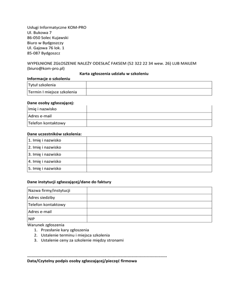 Usługi Informatyczne KOM-PRO Ul. Bukowa 7 86-050 Solec Kujawski Biuro w Bydgoszczy Ul. Gajowa 76 lok. 1 85-087 Bydgoszcz WYPEŁNIONE ZGŁOSZENIE NALEŻY ODESŁAĆ FAKSEM (52 322 22 34 wew. 26) LUB MAILEM ([email protected]) Karta zgłoszenia udziału w szkoleniu Informacje o szkoleniu Tytuł szkolenia Termin I miejsce szkolenia Dane osoby zgłaszającej: Imię i nazwisko Adres e-mail Telefon kontaktowy Dane uczestników szkolenia: 1. Imię i nazwisko 2. Imię i nazwisko 3. Imię i nazwisko 4. Imię i nazwisko 5. Imię i nazwisko Dane instytucji zgłaszającej/dane do faktury Nazwa firmy/instytucji Adres siedziby Telefon kontaktowy Adres e-mail NIP Warunek zgłoszenia 1. Przesłanie kary zgłoszenia 2. Ustalenie terminu i miejsca szkolenia 3. Ustalenie ceny za szkolenie między stronami …............................................................................................................... Data/Czytelny podpis osoby zgłaszającej/pieczęć firmowa