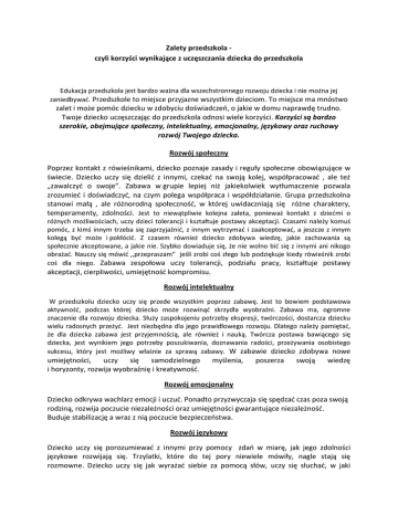 Zalety przedszkola czyli korzyści wynikające z uczęszczania dziecka do przedszkola Edukacja przedszkola jest bardzo ważna dla wszechstronnego rozwoju dziecka i nie można jej zaniedbywać. Przedszkole to miejsce przyjazne wszystkim dzieciom. To miejsce ma mnóstwo zalet i może pomóc dziecku w zdobyciu doświadczeń, o jakie w domu naprawdę trudno. Twoje dziecko uczęszczając do przedszkola odnosi wiele korzyści. Korzyści są bardzo szerokie, obejmujące społeczny, intelektualny, emocjonalny, językowy oraz ruchowy rozwój Twojego dziecka. Rozwój społeczny Poprzez kontakt z rówieśnikami, dziecko poznaje zasady i reguły społeczne obowiązujące w świecie. Dziecko uczy się dzielić z innymi, czekać na swoją kolej, współpracować , ale też „zawalczyć o swoje”. Zabawa w grupie lepiej niż jakiekolwiek wytłumaczenie pozwala zrozumieć i doświadczyć, na czym polega współpraca i współdziałanie. Grupa przedszkolna stanowi małą , ale różnorodną społeczność, w której uwidaczniają się różne charaktery, temperamenty, zdolności. Jest to niewątpliwie kolejna zaleta, ponieważ kontakt z dziećmi o różnych możliwościach, uczy dzieci tolerancji i kształtuje postawy akceptacji. Czasami należy komuś pomóc, z kimś innym trzeba się zaprzyjaźnić, z innym wytrzymać i zaakceptować, a jeszcze z innym kolegą być może i pokłócić. Z czasem również dziecko zdobywa wiedzę, jakie zachowania są społecznie akceptowane, a jakie nie. Szybko dowiaduje się, że nie wolno bić się z innymi ani nikogo obrażać. Nauczy się mówić ,,przepraszam” jeśli zrobi coś złego lub podziękuje kiedy rówieśnik zrobi coś dla niego. Zabawa zespołowa uczy tolerancji, podziału pracy, kształtuje postawy akceptacji, cierpliwości, umiejętność kompromisu. Rozwój intelektualny W przedszkolu dziecko uczy się przede wszystkim poprzez zabawę. Jest to bowiem podstawowa aktywność, podczas której dziecko może rozwinąć skrzydła wyobraźni. Zabawa ma, ogromne znaczenie dla rozwoju dziecka. Służy zaspokojeniu potrzeby ekspresji, twórczości, dostarcza dziecku wielu radosnych przeżyć. Jest niezbędna dla jego prawidłowego rozwoju. Dlatego należy pamiętać, że dla dziecka zabawa jest przyjemnością, ale również i nauką. Twórcza postawa bawiącego się dziecka, jest wynikiem jego potrzeby poszukiwania, doznawania radości, przeżywania osobistego sukcesu, który jest możliwy właśnie za sprawą zabawy. W zabawie dziecko zdobywa nowe umiejętności, uczy się samodzielnego i horyzonty, rozwija wyobraźnię i kreatywność. myślenia, poszerza swoją wiedzę Rozwój emocjonalny Dziecko odkrywa wachlarz emocji i uczuć. Ponadto przyzwyczaja się spędzać czas poza swoją rodziną, rozwija poczucie niezależności oraz umiejętności gwarantujące niezależność. Buduje stabilizację a wraz z nią poczucie bezpieczeństwa. Rozwój językowy Dziecko uczy się porozumiewać z innymi przy pomocy zdań w miarę, jak jego zdolności językowe rozwijają się. Trzylatki, które do tej pory niewiele mówiły, nagle stają się rozmowne. Dziecko uczy się jak wyrażać siebie za pomocą słów, uczy się słuchać, w jaki sposób korzystać z języka niewerbalnego w procesie komunikacji. Ponadto już od najmłodszych lat dziecko ma możliwość nauki języka obcego i w ten sposób poszerza swoje kompetencje językowe. W przedszkolu diagnozowana jest wymowa i kompetencje językowe dziecka i w razie konieczności dziecko korzysta z terapii logopedycznej. Rozwój ruchowy W przedszkolu dziecko rozwija się w aspekcie psychoruchowym, ponieważ za rozwojem ruchowym, podąża rozwój psychiczny. Zajęcia takie, jak gimnastyka , rytmika, tańce i zawody sportowe, z pewnością przyczyniają się do tego. Oprócz tego podczas tzw. „zajęć stolikowych” dzieci ćwiczą sprawność manualną np. lepiąc z plasteliny, rysując, malując itd.), która stanowi podstawę późniejszej nauki pisania. Zajęcia ruchowe ćwiczą sprawność ruchową i kondycję fizyczną, ale również rozładowują energię. Bardzo dobrym miejscem na spożytkowanie nadmiaru energii dzieci, jest ogród przedszkolny, gdzie przedszkolaki mogą wybawić się do woli na świeżym powietrzu. Znaczenie również mają różnorodne zabawy sportowe, podczas których dziecko poznaje smak rywalizacji, zwycięstwa czy gorycz porażki. Przedszkole, jak sama jego nazwa wskazuje, jest miejscem, w którym dziecko zostaje przygotowane do szkoły. Dziecko nie tylko uczy się takich umiejętności, jak koncentracja uwagi, ponoszenie konsekwencji swoich działań, reagowania na polecenia, ale także sprzątania po zakończonej zabawie czy też pracy. Dla dzieci, które uczęszczają na zajęcia przedszkolne, przejście do szkoły podstawowej będzie łatwiejsze dla nich jak i dla ich rodziców. Uczęszczanie dziecka do przedszkola przynosi korzyści zarówno dzieciom, jak i rodzicom. Dzieci zdobywają nowe umiejętności, a rodzice mają czas na pracę zawodową oraz co bezcenne mają możliwość spotkań z innymi rodzicami i specjalistami, mogą nawiązać kontakty w lokalnej społeczności, otrzymać wsparcie i informacje związane z zagadnieniami rodzicielstwa i pomocy psychologiczno-pedagogicznej. Reasumując, przedszkole: uczy dziecko samodzielności, uczy współdziałania w grupie i życia społecznego, stwarza dziecku okazje do poznawania świata i zdobywania wiedzy, kształtuje i rozwija umysł dziecka, rozwija wyobraźnię i kreatywność, rozwija kompetencje językowe, uczy dziecko czerpać radość z relacji z rówieśnikami i dorosłymi, pozytywnie wpływa na rozwój ruchowy dziecka, przygotowuje dziecko do podjęcia nauki w szkole. opr. Bożena Mrowiec