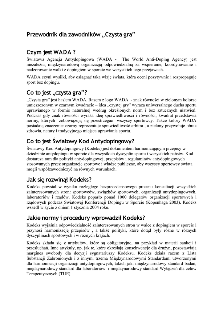Przewodnik dla zawodników „Czysta gra” Czym jest WADA ? Światowa Agencja Antydopingowa (WADA - The World Anti-Doping Agency) jest niezależną międzynarodową organizacją odpowiedzialną za wspieranie, koordynowanie i nadzorowanie walki z dopingiem w sporcie we wszystkich jego przejawach. WADA czyni wysiłki, aby osiągnąć taką wizję świata, która oceni pozytywnie i rozpropaguje sport bez dopingu. Co to jest „czysta gra”? „Czysta gra” jest hasłem WADA. Razem z logo WADA - znak równości w zielonym kolorze umieszczonym w czarnym kwadracie – idea „czystej gry” wyraża uniwersalnego ducha sportu uprawianego w formie naturalnej według określonych norm i bez sztucznych ułatwień. Podczas gdy znak równości wyraża ideę sprawiedliwości i równości, kwadrat przedstawia normy, których zobowiązują się przestrzegać wszyscy sportowcy. Także kolory WADA posiadają znaczenie: czarny reprezentuje sprawiedliwość arbitra , a zielony przywołuje obraz zdrowia, natury i tradycyjnego miejsca uprawiania sportu. Co to jest Światowy Kod Antydopingowy? Światowy Kod Antydopingowy (Kodeks) jest dokumentem harmonizującym przepisy w dziedzinie antydopingu w sporcie dla wszystkich dyscyplin sportu i wszystkich państw. Kod dostarcza ram dla polityki antydopingowej, przepisów i regulaminów antydopingowych stosowanych przez organizacje sportowe i władze publiczne, aby wszyscy sportowcy świata mogli współzawodniczyć na równych warunkach. Jak się rozwinął Kodeks? Kodeks powstał w wyniku rozległego bezprecedensowego procesu konsultacji wszystkich zainteresowanych stron: sportowców, związków sportowych, organizacji antydopingowych, laboratoriów i rządów. Kodeks poparło ponad 1000 delegatów organizacji sportowych i rządowych podczas Światowej Konferencji Dopingu w Sporcie (Kopenhaga 2003). Kodeks wszedł w życie z dniem 1 stycznia 2004 roku. Jakie normy i procedury wprowadził Kodeks? Kodeks wyjaśnia odpowiedzialność zainteresowanych stron w walce z dopingiem w sporcie i przynosi harmonizację przepisów , a także polityki, które dotąd były różne w różnych dyscyplinach sportowych i w różnych krajach. Kodeks składa się z artykułów, które są obligatoryjne, na przykład w materii sankcji i przesłuchań. Inne artykuły, np. jak te, które określają konsekwencje dla drużyn, pozostawiają margines swobody dla decyzji sygnatariuszy Kodeksu. Kodeks działa razem z Listą Substancji Zabronionych i z innymi trzema Międzynarodowymi Standardami utworzonymi dla harmonizacji organizacji antydopingowych, takich jak: międzynarodowy standard badań, międzynarodowy standard dla laboratoriów i międzynarodowy standard Wyłączeń dla celów Terapeutycznych (TUE). Jaka jest podstawowa działalność WADA? Poprzez swe esencjonalne wartości niezależności, podejścia etycznego, odpowiedzialności, profesjonalizmu, najlepszych praktyk i innowacji, WADA zamierza wykonać swą misję wspierania, koordynowania i nadzorowania walki z dopingiem w sporcie we wszystkich jego postaciach i na skalę międzynarodową. WADA koncentruje swą działalność na 6 podstawowych obszarach: Zgodność z Kodeksem. Nadzorować, popierać, wprowadzać i monitorować zgodność postępowania z Kodeksem. Edukacja. Edukować i informować sygnatariuszy Kodeksu, rządy , sportowców i personel pomocniczy o niebezpieczeństwach i konsekwencjach nadużycia dopingu. Badania. Przewodzić, koordynować i popierać skuteczne programy badań nad antydopingiem w skali światowej, aby zidentyfikować i wykryć zabronione substancje i metody. Tworzenie zdolności. Powiększyć zdolność organizacji antydopingowych do wdrażania przepisów i programów antydopingowych w całym świecie, aby zagwarantować równe warunki współzawodnictwa wszystkim sportowcom. Rozwój Programów. Umożliwić krajom rozwijającym się wspólne posiadanie środków do stworzenia regionalnych programów antydopingowych w celu zapewnienia porównywalnych reguł gry dla wszystkich zawodników. Kontrola. Przeprowadzać kontrole bez uprzedzenia poza zawodami wśród elitarnych sportowców we współpracy z federacjami sportu. WADA pragnie bronić podstawowego prawa sportowców do uczestniczenia w czystym sporcie i wobec tego promuje zdrowie, bezstronność i równość między sportowcami całego świata. Jakie substancje i metody są zabronione ? Lista Zabronionych Substancji i Metod (Lista), którą corocznie aktualizuje WADA, jest Międzynarodowym Standardem, który powinni stosować sportowcy, aby poznać co jest zabronione w czasie i poza zawodami. Poza tym Lista wskazuje, czy w określonych dyscyplinach sportowych zabrania się szczególnie stosowania pewnych substancji. Aktualizowana edycja Listy jest publikowana na stronie internetowej WADA www.wadaama.org Struktura Listy Substancji Zakazanych Lista składa się z trzech części: I. Substancje i metody zakazane zawsze (tj. podczas trwania, jak również poza zawodami sportowymi) S1. Środki anaboliczne (anaboliki) S2. Hormony i substancje pokrewne S3. Beta-2 agoniści S4. Środki antyestrogenowe S5. Środki moczopędne i inne środki maskujące M1. Zwiększenie transportu tlenu M2. Chemiczna i fizyczna manipulacja M3. Doping genowy II. Substancje i metody zakazane w trakcie trwania zawodów sportowych Wszystkie kategorie wymienione w części I, tj. S1-S5 i M1-M3 plus: S6. Stymulanty S7. Narkotyki S8. Kanabinoidy S9. Glukokortykosteroidy III. Substancje zakazane w szczególnych dyscyplinach sportu P1. Alkohol P2. Beta blokery Należy zawsze sprawdzić w swojej Międzynarodowej Federacji (IF) jakie substancje i metody są zakazane w uprawianym przez siebie sporcie, ponieważ dodatkowe kategorie/substancje mogą być dodane w części III Listy Substancji Zakazanych dla konkretnej dyscypliny sportu. Jaka jest zasada „ odpowiedzialności rygorystycznej” ? Sportowcy powinni wiedzieć, że według Kodeksu są rygorystycznie odpowiedzialni w wypa