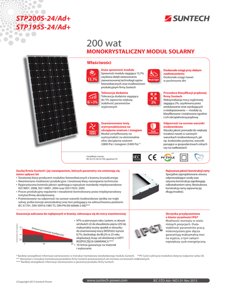 STP200S-24/Ad+ STP195S-24/Ad+ 200 wat MONOKRYSTALICZNY MODUŁ SOLARNY Właściwości 15.7% 0/+5% 3800Pa 5400Pa Duża sprawność modułu Sprawność modułu sięgająca 15,7% uzyskana dzięki zastosowaniu zaawansowanej technologii ogniw fotowoltaicznych oraz możliwościom produkcyjnym firmy Suntech Tolerancja dodatnia Tolerancja dodatnia sięgająca do 5% zapewnia większą stabilność parametrów wyjściowych Zaawansowane testy wytrzymałościowe na obciążenie wiatrem i śniegiem Moduł certyfikowany na wytrzymałość na ekstremalnie silne obciążenia wiatrem (3800 Pa) i śniegiem (5400 Pa) * Weak light 2% Doskonałe osiągi przy słabym nasłonecznieniu Doskonałe osiągi nawet w pochmurne dni Procedura klasyfikacji prądowej firmy Suntech Maksymalizacja mocy wyjściowej sięgająca 2%, uzyskiwana przez zredukowanie strat wynikających z niedopasowania — moduły są klasyfikowane i instalowane zgodnie z ich obciążalnością prądową Odporność na surowe warunki środowiskowe Wysoka jakość prowadzi do większej trwałości nawet w surowych warunkach środowiskowych, jak np. środowisko pustynne, warunki panujące w gospodarstwach rolnych czy na nadbrzeżach ** Certyfikaty i normy: IEC 61215, IEC 61730, zgodność CE Zaufaj firmie Suntech i jej rozwiązaniom, których parametry nie zmieniają się mimo upływu lat • Światowej klasy producent modułów fotowoltaicznych z krzemu krystalicznego • Niezrównane możliwości produkcyjne i światowej klasy rozwiązania techniczne • Rygorystyczna kontrola jakości spełniająca najwyższe standardy międzynarodowe: ISO 9001: 2008, ISO 14001: 2004 oraz ISO17025: 2005 • Proces produkcyjny regularnie i niezależnie kontrolowany przez międzynarodowy instytut/firmę akredytowaną • Przetestowane na odporność na surowe warunki środowiskowe (próba we mgle solnej, próba korozji amoniakalnej oraz test polegający na odmuchiwaniu piaskiem: IEC 61701, DIN 50916:1985 T2, DIN PN-EN 60068-2-68)*** Najwyższa jakość konstrukcji ramy Specjalnie zaprojektowane otwory odprowadzające wodę oraz sztywna konstrukcja zapobiegają odkształceniom ramy. Bezśrubowa konstrukcja ramy zapewnia jej długą trwałość. Gwarancja zaliczana do najlepszych w branży, odnosząca się do mocy znamionowej Skrzynka przyłączeniowa o klasie szczelności IP67 Możliwość montażu w wielu różnych pozycjach. Duża stabilność parametrów pracy, niskorezystancyjne złącza gwarantują maksymalną moc na wyjściu, a tym samym największy zysk energetyczny. Gwarantowana moc wyjściowa • 97% w pierwszym roku i potem, w okresie 100% liniow a gwa 97% 10 rancja 90% wyda 80,2% 80% jnośc 25 1 10 i od dwóch (2) do dwudziestu pięciu (25) lat, maksymalny roczny spadek w stosunku do znamionowej mocy MODUŁU wynosi 0,7%, dochodząc do 80,2% w 25 roku eksploatacji, licząc od określonej w DATY ROZPOCZĘCIA GWARANCJI.**** 25 • 10-letnia gwarancja na materiał i wykonanie * Bardziej szczegółowe informacje zamieszczono w instrukcji montażowej standardowego modułu Suntech. **PV Cycle (cykl życia modułów) dotyczy wyłącznie rynku UE. *** Skorzystać z instrukcji montażowej produktów firmy Suntech przeznaczonych do montażu na terenach nadbrzeżnych. **** Bardziej szczegółowe informacje zamieszczono w gwarancji produktu firmy Suntech. ©Copyright 2013 Suntech Power www.suntech-power.com IEC-STD-Ad+-NO1.01-Rev 2013 STP200S-24/Ad+ STP195S-24/Ad+ Charakterystyka elektryczna 758 [29,9] ± 1 Skrzynka przyłączeniowa Otwory odprowadzające wodę STC Etykieta produktu 14 × 9 [0,55 × 0,35] Szczeliny montażowe w 8 miejscach 1000 [39,4] A A 1580 [62,2] ±2 1300 [51,2] ±1 800 [31,5] ±1 2-ø5,1 [ø0,2] Otwory do podłączenia uziemienia w 2 miejscach STP200S-24/Ad+ STP195S-24/Ad+ Moc maksymalna dla STC (Pmax) 200 W 195 W Optymalne napięcie pracy (Vmp) 36,7 V 36,6 V Optymalny prąd pracy (Imp) 5,45 A 5,33 A Napięcie jałowe (Voc) 45,5 V 45,4 V Prąd zwarciowy (Isc) 5,81 A 5,69 A Sprawność modułu 15,7% -40°C do +85°C Maksymalne napięcie układu 1000 V DC (IEC) Maksymalny prąd nominalny bezpiecznika dla połączenia szeregowego Odchyłka mocy 0/+5% NOCT Przekrój A-A 35 [1,4] 11 [0,4] Widok od przodu 35 [1,4] 808 [31,8] ±2 STP200S-24/Ad+ STP195S-24/Ad+ Maksymalna moc przy NOCT (Pmax) 146 W 142 W Optymalne napięcie pracy (Vmp) 33,3 V 33,2 V Optymalny prąd pracy (Imp) 4,37 A 4,27 A Napięcie jałowe (Voc) 42,3 V 41,8 V Prąd zwarciowy (Isc) 4,68 A 4,61 A NOCT: Natężenie promieniowania 800 W/m2, temperatura otoczenia 20°C, AM=1,5, prędkość wiatru 1 m/s; Zastosowano najlepszy w klasie AAA symulator solarny (IEC 60904-9), niepewność pomiaru mocy zawiera się w granicach +/- 3% Krzywa zależności Prąd-Napięcie oraz Moc-Napięcie (195S-24) 6 200 180 5 160 4 Prąd (A) 15 A STC: natężenie promieniowania 1000 W/m2, temperatura modułu 25°C, AM=1,5; Zastosowano najlepszy w klasie AAA symulator solarny (IEC 60904-9), niepewność pomiaru mocy zawiera się w granicach +/- 3% WIDOK OD TYŁU Uwaga: mm [cale] 15,3% Temperatura robocza modułu 3 Charakterystyka temperaturowa Nominalna temperatura robocza ogniwa (NOCT) 45±2°C Współczynnik temperaturowy Pmax -0,45 %/°C 140 Współczynnik temperaturowy Voc -0,34 %/°C 120 Współczynnik temperaturowy Isc 0,050 %/°C 100 80 2 60 40 1 20 0 0 0 10 20 30 40 50 400 W/m2 200 W/m2 Napięcie (V) 1000 W/m2 800 W/m2 600 W/m2 Doskonałe osiągi przy słabym nasłonecznieniu: przy natężeniu promieniowania 200 W/m2 (AM 1,5, 25°C); uzyskiwana jest sprawność stanowiąca 95,5% lub więcej sprawności dla warunków standardowych (STC) (1000 W/m2) Informacje sprzedawcy Charakterystyka mechaniczna Ogniowo fotowoltaiczne Krzem monokrystaliczny 125 × 125 mm (5 cali) Liczba ogniw 72 (6 × 12) Wymiary 1580 × 808 × 35 mm (62,2 × 31,8 × 1,4 cala) Masa 15,5 kg (34,1 funta) Przednia szyba 3,2 mm (0,13 cala) szkło hartowane Rama Anodyzowany stop aluminium Skrzynka przyłączeniowa Klasa szczelności IP67 (3 dio