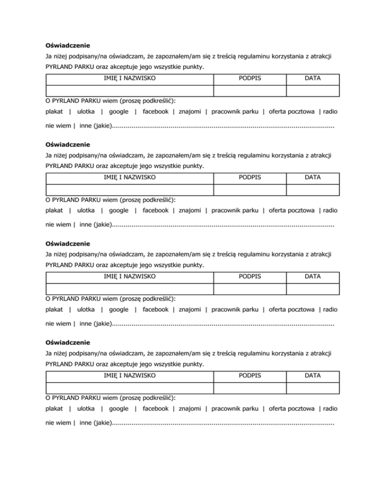 Oświadczenie Ja niżej podpisany/na oświadczam, że zapoznałem/am się z treścią regulaminu korzystania z atrakcji PYRLAND PARKU oraz akceptuje jego wszystkie punkty. IMIĘ I NAZWISKO PODPIS DATA O PYRLAND PARKU wiem (proszę podkreślić): plakat | ulotka | google | facebook | znajomi | pracownik parku | oferta pocztowa | radio nie wiem | inne (jakie).................................................................................................................. Oświadczenie Ja niżej podpisany/na oświadczam, że zapoznałem/am się z treścią regulaminu korzystania z atrakcji PYRLAND PARKU oraz akceptuje jego wszystkie punkty. IMIĘ I NAZWISKO PODPIS DATA O PYRLAND PARKU wiem (proszę podkreślić): plakat | ulotka | google | facebook | znajomi | pracownik parku | oferta pocztowa | radio nie wiem | inne (jakie).................................................................................................................. Oświadczenie Ja niżej podpisany/na oświadczam, że zapoznałem/am się z treścią regulaminu korzystania z atrakcji PYRLAND PARKU oraz akceptuje jego wszystkie punkty. IMIĘ I NAZWISKO PODPIS DATA O PYRLAND PARKU wiem (proszę podkreślić): plakat | ulotka | google | facebook | znajomi | pracownik parku | oferta pocztowa | radio nie wiem | inne (jakie).................................................................................................................. Oświadczenie Ja niżej podpisany/na oświadczam, że zapoznałem/am się z treścią regulaminu korzystania z atrakcji PYRLAND PARKU oraz akceptuje jego wszystkie punkty. IMIĘ I NAZWISKO PODPIS DATA O PYRLAND PARKU wiem (proszę podkreślić): plakat | ulotka | google | facebook | znajomi | pracownik parku | oferta pocztowa | radio nie wiem | inne (jakie)..................................................................................................................