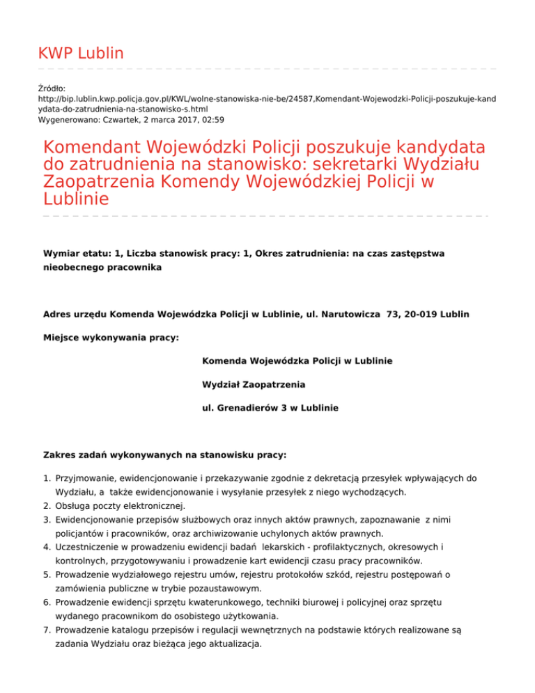 KWP Lublin Źródło: http://bip.lublin.kwp.policja.gov.pl/KWL/wolne-stanowiska-nie-be/24587,Komendant-Wojewodzki-Policji-poszukuje-kand ydata-do-zatrudnienia-na-stanowisko-s.html Wygenerowano: Czwartek, 2 marca 2017, 02:59 Komendant Wojewódzki Policji poszukuje kandydata do zatrudnienia na stanowisko: sekretarki Wydziału Zaopatrzenia Komendy Wojewódzkiej Policji w Lublinie Wymiar etatu: 1, Liczba stanowisk pracy: 1, Okres zatrudnienia: na czas zastępstwa nieobecnego pracownika Adres urzędu Komenda Wojewódzka Policji w Lublinie, ul. Narutowicza 73, 20-019 Lublin Miejsce wykonywania pracy: Komenda Wojewódzka Policji w Lublinie Wydział Zaopatrzenia ul. Grenadierów 3 w Lublinie Zakres zadań wykonywanych na stanowisku pracy: 1. Przyjmowanie, ewidencjonowanie i przekazywanie zgodnie z dekretacją przesyłek wpływających do Wydziału, a także ewidencjonowanie i wysyłanie przesyłek z niego wychodzących. 2. Obsługa poczty elektronicznej. 3. Ewidencjonowanie przepisów służbowych oraz innych aktów prawnych, zapoznawanie z nimi policjantów i pracowników, oraz archiwizowanie uchylonych aktów prawnych. 4. Uczestniczenie w prowadzeniu ewidencji badań lekarskich - profilaktycznych, okresowych i kontrolnych, przygotowywaniu i prowadzenie kart ewidencji czasu pracy pracowników. 5. Prowadzenie wydziałowego rejestru umów, rejestru protokołów szkód, rejestru postępowań o zamówienia publiczne w trybie pozaustawowym. 6. Prowadzenie ewidencji sprzętu kwaterunkowego, techniki biurowej i policyjnej oraz sprzętu wydanego pracownikom do osobistego użytkowania. 7. Prowadzenie katalogu przepisów i regulacji wewnętrznych na podstawie których realizowane są zadania Wydziału oraz bieżąca jego aktualizacja. Warunki pracy Praca biurowa przy monitorze ekranowym powyżej połowy dobowego wymiaru czasu pracy, przy oświetleniu naturalnym i sztucznym. Godziny pracy: 6.00-14.00 lub 7.30-15.30 lub 8.00-16.00 (zgodnie z harmonogramem). Stanowisko pracy usytuowane jest w budynku dwukondygnacyjnym na II piętrze, w pokoju biurowym wyposażonym w meble biurowe, sprzęt komputerowy i inne urządzenia biurowe. Korytarz, drzwi wejściowe do budynku, pomieszczenia biurowe i higieniczno-sanitarne nie są przystosowane dla osób niepełnosprawnych poruszających się na wózkach inwalidzkich. Wymagania związane ze stanowiskiem pracy Wymagania niezbędne 1. wykształcenie - średnie, 2. umiejętności: ❍ znajomość przepisów regulujących zagadnienia wynikające ze stosunku pracy i służby, ❍ umiejętność obsługi komputera (pakiet biurowy, Internet), ❍ umiejętność poprawnego redagowania pism urzędowych, ❍ umiejętność dokładnego liczenia, ❍ umiejętność analitycznego myślenia, ❍ umiejętność komunikowania się, argumentowania oraz asertywność, ❍ wysoka kultura osobista Wymagania pożądane: 1. doświadczenie zawodowe – minimum 0,5 roku w pracy biurowej, Wymagane dokumenty i oświadczenia: ● list motywacyjny ● curriculum vitae (lub życiorys), ● oświadczenie kandydata o wyrażeniu zgody na przetwarzanie danych osobowych do celów rekrutacji, ● kopie dokumentów potwierdzających posiadane wykształcenie i doświadczenie zawodowe. Termin składania dokumentów: do 27 stycznia 2017 roku. Miejsce składania dokumentów: Sekretariat Wydziału Zaopatrzenia Komendy Wojewódzkiej Policji w Lublinie, ul. Grenadierów 3, 20-331 Lublin Inne informacje: Komendant Wojewódzki Policji w Lublinie proponuje zatrudnienie na podstawie umowy o pracę na czas zastępstwa nieobecnego pracownika. Zatrudnienie osoby wyłonionej w drodze naboru będzie realizowane w lutym 2017r. Nawiązanie stosunku pracy z wyłonionym w drodze naboru kandydatem może nastąpić po przeprowadzeniu przez Pełnomocnika Komendanta Wojewódzkiego Policji w Lublinie ds. Ochrony Informacji Niejawnych postępowania sprawdzającego i wydaniu poświadczenia lub po potwierdzeniu faktu wydania i ważności poświadczenia bezpieczeństwa w przypadku legitymowania się poświadczeniem bezpieczeństwa wydanym przez uprawniony podmiot. Wysokość proponowanego wynagrodzenia brutto wynosi 2 000,00 zł. Praca wykonywana jest od poniedziałku do piątku, w godz. 6.00-14.00 lub 7.30-15.30 lub 8.00-16.00 (zgodnie z harmonogramem) Informacje dodatkowe można uzyskać pod nr tel. 81 535 44 64. Metryczka Data publikacji 13.01.2017 Data modyfikacji 12.01.2017 Rejestr zmian Podmiot udostępniający informację: Biuletyn Informacji Publicznej Osoba wytwarzająca/odpowiadająca za informację: Osoba udostępniająca informację: Patrycja Czuk Wydział Kadr i Szkolenia KWP Lublin Osoba modyfikująca informację: Patrycja Czuk