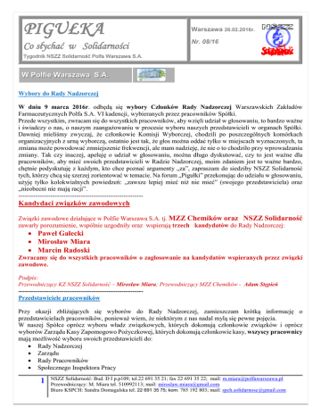 PIGUŁKA Co słychać w Solidarności Warszawa 26.02.2016r. Nr. 08/16 Tygodnik NSZZ Solidarność Polfa Warszawa S.A. W Polfie Warszawa S.A. Wybory do Rady Nadzorczej W dniu 9 marca 2016r. odbędą się wybory Członków Rady Nadzorczej Warszawskich Zakładów Farmaceutycznych Polfa S.A. VI kadencji, wybieranych przez pracowników Spółki. Przede wszystkim, zwracam się do wszystkich pracowników, aby wzięli udział w głosowaniu, to bardzo ważne i świadczy o nas, o naszym zaangażowaniu w procesie wyboru naszych przedstawicieli w organach Spółki. Dawniej mieliśmy zwyczaj, że członkowie Komisji Wyborczej, chodzili po poszczególnych komórkach organizacyjnych z urną wyborczą, ostatnio jest tak, że głos można oddać tylko w miejscach wyznaczonych, ta zmiana może powodować zmniejszenie frekwencji, ale mam nadzieję, że nie o to chodziło przy wprowadzaniu zmiany. Tak czy inaczej, apeluję o udział w głosowaniu, można długo dyskutować, czy to jest ważne dla pracowników, aby mieć swoich przedstawicieli w Radzie Nadzorczej, moim zdaniem jest to ważne bardzo, chętnie podyskutuję z każdym, kto chce poznać argumenty „za”, zapraszam do siedziby NSZZ Solidarność tych, którzy chcą się szerzej zorientować w temacie. Na forum „Pigułki” przekonując do udziału w głosowaniu, użyję tylko kolokwialnych powiedzeń: „zawsze lepiej mieć niż nie mieć” (swojego przedstawiciela) oraz „nieobecni nie mają racji”. ---------------------------------------------------------- Kandydaci związków zawodowych Związki zawodowe działające w Polfie Warszawa S.A. tj. MZZ Chemików oraz NSZZ Solidarność zawarły porozumienie, wspólnie uzgodniły oraz wspierają trzech kandydatów do Rady Nadzorczej: Paweł Gałecki Mirosław Miara Marcin Radoski Zwracamy się do wszystkich pracowników o zagłosowanie na kandydatów wspieranych przez związki zawodowe. Podpis: Przewodniczący KZ NSZZ Solidarność – Mirosław Miara; Przewodniczący MZZ Chemików - Adam Stępień ---------------------------------------------------------Przedstawiciele pracowników Przy okazji zbliżających się wyborów do Rady Nadzorczej, zamieszczam krótką informację o przedstawicielach pracowników, ponieważ wiem, że niektórym z nas nadal mylą się pewne pojęcia. W naszej Spółce oprócz wyboru władz związkowych, których dokonują członkowie związków i oprócz wyborów Zarządu Kasy Zapomogowo Pożyczkowej, których dokonują członkowie kasy, wszyscy pracownicy mają możliwość wyboru swoich przedstawicieli do: Rady Nadzorczej Zarządu Rady Pracowników Społecznego Inspektora Pracy 1 NSZZ Solidarność: Bud. D I p.p109; tel.22 691 35 21; fax 22 691 35 22; mail: [email protected] Przewodniczący: M. Miara tel. 510992113; mail: [email protected] Biuro KSPCH: Sandra Domagalska tel. 22 691 35 75; kom: 785 192 803; mail: [email protected] Społeczny Inspektor Pracy ( nasz SIP, to Tomasz Żurawski). Zasady wyboru i działania reguluje Ustawa z dnia 24 czerwca 1983 r. o społecznej inspekcji pracy. (Dz. U. z 1983 r. Nr 35, poz. 163). Społeczna inspekcja pracy została powołana w trosce o poprawę stanu bezpieczeństwa i higieny pracy oraz w celu zapewnienia związkom zawodowym niezbędnych warunków do sprawowania skutecznej kontroli przestrzegania przepisów prawa pracy. Rada Pracowników to organ, który działa od niedawna, bo od 2006 roku. Zasady działania Rady Pracowników reguluje ustawa z dnia 7 kwietnia 2006 r. o informowaniu pracowników i przeprowadzaniu z nimi konsultacji (Dz. U. z 2006 r. Nr 79, poz. 550). Główne kompetencje Rady Pracowników polegają na tym, że pracodawca ma obowiązek informowania Radę o: działalności i sytuacji ekonomicznej przedsiębiorstwa oraz przewidywanych w tym zakresie zmianach; stanie, strukturze i przewidywanych zmianach zatrudnienia oraz działaniach mających na celu utrzymanie jego poziomu; działaniach, które mogą powodować istotne zmiany w organizacji pracy lub podstawach zatrudnienia. Natomiast obowiązek konsultacji dotyczy tylko stanu, struktury, przewidywanych zmian w zakresie zatrudnienia, jego podstaw oraz organizacji pracy, nie dotyczy działalności i sytuacji ekonomicznej przedsiębiorstwa. Obecny skład Rady Pracowników to: Marcin Radoski, Janina Żukowicz, Joanna Michalska; Kalicka Teresa; Przyjemska Ewa, Jolanta Trzaskowska, Mirosław Fieduszkin Sosnowski, Zarząd to oczywiście Prezes i członkowie Zarządu, powoływani przez Radę Nadzorczą Spółki. Zarząd to organ wykonawczy spółek kapitałowych, którego głównym zadaniem jest prowadzenie spraw spółki i jej reprezentacja. Sposób działania Zarządu reguluje ustawa kodeks spółek handlowych (Dz. U. z 2000 r. Nr 94, poz. 1037) oraz Statut Spółki. Oczywiście członkowie Zarządu, to osoby reprezentujące właściciela Spółki ( Zarząd Polfy: Tomasz Moys; Katarzyna Goławska; Maciej Fabiańczyk), natomiast zgodnie ze Statutem Polfy Warszawa S.A. pracownicy mają prawo wyboru jednego członka Zarządu i bodajże dwa lata temu, wybraliśmy naszego przedstawiciela – Małgorzatę Cegielską – Matysiak. Wobec powyższego obecny skład Zarządu to: Tomasz Moys (Prezes); Katarzyna Goławska; Maciej Fabiańczyk, Małgorzata Cegielska – Matysiak. Rada Nadzorcza to organ powołany do wykonywania czynności nadzoru. Zasady działania RN reguluje kodeks spółek handlowych oraz Statut Spółki. W skład Rady Nadzorczej mogą wchodzić obok przedstawicieli akcjonariuszy, również przedstawiciele pracowników. Rada Nadzorcza powołuje i odwołuje kierownictwo przedsiębiorstw, przyjmuje sprawozdania i decyduje o inwestycjach. Do obowiązków Rady Nadzorczej należą: Powoływanie i odwoływanie członków Zarządu Spółki, Badanie rachunku zysków i strat jak i samego bilansu oraz porównywanie ich z księgami, Zatwierdzanie rocznych planów działania Spółki, Kontrola sprawozdań zarządu, co do podziału zysków i pokrycia strat, oraz skład