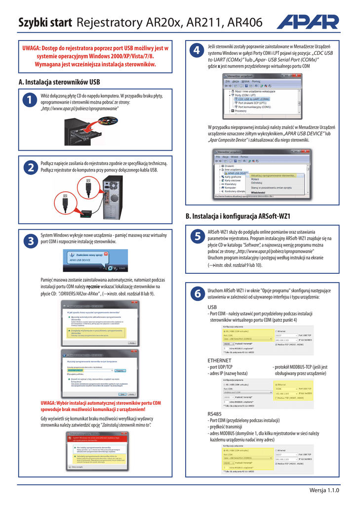 Szybki start Rejestratory AR20x, AR211, AR406 UWAGA: Dostęp do rejestratora poprzez port USB możliwy jest w systemie operacyjnym Windows 2000/XP/Vista/7/8. Wymagana jest wcześniejsza instalacja sterowników. 4 Jeśli sterowniki zostały poprawnie zainstalowane w Menadżerze Urządzeń systemu Windows w gałęzi Porty COM i LPT pojawi się pozycja: „CDC USB to UART (COMx)” lub „Apar- USB Serial Port (COMx)” gdzie x jest numerem przydzielonego wirtualnego portu COM A. Instalacja sterowników USB 1 Włóż dołączoną płytę CD do napędu komputera. W przypadku braku płyty, oprogramowanie i sterowniki można pobrać ze strony: „http://www.apar.pl/pobierz/oprogramowanie" W przypadku niepoprawnej instalacji należy znaleźć w Menadżerze Urządzeń urządzenie oznaczone żółtym wykrzyknikiem „APAR USB DEVICE” lub „Apar Composite Device” i zaktualizować dla niego sterowniki. 2 Podłącz napięcie zasilania do rejestratora zgodnie ze specyfikacją techniczną. Podłącz rejestrator do komputera przy pomocy dołączonego kabla USB. B. Instalacja i konfiguracja ARSoft-WZ1 3 System Windows wykryje nowe urządzenia - pamięć masową oraz wirtualny port COM i rozpocznie instalację sterowników. Pamięć masowa zostanie zainstalowana automatycznie, natomiast podczas instalacji portu COM należy ręcznie wskazać lokalizację sterowników na płycie CD: "/DRIVERS/AR2xx-AR4xx" , (® instr. obsł. rozdział 8 lub 9). 5 ARSoft-WZ1 służy do podglądu online pomiarów oraz ustawiania parametrów rejestratora. Program instalacyjny ARSoft-WZ1 znajduje się na płycie CD w katalogu "Software", a najnowszą wersję programu można pobrać ze strony: „http://www.apar.pl/pobierz/oprogramowanie" Uruchom program instalacyjny i postępuj według instrukcji na ekranie (® instr. obsł. rozdział 9 lub 10). 6 Uruchom ARSoft-WZ1 i w oknie "Opcje programu" skonfiguruj następujące ustawienia w zależności od używanego interfejsu i typu urządzenia: USB - Port COM - należy ustawić port przydzielony podczas instalacji sterowników wirtualnego portu COM (patrz punkt 4) ETHERNET - port UDP/TCP - adres IP (nazwę hosta) UWAGA: Wybór instalacji automatycznej sterowników portu COM spowoduje brak możliwości komunikacji z urządzeniem! Gdy wyświetli się komunikat braku możliwości weryfikacji wydawcy sterownika należy zatwierdzić opcję "Zainstaluj sterownik mimo to". - protokół MODBUS-TCP (jeśli jest obsługiwany przez urządzenie) RS485 - Port COM (przydzielony podczas instalacji) - prędkość transmisji - adres MODBUS (domyślnie 1, dla kilku rejestratorów w sieci należy każdemu urządzeniu nadać inny adres) Wersja 1.1.0 Szybki start Rejestratory AR20x, AR211, AR406 B. Uruchomienie rejestracji 7 Ustaw opcje rejestracji, skonfiguruj wejścia pomiarowe oraz sprawdź poprawność czasu zegara wewnętrznego urządzenia: C. Odczyt zarejestrowanych danych 10 AR200, AR205, AR206 instr. obsł. punkty 12.1, 12.3 oraz 12.8, AR201, AR211 - instr. obsł. punkty 11.1, 11.2 oraz 11.3, AR406 - instr. obsł. punkty 13.1, 13.3 oraz 13.8. AR207 - instr. obsł. punkty 12.2, 12.4 oraz 12.8 Konfigurację można wykonać ręcznie przy pomocy klawiatury urządzenia lub przy pomocy ARSoft-WZ1 (patrz poniższe punkty) Po zakończeniu konfiguracji urządzenie rozpocznie rejestrację zgodnie z harmonogramem ustalonym w opcjach rejestracji. C.1 Odczyt danych poprzez USB 11 8 Podłącz rejestrator do komputera. W systemie Windows pojawi się nowy dysk wymienny (lub 2, jeśli do w urządzeniu jest karta SD). UWAGA: Urządzenie musi być ustawione w trybie pracy USB "Dostępny dla komputera" UWAGA: Urządzenie nie rejestruje danych w czasie połączenia rejestratora z komputerem kablem USB. Uruchom ARSoft-WZ1 a następnie po nawiązaniu komunikacji z urządzeniem kliknij "Parametry" Odczyt danych jest możliwy bezpośrednio poprzez podgląd plików CSV lub w ARSoft-WZ3. Program instalacyjny ARSoft-WZ3 znajduje się na płycie CD w katalogu "Software", a najnowszą wersję programu można pobrać ze strony: „http://www.apar.pl/pobierz/oprogramowanie". Import plików możliwy jest poprzez USB, Ethernet lub kartę SD/pendrive. 12 Uruchom ARSoft-WZ3, kliknij "Wczytaj z pliku" i z dysku wymiennego rejestratora otwórz jeden z plików archiwum z rozszerzeniem CSV. Pojawi się okno w którym można przypisać nazwy kanałom danego rejestratora. Zatwierdź wybór, pomiary zostaną wczytane do bazy danych 13 9 Ustaw zgodnie z instrukcją obsługi wszystkie parametry wymagające zmian, a po zakończeniu kliknij zatwierdź zmiany. Po zamknięciu okna "Edycja parametrów" kliknij "Odłącz". Możesz przystąpić do konfiguracji następnego urządzenia. UWAGA: W przypadku jednoczesnego użytkowania wielu rejestratorów należy każdemu nadać inny numer ID Kliknij "Raporty". Zaznacz do 8 punktów pomiarowych dla których chcesz sporządzić raport. Po kliknięciu "Wykonaj" zostanie sporządzony wykres oraz tabela dla danych pomiarowych wybranych punktów. C.2 Odczyt danych poprzez Ethernet 14 Uruchom ARSoft-WZ3, kliknij "Pobierz przez LAN", wpisz adres IP oraz port UDP urządzania i kliknij "Połącz". Przy prawidłowym połączeniu program wylistuje pliki z rejestratora. Po wciśnięciu "Kopiuj" pliki zostaną skopiowane do komputera, a następnie wczytane do bazy danych. Wersja 1.1.1 2014.08.08