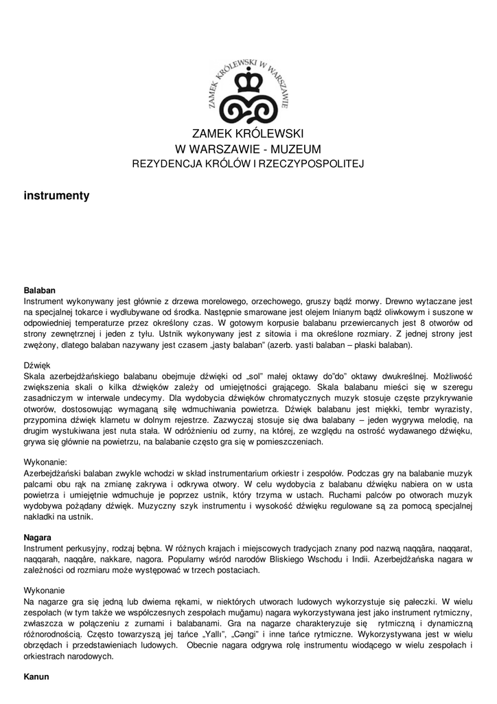 ZAMEK KRÓLEWSKI W WARSZAWIE - MUZEUM REZYDENCJA KRÓLÓW I RZECZYPOSPOLITEJ instrumenty Balaban Instrument wykonywany jest głównie z drzewa morelowego, orzechowego, gruszy bądź morwy. Drewno wytaczane jest na specjalnej tokarce i wydłubywane od środka. Następnie smarowane jest olejem lnianym bądź oliwkowym i suszone w odpowiedniej temperaturze przez określony czas. W gotowym korpusie balabanu przewiercanych jest 8 otworów od strony zewnętrznej i jeden z tyłu. Ustnik wykonywany jest z sitowia i ma określone rozmiary. Z jednej strony jest zwężony, dlatego balaban nazywany jest czasem „jasty balaban” (azerb. yasti balaban – płaski balaban). Dźwięk Skala azerbejdżańskiego balabanu obejmuje dźwięki od „sol” małej oktawy do”do” oktawy dwukreślnej. Możliwość zwiększenia skali o kilka dźwięków zależy od umiejętności grającego. Skala balabanu mieści się w szeregu zasadniczym w interwale undecymy. Dla wydobycia dźwięków chromatycznych muzyk stosuje częste przykrywanie otworów, dostosowując wymaganą siłę wdmuchiwania powietrza. Dźwięk balabanu jest miękki, tembr wyrazisty, przypomina dźwięk klarnetu w dolnym rejestrze. Zazwyczaj stosuje się dwa balabany – jeden wygrywa melodię, na drugim wystukiwana jest nuta stała. W odróżnieniu od zurny, na której, ze względu na ostrość wydawanego dźwięku, grywa się głównie na powietrzu, na balabanie często gra się w pomieszczeniach. Wykonanie: Azerbejdżański balaban zwykle wchodzi w skład instrumentarium orkiestr i zespołów. Podczas gry na balabanie muzyk palcami obu rąk na zmianę zakrywa i odkrywa otwory. W celu wydobycia z balabanu dźwięku nabiera on w usta powietrza i umiejętnie wdmuchuje je poprzez ustnik, który trzyma w ustach. Ruchami palców po otworach muzyk wydobywa pożądany dźwięk. Muzyczny szyk instrumentu i wysokość dźwięku regulowane są za pomocą specjalnej nakładki na ustnik. Nagara Instrument perkusyjny, rodzaj bębna. W różnych krajach i miejscowych tradycjach znany pod nazwą naqqāra, naqqarat, naqqarah, naqqåre, nakkare, nagora. Popularny wśród narodów Bliskiego Wschodu i Indii. Azerbejdżańska nagara w zależności od rozmiaru może występować w trzech postaciach. Wykonanie Na nagarze gra się jedną lub dwiema rękami, w niektórych utworach ludowych wykorzystuje się pałeczki. W wielu zespołach (w tym także we współczesnych zespołach muğamu) nagara wykorzystywana jest jako instrument rytmiczny, zwłaszcza w połączeniu z zurnami i balabanami. Gra na nagarze charakteryzuje się rytmiczną i dynamiczną różnorodnością. Często towarzyszą jej tańce „Yallı”, „Cəngi” i inne tańce rytmiczne. Wykorzystywana jest w wielu obrzędach i przedstawieniach ludowych. Obecnie nagara odgrywa rolę instrumentu wiodącego w wielu zespołach i orkiestrach narodowych. Kanun Kanun W Azerbejdżanie kanun to drewniane pudło rezonansowe o prostokątnej formie trapezu. Jego dolna i boczne ściany wykonywane są z brzozy, orzechu, moreli i innych rodzajów twardego drewna. Całkowita długość kanunu 800–900 mm, szerokość 380–400 mm, grubość 40–50 mm. Azerbejdżański kanun odróżnia się od tureckiego i arabskiego rozmiarem, w tym oktawą składającą się z 17 stopni. Jego górna część zbudowana jest z drewnianego przykrycia o grubości około 4 mm, wyrabianego z sosny. Pozostała część pokrywana jest rybią skórą. Na drewnianej części góry wykonane są trzy otwory rezonansowe. Na części skórzanej, podzielonej na równe 4 odcinki, umieszczona jest drewniana podstawka, której długość równa jest szerokości całego instrumentu. Struny, które są przyczepione jednym końcem do specjalnych otworów, przechodzą nad podstawką i drugą stroną przyczepione są do mostku. Koło mostku pod strunami umieszczone są „lingi” (żelazne dźwignie), za pomocą których struny, podnosząc się i opadając, zmieniają wysokość dźwięku na ton i półton. Na kanunie znajdują się 24 rzędy potrójnych strun, łącznie jest ich 72. Dawniej struny wykonywane były w określony sposób z jedwabiu i jelit. Obecnie wykorzystywane są struny nylonowe. Wykonanie Azerbejdżański kulturoznawca, docent Katedry Ludowych Instrumentów Muzycznych Bakijskiej Akademii Muzycznej, Medżnun Kerimow opisuje sposób gry na kanunie następująco: „Kanun stawia się na kolanach (długą stroną do siebie). Na czas gry na nim na palce wskazujące obu rąk nakłada się metalowe naparstki, pod które podkłada się kostki do gry. Instrument stroi się przy pomocy żelaznego klucza, którego część wewnętrzna posiada czworokątną formę. Skala dźwięku instrumentu obejmuje dźwięki 3,5 oktawy od „sol” dużej oktawy do „c-bemol” drugiej oktawy. Kanun wchodzi w skład orkiestr i zespołów narodowych, jako instrument akompaniujący i solo. W azerbejdżańskiej orkiestrze instrumentów narodowych kanuny wykorzystywane są jako oddzielna grupa (nie mniej niż 4 instrumenty) jako instrument akompaniujący i solo. W muzycznej praktyce Azerbejdżanu na kanunie wykonuje się także muğam (głównie muğamy „Bajaty-Sziraz” i „Czachargiach”). Jest to jeden z tych instrumentów, na których muğam wykonuje się z dużą dokładnością. Kamancha Azerbejdżańska kamancha składa się z korpusu, gryfu i iglicy, która przechodzi przez wewnętrzną część korpusu na zewnątrz i łączy dwie części korpusu. Korpus, gryf i kolki kamanchy wykonywane są na specjalnej obrabiarce. Ważnym aspektem dobrego dźwięku instrumentu jest określenie odległości między gryfem i strunami. Całkowita długość instrumentu – 700 mm, wysokość korpusu – 175 mm, a szerokość – 195 mm. Dźwięk i gra Skala kamanchy obejmuje dźwięki od „la” małej oktawy do „la” trzeciej oktawy. Muzyczne partie dla kamanchy zapisywane są w skrzypcowym kluczu sol. Brzmią one jednak o jeden ton wyżej od zapisanego. Kamanch
