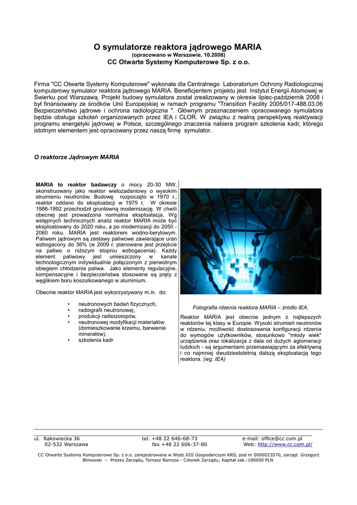 O symulatorze reaktora jądrowego MARIA (opracowano w Warszawie, 10.2008) CC Otwarte Systemy Komputerowe Sp. z o.o. Firma "CC Otwarte Systemy Komputerowe" wykonała dla Centralnego Laboratorium Ochrony Radiologicznej komputerowy symulator reaktora jądrowego MARIA. Beneficjentem projektu jest Instytut Energii Atomowej w Świerku pod Warszawą. Projekt budowy symulatora został zrealizowany w okresie lipiec-październik 2008 i był finansowany ze środków Unii Europejskiej w ramach programu "Transition Facility 2005/017-488.03.06 Bezpieczeństwo jądrowe i ochrona radiologiczna ". Głównym przeznaczeniem opracowanego symulatora będzie obsługa szkoleń organizowanych przez IEA i CLOR. W związku z realną perspektywą reaktywacji programu energetyki jądrowej w Polsce, szczególnego znaczenia nabiera program szkolenia kadr, którego istotnym elementem jest opracowany przez naszą firmę symulator. O reaktorze Jądrowym MARIA MARIA to reaktor badawczy o mocy 20-30 MW, skonstruowany jako reaktor wielozadaniowy o wysokim strumieniu neutronów. Budowę rozpoczęto w 1970 r., reaktor oddano do eksploatacji w 1975 r, W okresie 1986-1992 przechodził gruntowną modernizację. W chwili obecnej jest prowadzona normalna eksploatacja. Wg wstępnych technicznych analiz reaktor MARIA może być eksploatowany do 2020 roku, a po modernizacji do 2050 2060 roku. MARIA jest reaktorem wodno-berylowym. Paliwem jądrowym są zestawy paliwowe zawierające uran wzbogacony do 36% (w 2009 r. planowane jest przejście na paliwo o niższym stopniu wzbogacenia). Każdy element paliwowy jest umieszczony w kanale technologicznym indywidualnie połączonym z pierwotnym obiegiem chłodzenia paliwa. Jako elementy regulacyjne, kompensacyjne i bezpieczeństwa stosowane są pręty z węglikiem boru koszulkowanego w aluminium. Obecnie reaktor MARIA jest wykorzystywany m.in. do: • • • • • neutronowych badań fizycznych, radiografii neutronowej, produkcji radioizotopów, neutronowej modyfikacji materiałów (domieszkowanie krzemu, barwienie minerałów), szkolenia kadr ul. Rakowiecka 36 02-532 Warszawa Fotografia rdzenia reaktora MARIA – źródło IEA. Reaktor MARIA jest obecnie jednym z najlepszych reaktorów tej klasy w Europie. Wysoki strumień neutronów w rdzeniu, możliwość dostosowania konfiguracji rdzenia do wymogów użytkowników, stosunkowo "młody wiek" urządzenia oraz lokalizacja z dala od dużych aglomeracji ludzkich - są argumentami przemawiającymi za efektywną i co najmniej dwudziestoletnią dalszą eksploatacją tego reaktora. (wg. IEA) tel. +48 22 646-68-73 fax +48 22 606-37-80 e-mail: [email protected] Web: http://www.cc.com.pl/ CC Otwarte Systemy Komputerowe Sp. z o.o. zarejestrowana w Wydz.XIII Gospodarczym KRS, pod nr 0000023570, zarząd: Grzegorz Blinowski – Prezes Zarządu, Tomasz Ramsza - Członek Zarządu; Kapitał zak.:100000 PLN O symulatorze Opracowany symulator obejmuje: zjawiska neutronowe zachodzące w reaktorze, automatykę sterowania oraz procesy średnio-trwałe takie jak zatrucie jodowo-ksenonowe. Symulator wiernie oddaje wygląd sterowni reaktora w zakresie symulowanych zjawisk. Zobrazowany jest panel sterujący oraz wizualizacja rdzenia - tak jak w sterowni reaktora. Symulacja obejmuje takie fazy pracy jak: rozruch, pracę w stanie stabilnym, zatrzymanie oraz zatrucie. Symulacja realizowana jest poprzez numeryczne rozwiązywanie w czasie rzeczywistym zestawu równań różniczkowych opisujących głównie bilans neutronowy reaktora. Model matematyczny reaktora opracowany został przy współudziale pracowników IEA w Świerku. Program symulatora napisano z wykorzystaniem technologii Microsoft .Net Framework 3.5. Interfejs użytkownika aplikacji zaprojektowany i wykonany z wykorzystaniem Windows Presentation Foundation. Komunikacja między modułami systemu zrealizowana w oparciu o Windows Communication Foundation, umożliwia elastyczną konfigurację protokołu oraz zabezpieczeń transmisji, bez konieczności modyfikacji elementów rozwiązania. W oprogramowaniu symulatora zastosowano model klient-serwer. Do serwera obliczeniowego, na którym wykonywane jest numeryczna symulacja reaktora może być podłączonych wiele stanowisk klienckich. Serwer obliczeniowy posiada funkcjonalność uruchomienia wielu instancji wątków obliczeniowych reaktora, każda instancja symuluje odrębny cykl uruchomienia. Konfiguracja serwera obliczeniowego umożliwia w elastyczny sposób zmianę modelu matematycznego i dostosowanie symulacji do rzeczywistych parametrów reaktora (zmiana reaktywności poszczególnych elementów, zmiana prędkości poruszania prętów, progi bezpieczeństwa, układ elementów na mapie reaktora, modyfikacja współczynników modelu matematycznego, itd.). Typowo konfigurowane są dwa stanowiska - ucznia oraz trenera. Trener posiada wgląd w interfejs użytkowy ucznia, a dodatkowo może m. in. zadawać określone scenariusze zachowania reaktora - np. sytuacje awaryjne. Trener uzyskuje też dodatkowe informacje, które nie są dostępne w rzeczywistej sterowni - np. wykresy czasowe określonych parametrów pracy. Symulator pracuje w czasie rzeczywistym jednak do symulacji zjawisk średnio-terminowych takich jak zatrucie rdzenia (którego przebieg zamyka się w okresie kilku - kilkudziesięciu godzin czasu rzeczywistego) możliwe jest przyśpieszenie czasu symulacji, dla każdej z instancji oddzielnie. Obecne konfiguracja symulatora obejmuje dwa komputery: serwer obliczeniowy będący jednocześnie jednym z terminali klienckich i drugą stację kliencką. Obrazowanie sterowni odbywa się na 3 monitorach 23” i jednym monitorze 40”. ul. Rakowiecka 36 02-532 Warszawa tel. +48 22 646-68-73 fax +48 22 606-37-80 e-mail: [email protected] Web: http://www.cc.com.pl/ CC Otwarte Systemy Komputerowe Sp. z o.o. zarejestrowana w Wydz.XIII Gospodarczym KRS, pod nr 0000023570, zarząd: Grzegorz Blinowski – Prezes Zarządu, Tomasz Ramsza - Członek Zarządu; Kapitał zak.