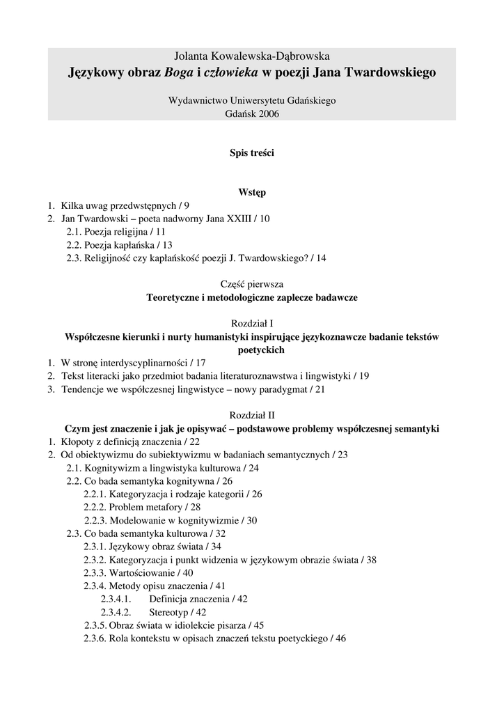 Jolanta Kowalewska-Dąbrowska Językowy obraz Boga i człowieka w poezji Jana Twardowskiego Wydawnictwo Uniwersytetu Gdańskiego Gdańsk 2006 Spis treści Wstęp 1. Kilka uwag przedwstępnych / 9 2. Jan Twardowski – poeta nadworny Jana XXIII / 10 2.1. Poezja religijna / 11 2.2. Poezja kapłańska / 13 2.3. Religijność czy kapłańskość poezji J. Twardowskiego? / 14 Część pierwsza Teoretyczne i metodologiczne zaplecze badawcze Rozdział I Współczesne kierunki i nurty humanistyki inspirujące językoznawcze badanie tekstów poetyckich 1. W stronę interdyscyplinarności / 17 2. Tekst literacki jako przedmiot badania literaturoznawstwa i lingwistyki / 19 3. Tendencje we współczesnej lingwistyce – nowy paradygmat / 21 Rozdział II Czym jest znaczenie i jak je opisywać – podstawowe problemy współczesnej semantyki 1. Kłopoty z definicją znaczenia / 22 2. Od obiektywizmu do subiektywizmu w badaniach semantycznych / 23 2.1. Kognitywizm a lingwistyka kulturowa / 24 2.2. Co bada semantyka kognitywna / 26 2.2.1. Kategoryzacja i rodzaje kategorii / 26 2.2.2. Problem metafory / 28 2.2.3. Modelowanie w kognitywizmie / 30 2.3. Co bada semantyka kulturowa / 32 2.3.1. Językowy obraz świata / 34 2.3.2. Kategoryzacja i punkt widzenia w językowym obrazie świata / 38 2.3.3. Wartościowanie / 40 2.3.4. Metody opisu znaczenia / 41 2.3.4.1. Definicja znaczenia / 42 2.3.4.2. Stereotyp / 42 2.3.5. Obraz świata w idiolekcie pisarza / 45 2.3.6. Rola kontekstu w opisach znaczeń tekstu poetyckiego / 46 Część druga Obrazy semantyczne wybranych pojęć w idiolekcie Jana Twardowskiego Wprowadzenie / 51 1. Przyjęte sposoby opisu / 51 2. Zagadnienie odmiany gatunkowej analizowanych utworów / 54 Rozdział III Obraz Boga 1. Potoczne pojmowanie Boga – trudności definicyjne / 56 2. Poetyckie pojmowanie Boga / 59 2.1. Sposoby mówienia o Bogu i do Boga / 59 2.2. Idiolektalne profile Boga / 61 2.2.1. Jestem bo Jesteś – Bóg jako Ten, który Jest / 62 2.2.2. Bóg jako Stworzyciel / 65 2.2.3. Atrybuty Boga Stwórcy / 70 A. Inność i jedyność Boga / 71 B. Prawdziwość niepoznawalnego Boga / 73 C. Wszechwiedza Boża / 77 D. Wszechmoc Boża / 79 E. Nieobecność a niewidzialność Boga / 81 F. Miłość Boża / 84 G. Miłosierdzie Boże / 87 H. Opiekuńczość i troskliwość Boga – dobrego Ojca / 89 I. Milczenie Boga / 91 J. Wielkość i małość Boga / 97 K. Sprawiedliwość Boża / 99 2.3. Gdzie jest Bóg? / 100 3. Konkluzje / 102 Rozdział IV Obraz anioła 1. Potoczne wyobrażenie anioła / 106 1.1. Angelologiczna charakterystyka anioła / 106 1.2. Anioł a człowiek / 107 2. Poetyckie wyobrażenie anioła / 108 2.1. Anioł jako duch (byt duchowy) – ontyczny profil anioła / 108 2.2. Anioł jako byt opiekuńczy – czyli profil Anioła Stróża / 113 3. Konkluzje / 124 Rozdział V Obraz świętego 1. Rozumienie świętości w języku potocznym / 126 2. Kto to jest święty? Co to jest świętość? Profile kognitywne w wierszach Jana Twardowskiego / 127 2.1. Ogólny ontyczny profil świętego / 127 2.2. Święci w niebie / 134 2.3. Profil świętego kanonizowanego / 134 3. Konkluzje / 140 Rozdział VI Obraz człowieka 1. Potoczne rozumienie pojęcia człowiek – trudności definicyjne / 142 1.1. Konceptualizacja ontyczna / 143 1.2. Konceptualizacja religijna / 145 1.2.1. Obraz wiary (wiara – wiedza – prawda) / 146 2. Poetyckie profile człowieka / 149 2.1. Człowiek jako istota duchowo-cielesna – profil ontyczny / 150 2.2. Relacyjne profile człowieka / 157 2.2.1. Człowiek w kontakcie z Bogiem – profil egzystencjalny / 157 2.2.1.1. Wiara człowieka / 160 2.2.1.2. Miłość człowieka do Boga / 169 2.2.2. Człowiek w drodze do Boga – profil pielgrzyma / 173 3. Konkluzje / 181 Zakończenie 1. Kilka uwag na temat zakresu pola badawczego przyjętego w ramach tej pracy / 185 2. Kształt stylistyczny wierszy Jana Twardowskiego / 187 Bibliografia Opracowania / 190 Tytuły tomików Jana Twardowskiego wraz ze skrótami zastosowanymi w tekście / 200 Skróty publikacji zbiorowych i słowników / 201