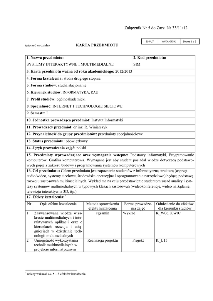 Załącznik Nr 5 do Zarz. Nr 33/11/12 Z1-PU7 (pieczęć wydziału) WYDANIE N1 Strona 1 z 3 KARTA PRZEDMIOTU 1. Nazwa przedmiotu: 2. Kod przedmiotu: SYSTEMY INTERAKTYWNE I MULTIMEDIALNE SIM 3. Karta przedmiotu ważna od roku akademickiego: 2012/2013 4. Forma kształcenia: studia drugiego stopnia 5. Forma studiów: studia stacjonarne 6. Kierunek studiów: INFORMATYKA, RAU 7. Profil studiów: ogólnoakademicki 8. Specjalność: INTERNET I TECHNOLOGIE SIECIOWE 9. Semestr: I 10. Jednostka prowadząca przedmiot: Instytut Informatyki 11. Prowadzący przedmiot: dr inż. R. Winiarczyk 12. Przynależność do grupy przedmiotów: przedmioty specjalnościowe 13. Status przedmiotu: obowiązkowy 14. Język prowadzenia zajęć: polski 15. Przedmioty wprowadzające oraz wymagania wstępne: Podstawy informatyki, Programowanie komputerów, Grafika komputerowa. Wymagane jest aby student posiadał wiedzę dotyczącą podstawowych pojęć z zakresu budowy i programowania systemów komputerowych 16. Cel przedmiotu: Celem przedmiotu jest zapoznanie studentów z informatyczną strukturą (osprzęt audio/wideo, systemy sieciowe, środowiska operacyjne i oprogramowanie narzędziowe) będącą podstawą rozwoju zastosowań multimedialnych. Wykład ma na celu przedstawienie studentom zasad analizy i syntezy systemów multimedialnych w typowych klasach zastosowań (wideokonferencje, wideo na żądanie, telewizja interaktywna 3D, itp.). 17. Efekty kształcenia:1 Nr 1 2 1 Opis efektu kształcenia Metoda sprawdzenia Forma prowadze- Odniesienie do efektów efektu kształcenia nia zajęć dla kierunku studiów Zaawansowana wiedza w zaegzamin Wykład K_W06, KW07 kresie multimedialnych i interaktywnych aplikacji oraz o kierunkach rozwoju i osiągnięciach w dziedzinie technologii multimedialnych Umiejętność wykorzystania Realizacja projektu Projekt K_U15 technik multimedialnych w projekcie informatycznym należy wskazać ok. 5 – 8 efektów kształcenia 3 4 5 Umiejętność rozwiązywania Realizacja projektu zadań inżynierskich w dziedzinie systemów multimedialnych i interaktywnych Znajomość narzędzi i umieRealizacja projektu jętność ich doboru do realizacji aplikacji interaktywnych i multimedialnych Umiejętność opracowania Realizacja projektu specyfikacji systemu multimedialnego Projekt K_U17 Projekt K_U18 Projekt K_U15, K_U18 18. Formy zajęć dydaktycznych i ich wymiar (liczba godzin) W. 30 Ćw. - L. - P. 30 Sem. - 19. Treści kształcenia: Treść wykładów: Multimedia — pojęcia podstawowe. Systemy audio/wideo. Podstawy kompresji obrazów i dźwięku. Sieci multimedialne. Multimedialne środowiska operacyjne. Podstawowe zagadnienia syntezy i ceny systemów multimedialnych. Przykłady komercyjnych systemów multimedialnych oraz badawczo-rozwojowych projektów środowisk multimedialnej wymiany informacji. Syntetyczne omówienie wybranych dziedzin zastosowań multimedialnych: systemy medyczne (zdalna opieka, konsulting), systemy edukacyjne (zdalne uczenie, wirtualne muzea), systemy usługowe (zdalne zakupy, reklama, biblioteki, muzea), systemy przemysłowe (praca grupowa), telewizja interaktywna i 3D. Tematyka projektu: Prowadzący zajęcia projektowe przed rozpoczęciem zajęć prezentują tematy projektów, które mogą być wybierane przez studentów, tworzących grupy projektowe 20. Egzamin: tak 21. Literatura podstawowa: 1. Mallikarjum Tatipamula, Bhumip Khasnabish, eds.: Multimedia Communications Networks, ARTECH HOUSE,INC., Boston-London.1998 2. Campbell A.T.: A Quality of Service Architecture, PhD Thesis, Computing Department, Lancaster University, 1996; 3. Siqueira F.: The Design of a Generic QoS Architecture for Open Systems, PhD Project, Department of Computer Science, Trinity College Dublin, February 1998; 4. Stallings W.: High-speed Networks: TCP/IP and ATM Design Principles, Prentice Hall, New Jersey,1998 5. Li Z. ,Drew M.S.: Fundamentals of Multimedia, Prentice Hall, New Jersey, 2004 6. Skarbek W.: Multimedia. Sprzęt i oprogramowanie, Akademicka Oficyna Wydawnicza, Warszawa, 1999 7. Skarbek W.: Multimedia — Algorytmy i standardy kompresji, Akademicka Oficyna Wydawnicza, Warszawa, 1998 8. Hulicki Z.: Systemy komunikacji multimedialnej, Wydawnictwo Fundacji Postępu Telekomunikacji, Kraków, 1998 9. Hulicki Z.: Interaktywne usługi multimedialne na platformie DVB, Wydawnictwo Fundacji Postępu Telekomunikacji, Kraków, 1999 22. Literatura uzupełniająca: H. Lee, E. Chuvyrov. Windows Phone 7. Tworzenie efektownych aplikacji. Helion, Gliwice 2011. 23. Nakład pracy studenta potrzebny do osiągnięcia efektów kształcenia Lp. Forma zajęć 1 Wykład 2 Ćwiczenia 3 Laboratorium 4 Projekt 5 Seminarium 6 Inne Suma godzin Liczba godzin kontaktowych / pracy studenta 30/15 / 30/45 / / 60/60 24. Suma wszystkich godzin: 120 25. Liczba punktów ECTS: 4 26. Liczba punktów ECTS uzyskanych na zajęciach z bezpośrednim udziałem nauczyciela akademickiego: 2 27. Liczba punktów ECTS uzyskanych na zajęciach o charakterze praktycznym (laboratoria, projekty): 1 26. Uwagi: Zatwierdzono: ……………………………. ………………………………………………… (data i podpis prowadzącego) (data i podpis dyrektora instytutu/kierownika katedry/ Dyrektora Kolegium Języków Obcych/kierownika lub dyrektora jednostki międzywydziałowej)